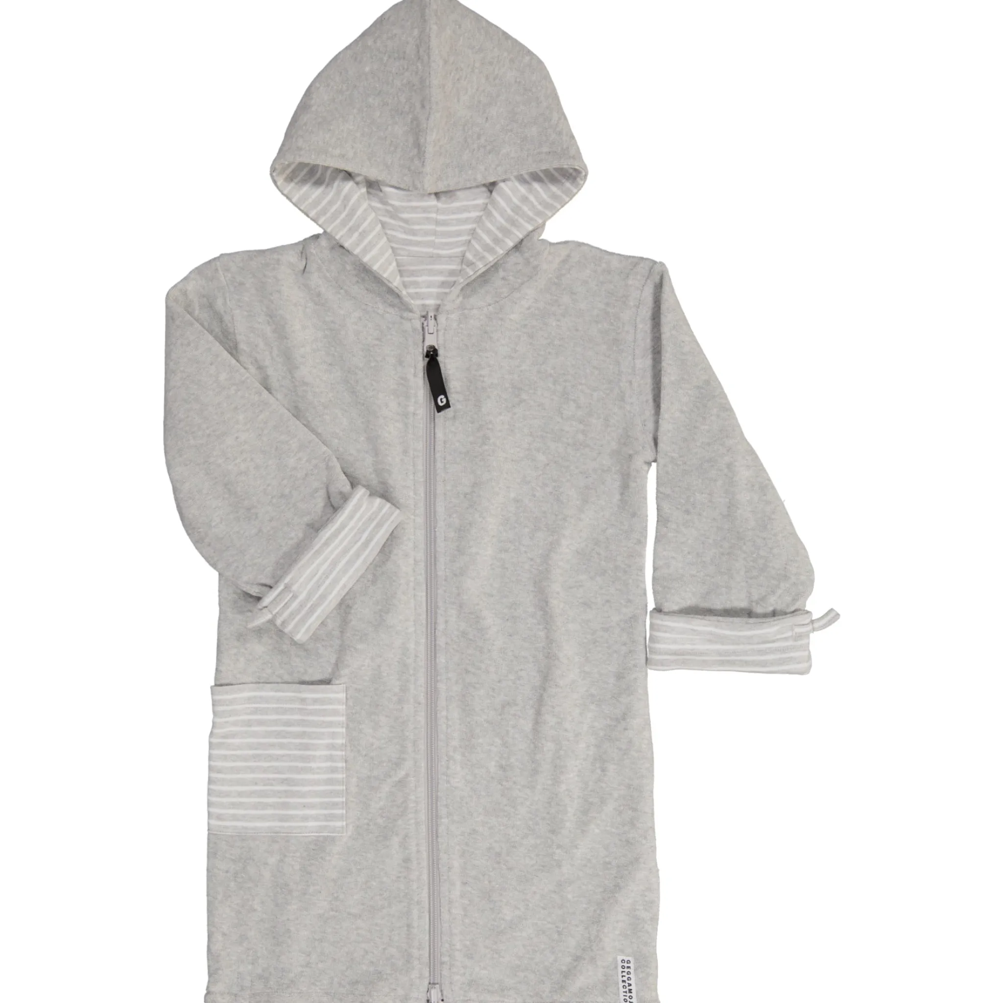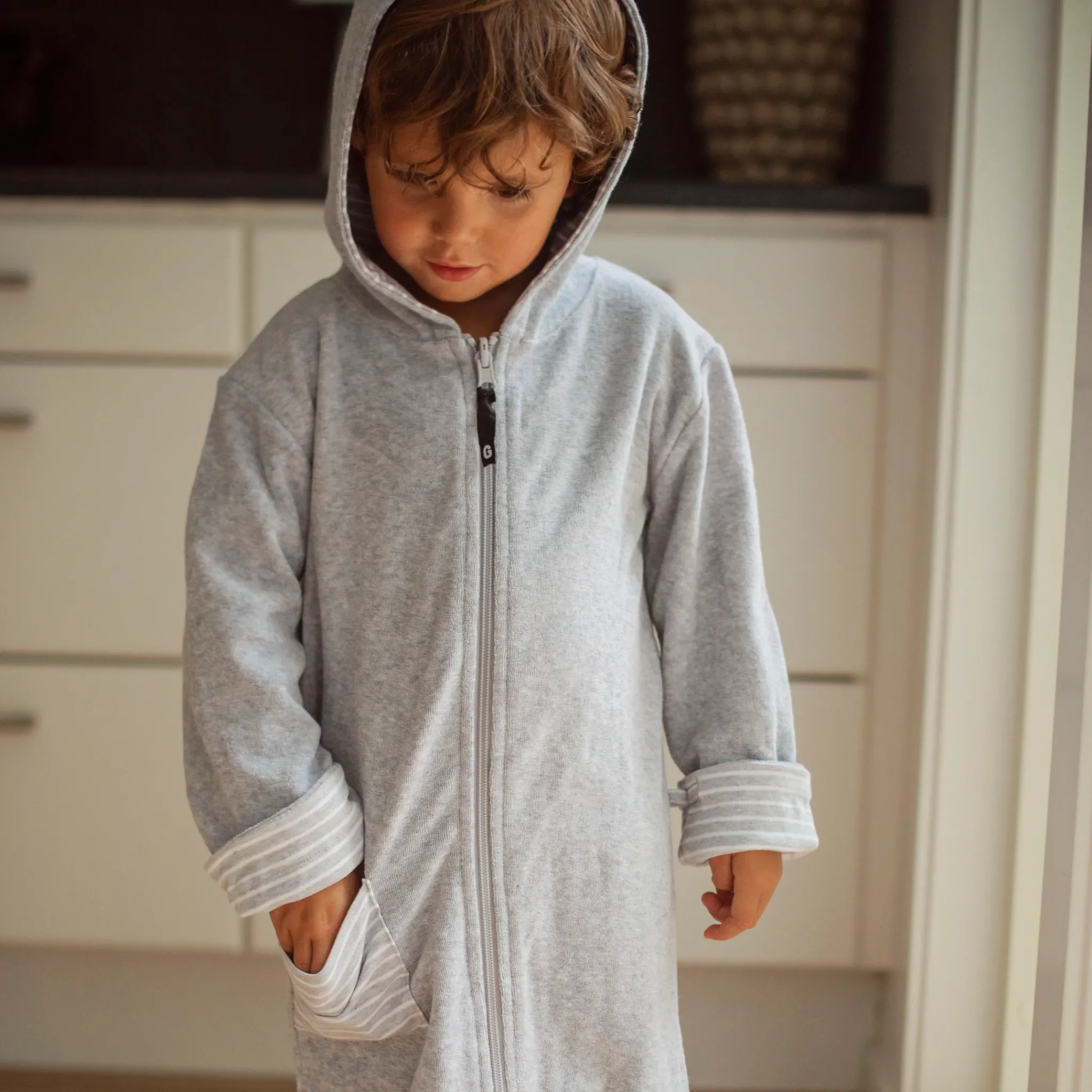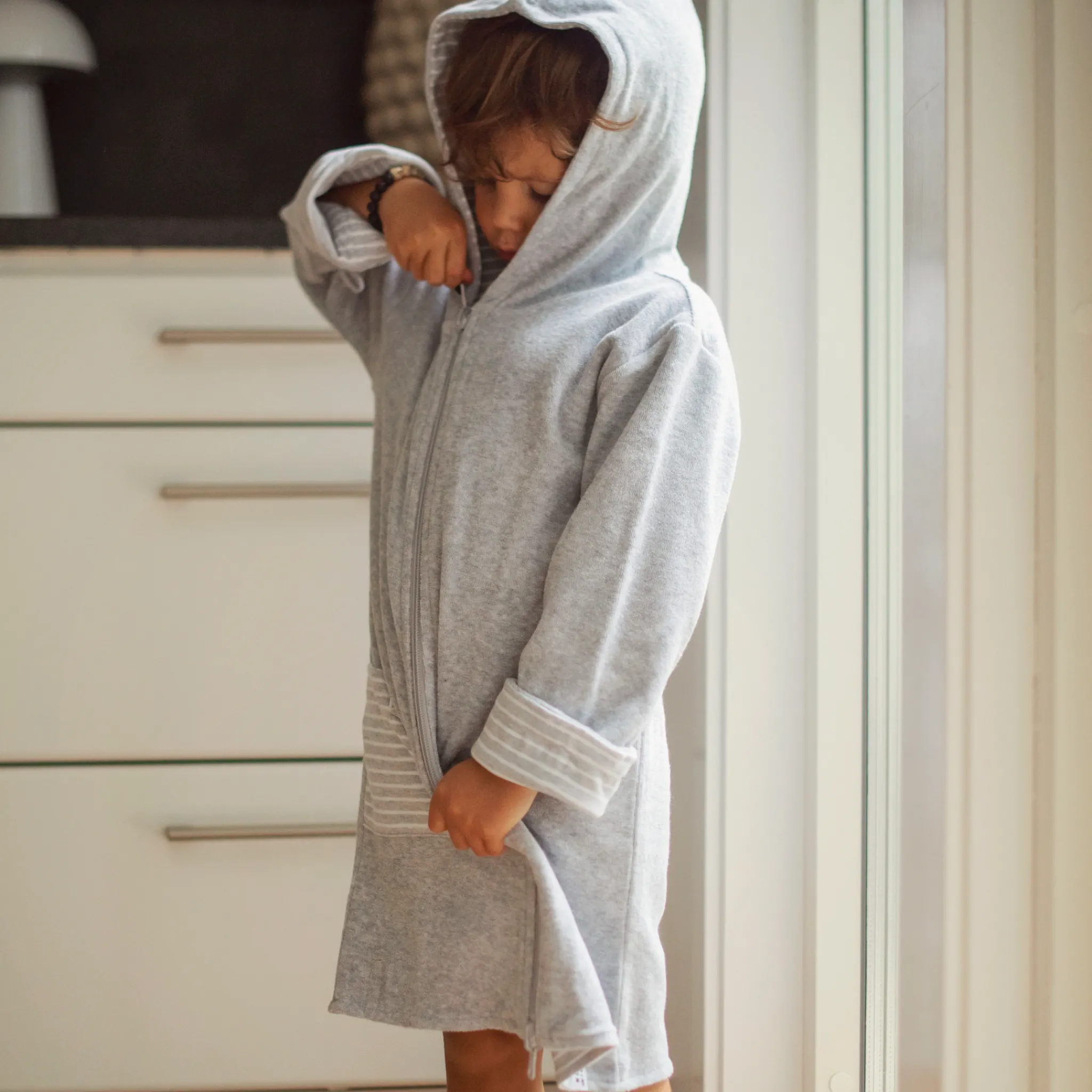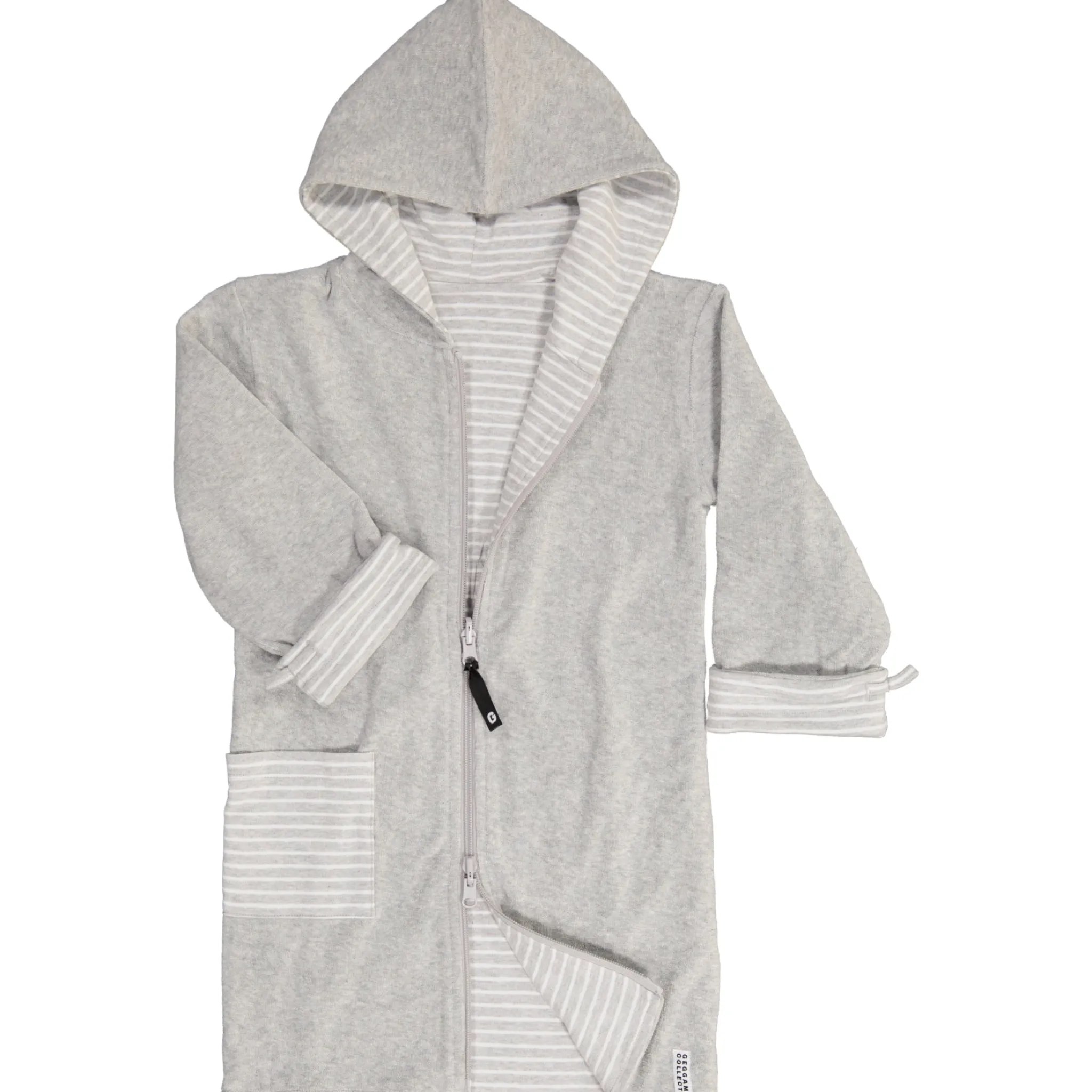 Bästa vändbara badrocken – här i grå frotte med ränder i gråmelerat och vitt. Med bästa ärmslutet som går att vika upp eller ner allteftersom barnet växer. Badrocken är vändbar, ena sidan randig interlock och andra sidan enfärgad frotte. Badrocken har blixtlås, så du slipper släpande skärp. Lika bekväm på stranden, badhuset som hemma.