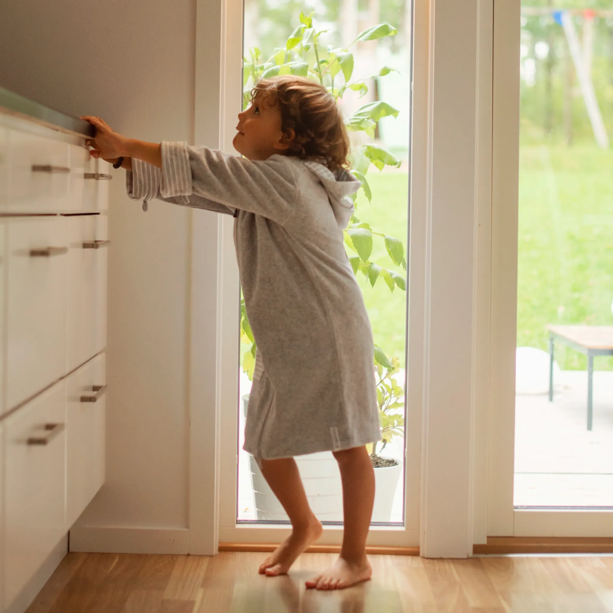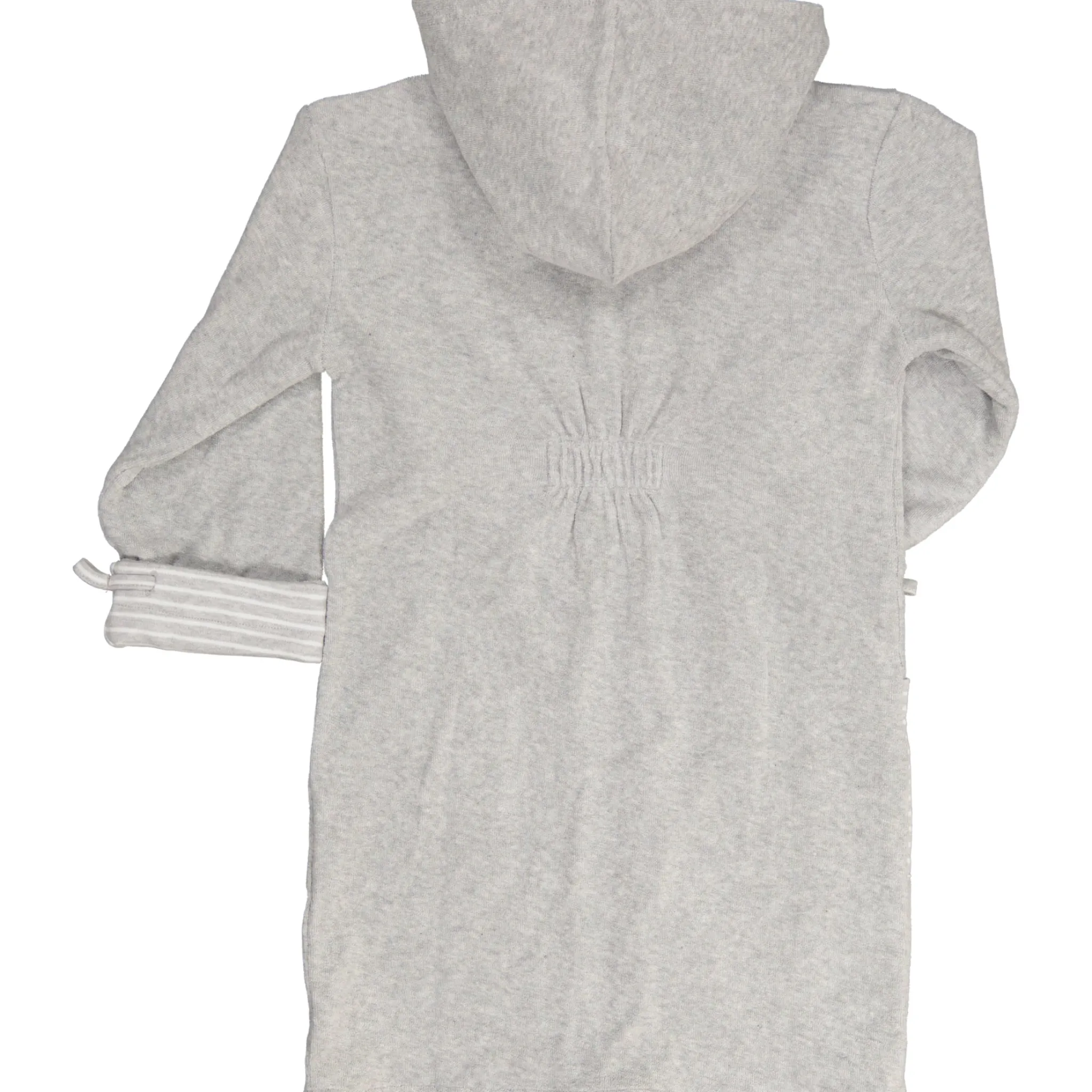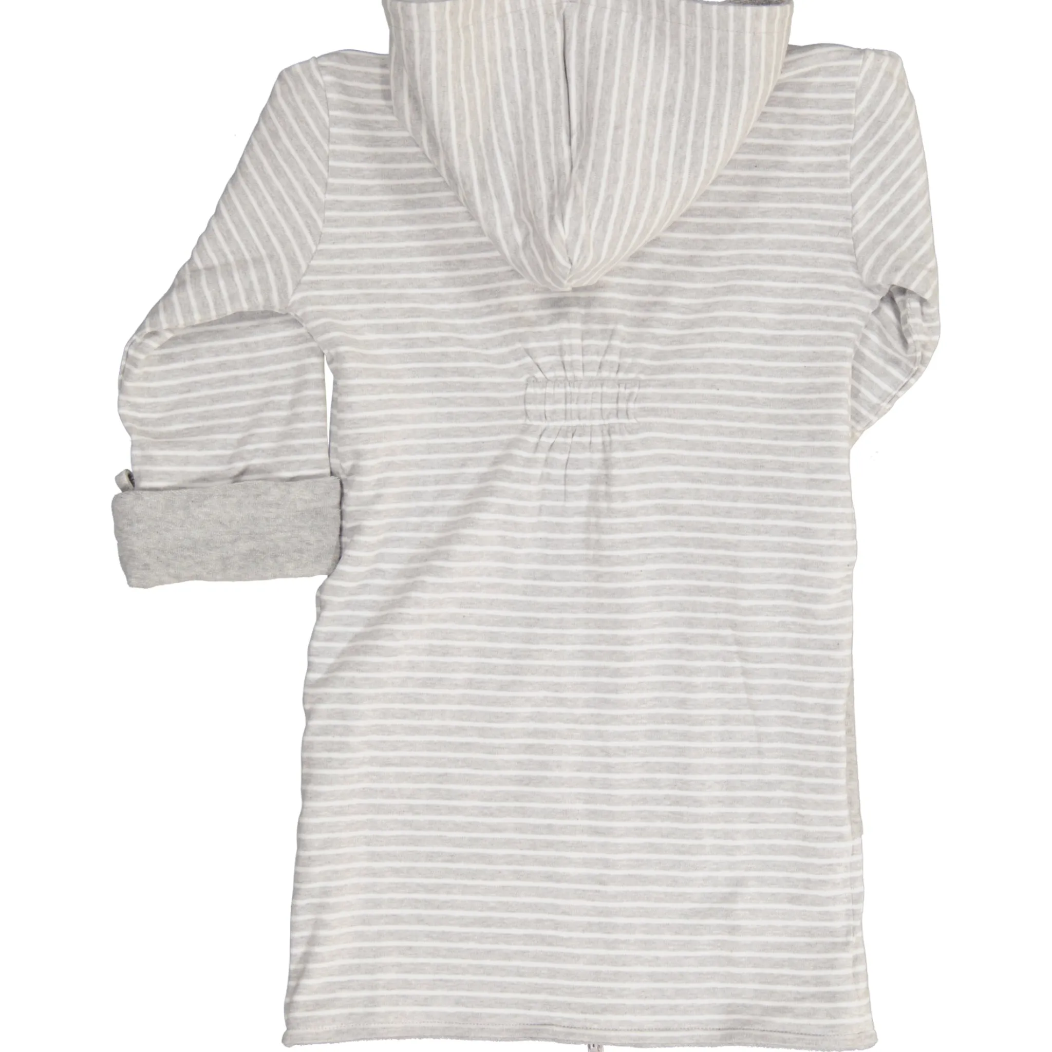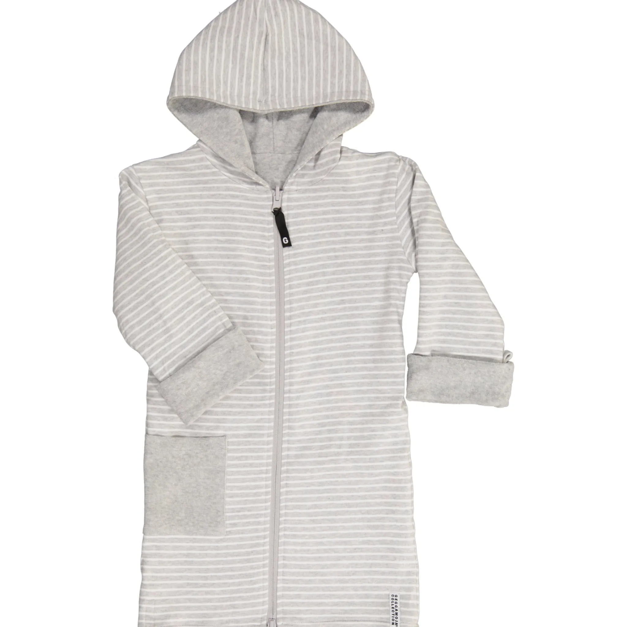 Bästa vändbara badrocken – här i grå frotte med ränder i gråmelerat och vitt. Med bästa ärmslutet som går att vika upp eller ner allteftersom barnet växer. Badrocken är vändbar, ena sidan randig interlock och andra sidan enfärgad frotte. Badrocken har blixtlås, så du slipper släpande skärp. Lika bekväm på stranden, badhuset som hemma.