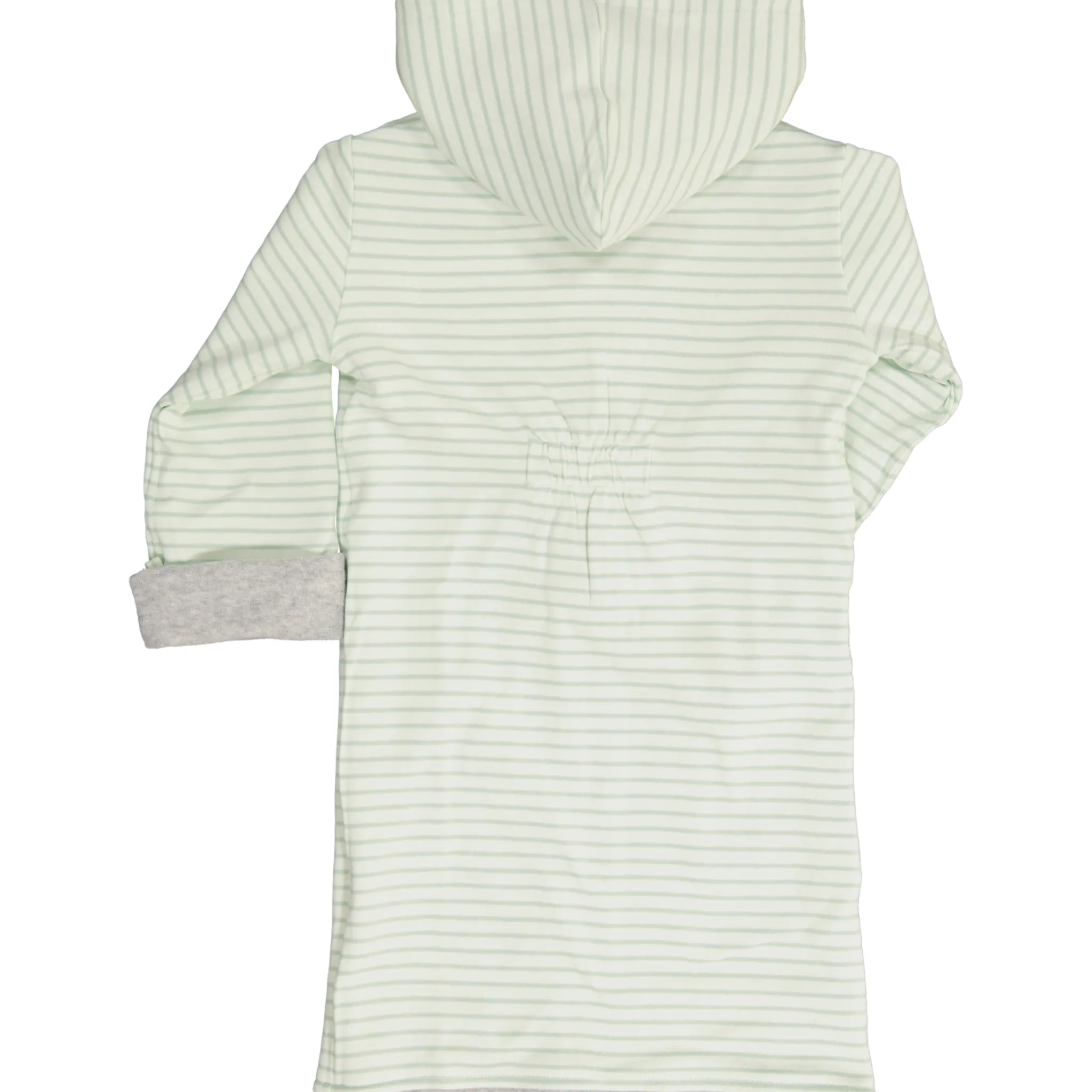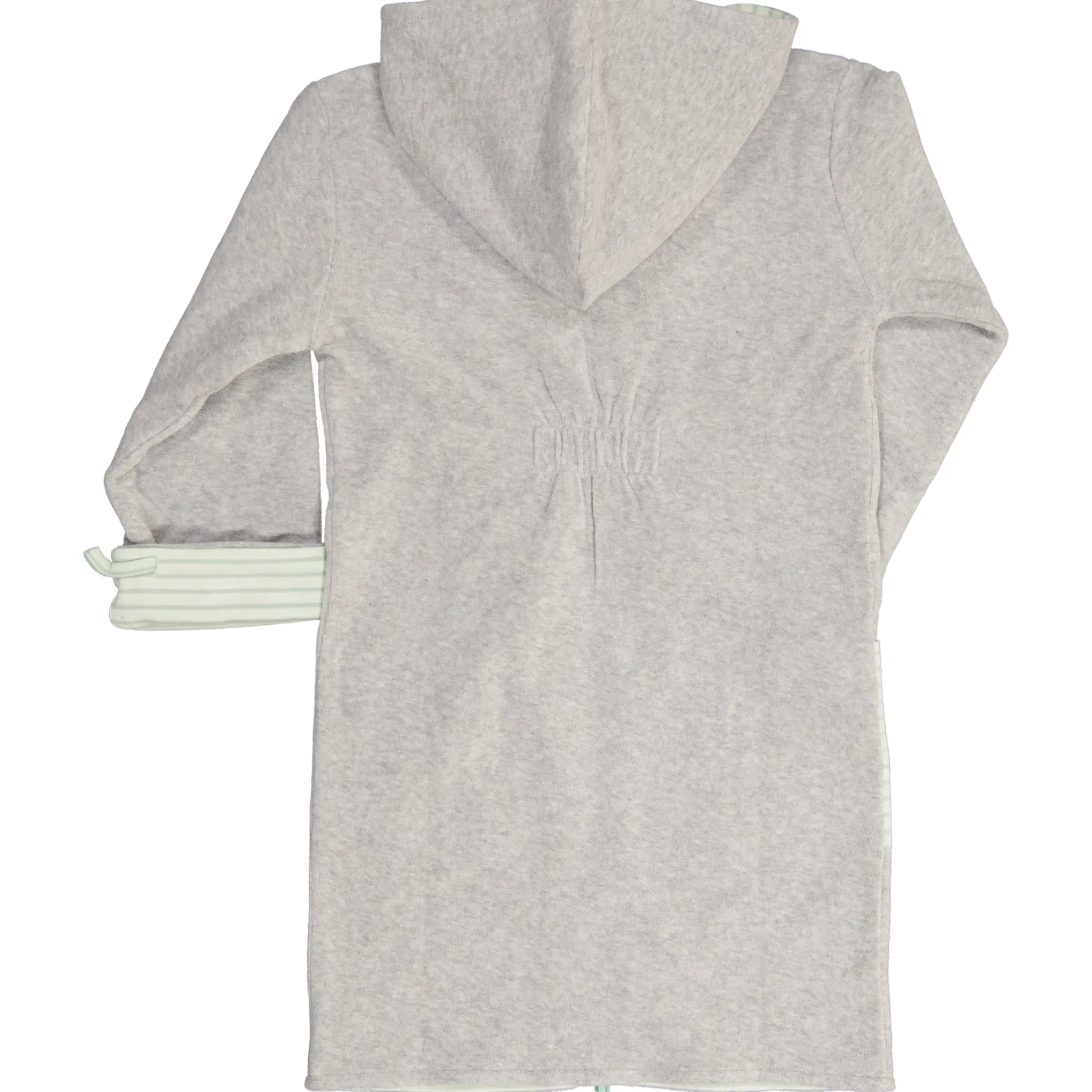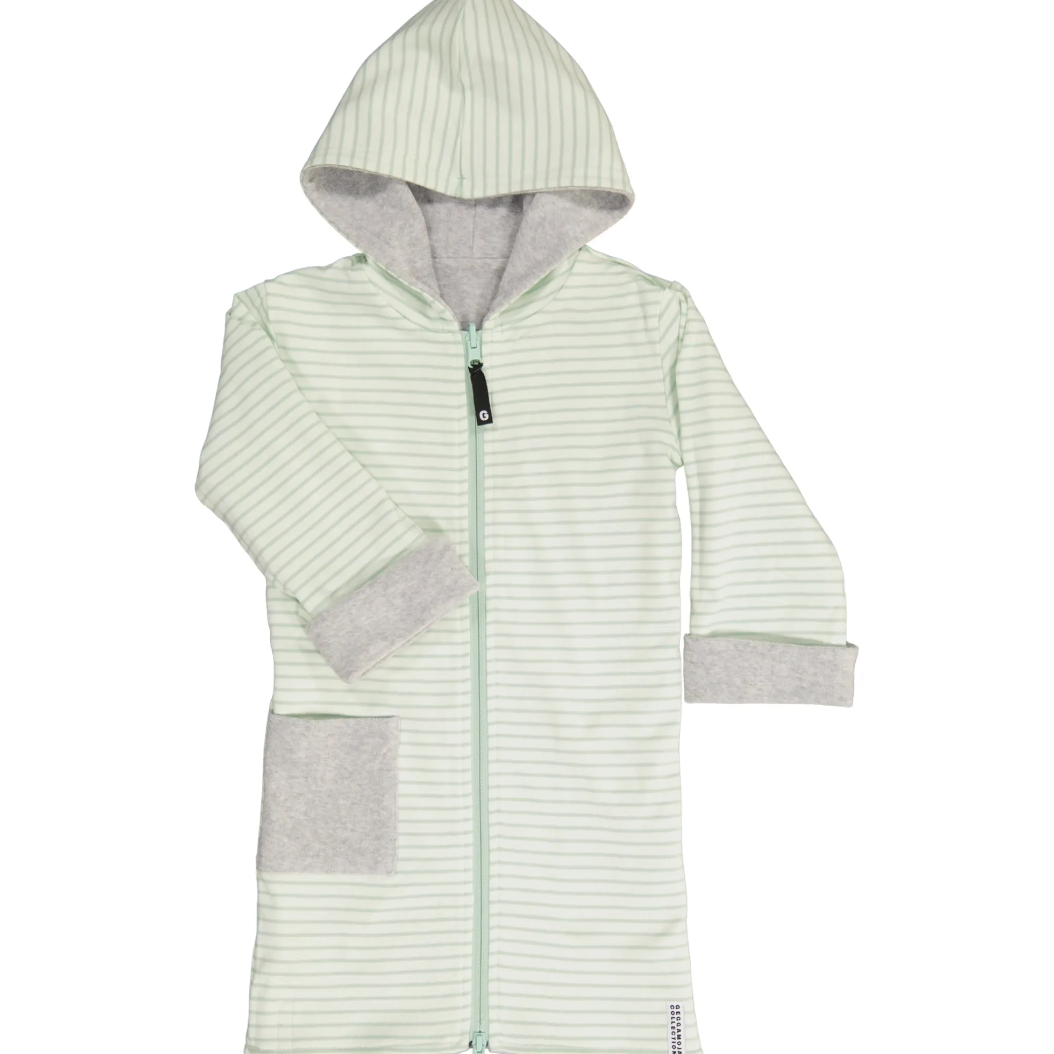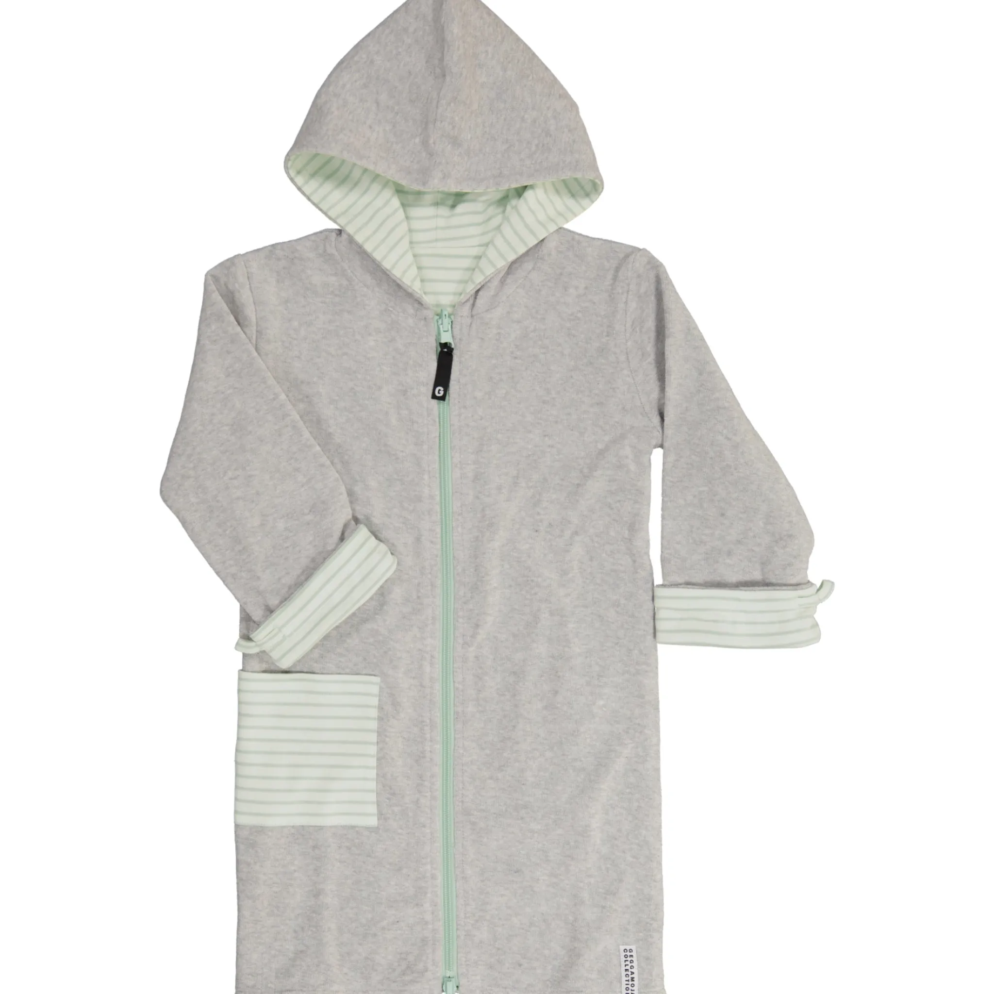 Bästa vändbara badrocken – här i grå frotte med ränder i grönt och vitt. Med bästa ärmslutet som går att vika upp eller ner allteftersom barnet växer. Badrocken är vändbar, ena sidan randig interlock och andra sidan enfärgad frotte. Badrocken har blixtlås, så du slipper släpande skärp. Lika bekväm på stranden, badhuset som hemma.
