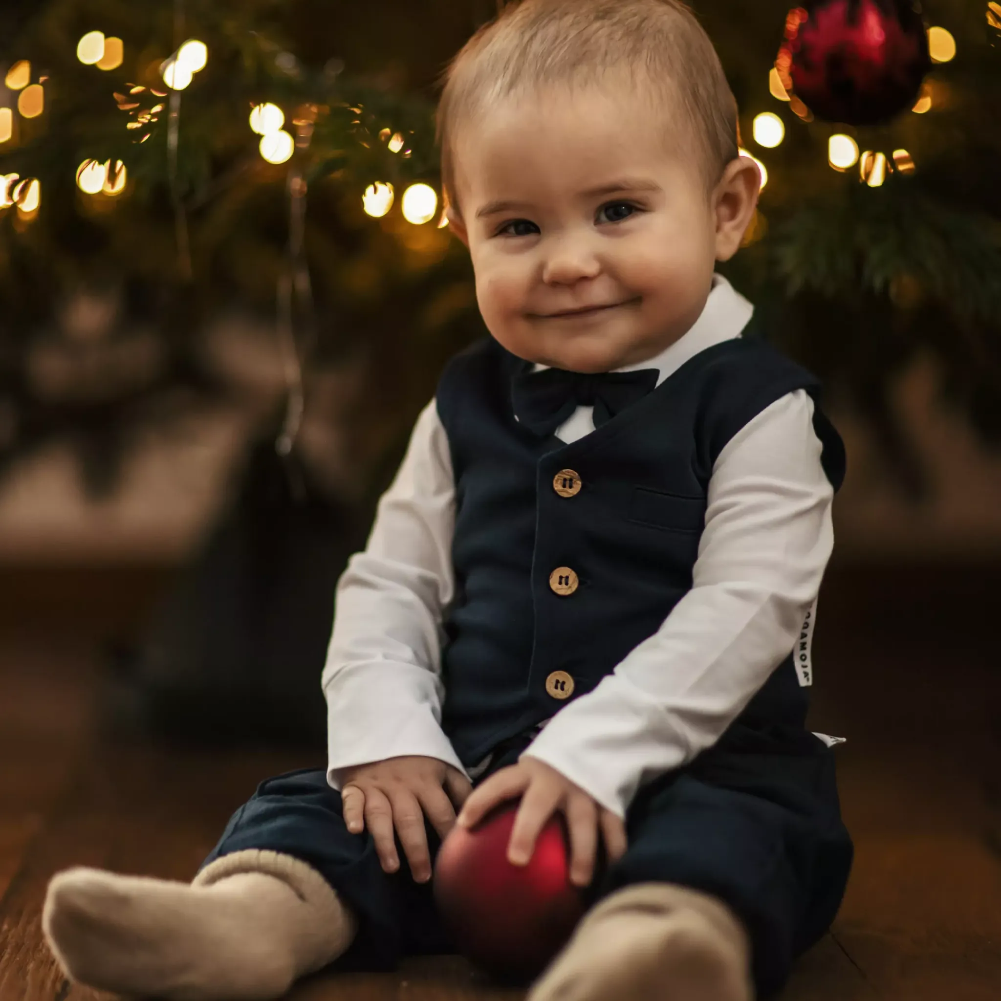 Till alla små festprissar. Vit body med krage och marinblå fluga med dekorativa knappar framtill.