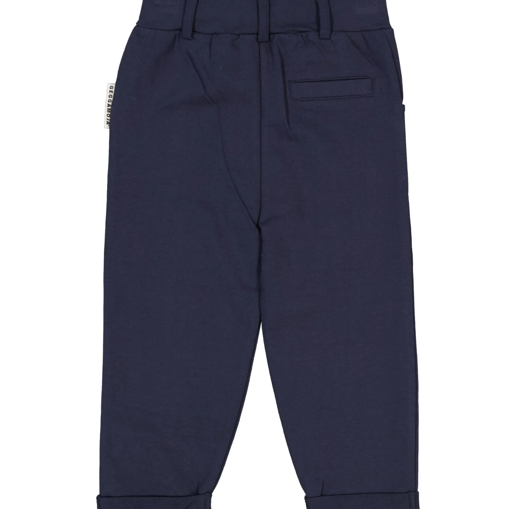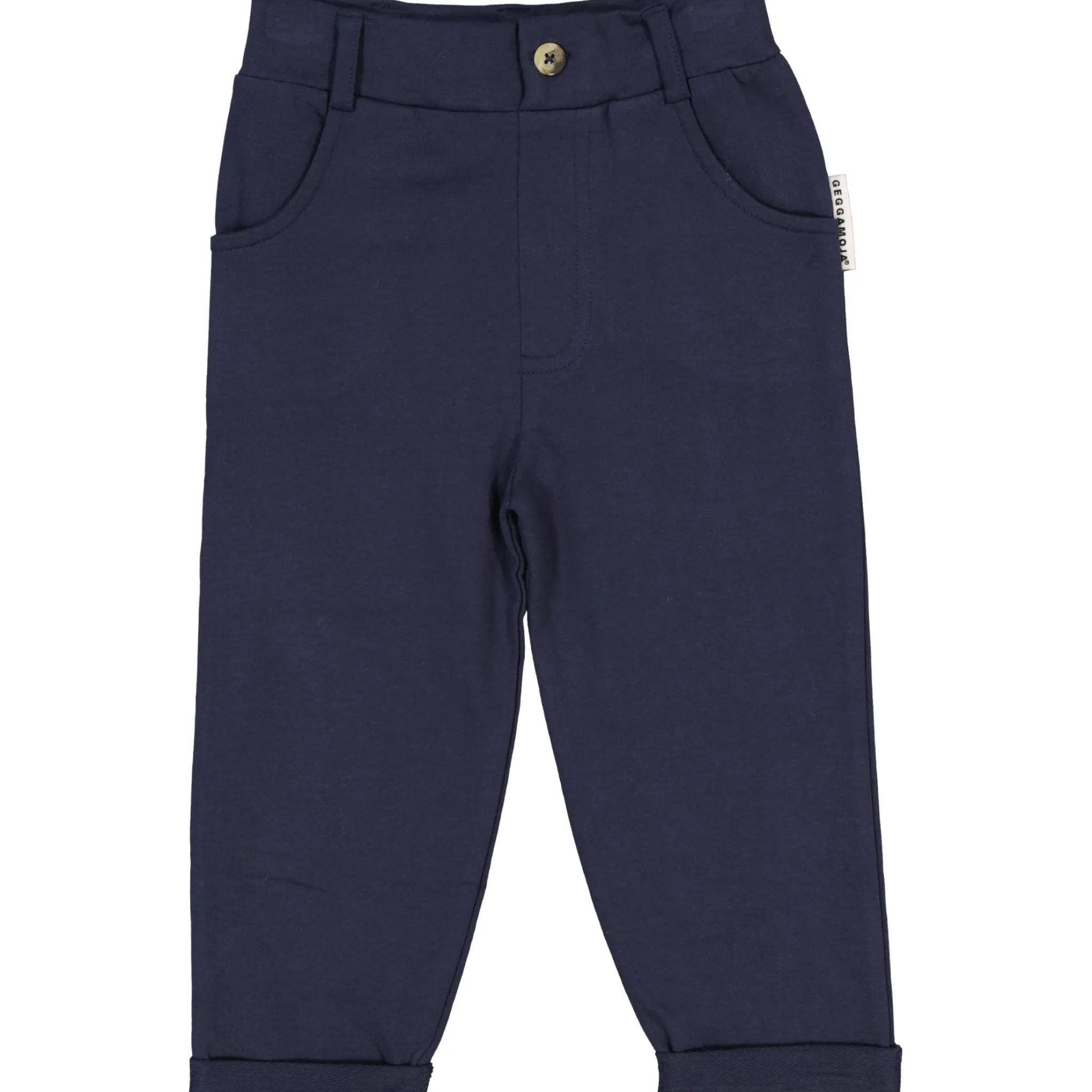 Mjuk collegebyxa i chino-modell. Fejkgylf och knapp fram. Tvår sidfickor och en bakficka (fejk på de minsta stl. Regelrbar resår i midjan.