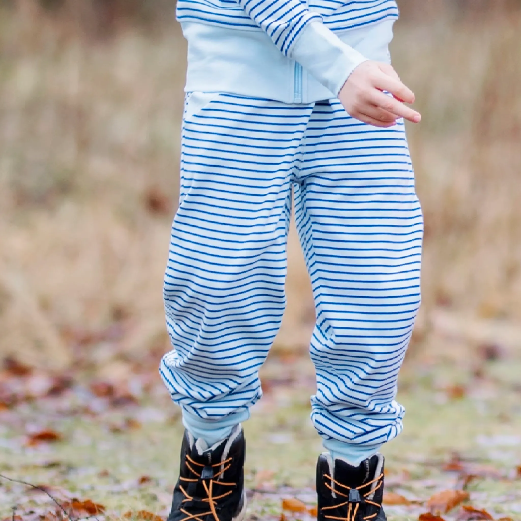 Mjukisbyxa i trikå. En klassisk Geggamojabyxa. Reglerbar resår i midjan och fejk-snodd.