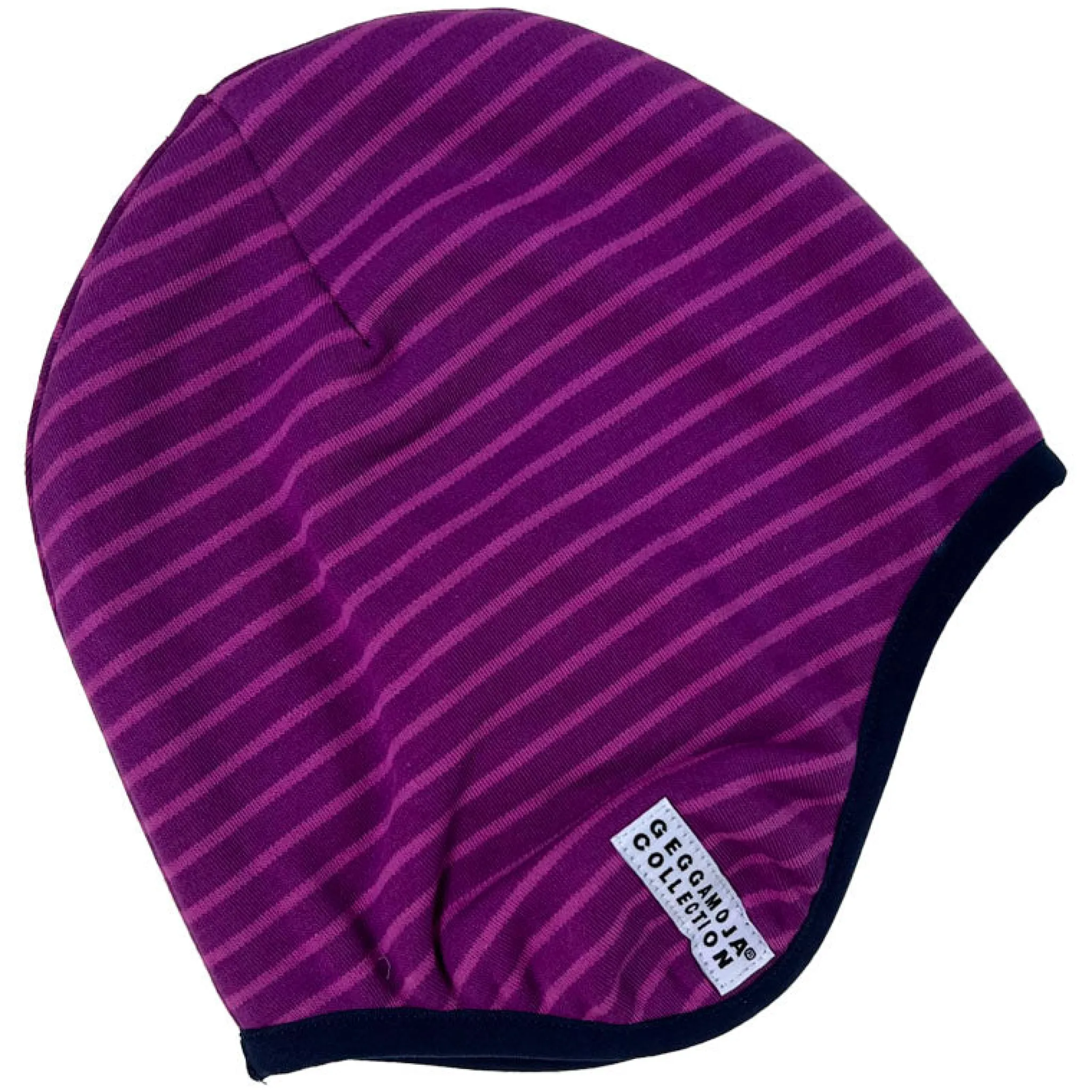 Äntligen tilllbaka! Den populära hjälmmössan som är fodrad med skön fleece. Den är i Geggamojas klassiska ränder i mörklila och lila. Öronlapparna värmer extra gott.