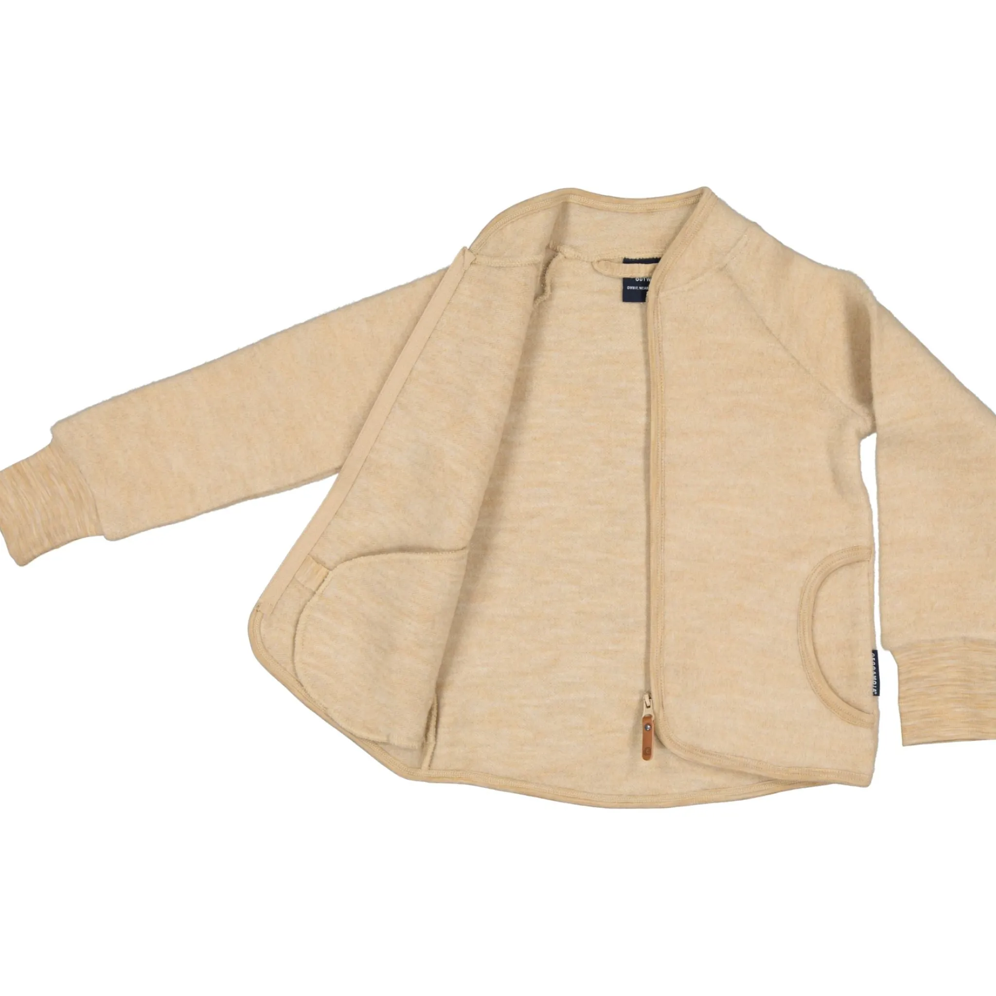 Mjuk och värmande ullfleecejacka i 100 % merinoull – perfekt för kyliga dagar. Jackan har ett praktiskt blixtlås framtill som gör den enkel att ta av och på. Merinoullen hjälper till att reglera kroppstemperaturen naturligt och håller barnet varmt även när det är fuktigt.