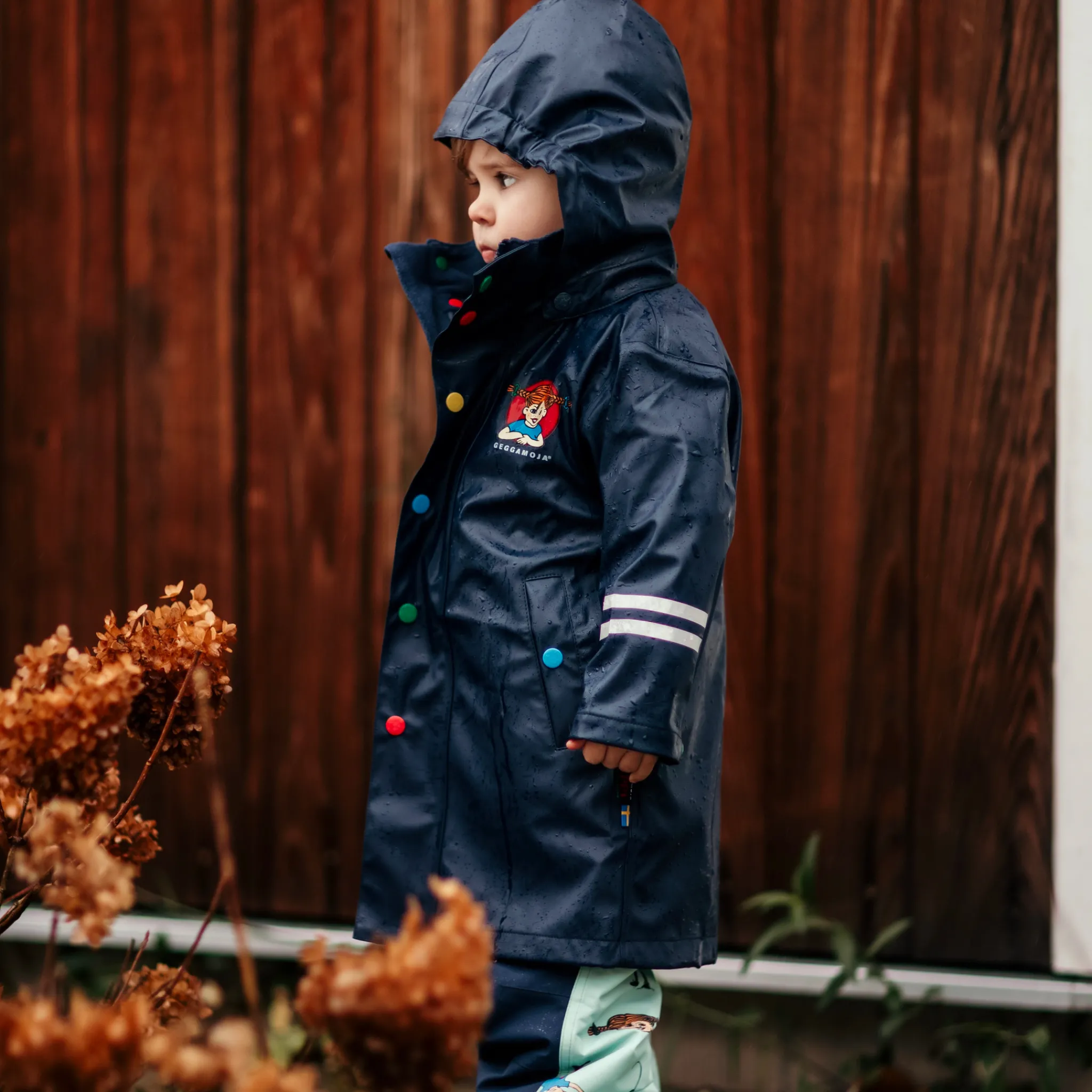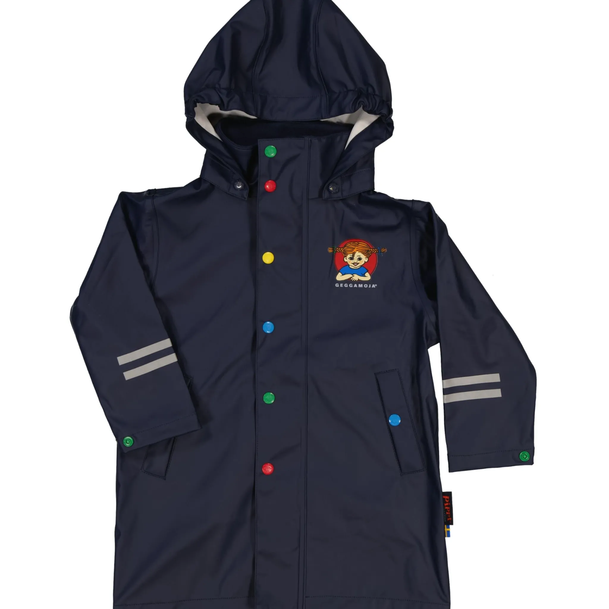 Med ett fint Pippi-märke, färgglada knappar och praktiska fickor är den lika rolig som den är funktionell. Den avtagbara luvan ger extra flexibilitet, och tack vare gott om reflexer syns barnet även när det skymmer.