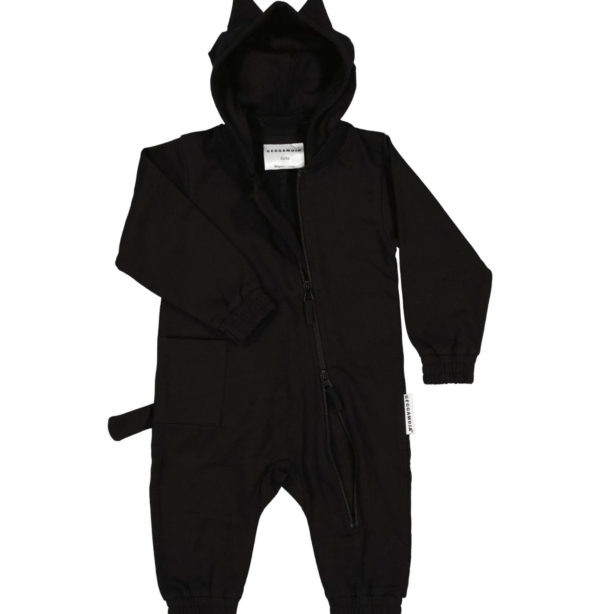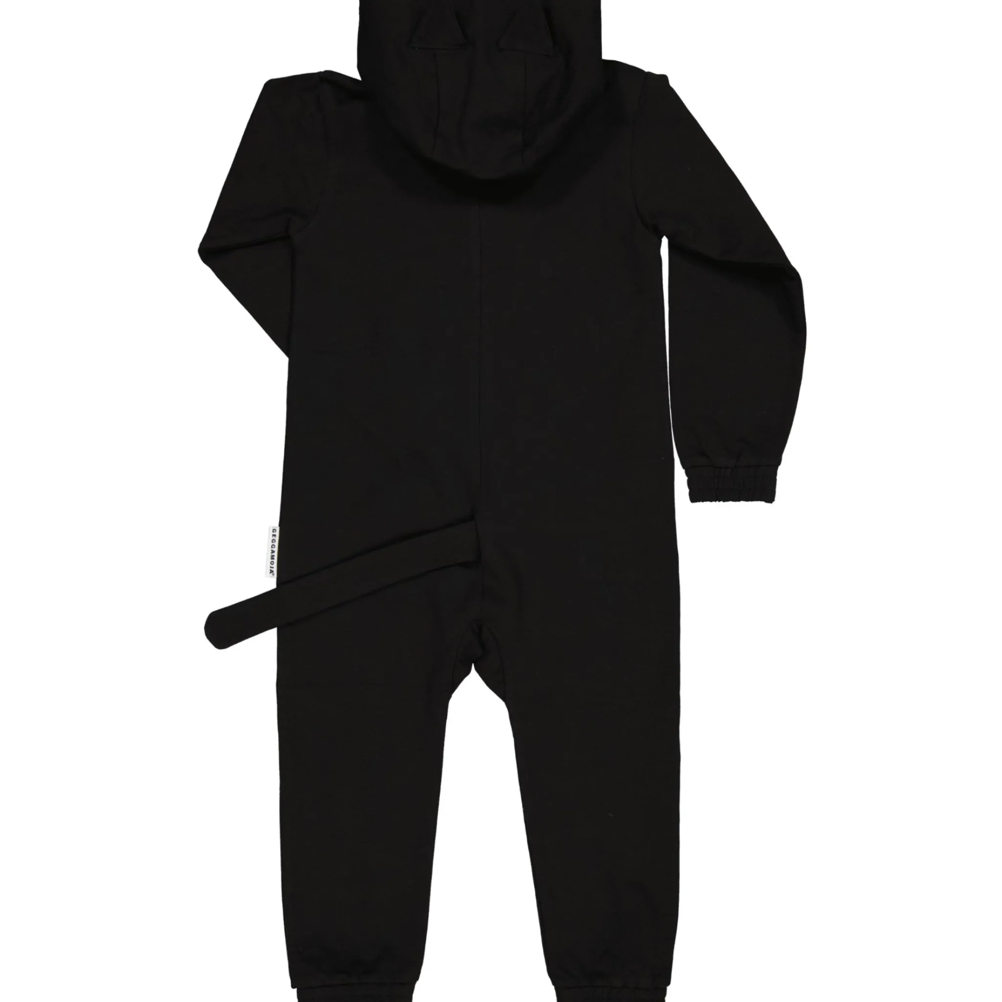 Jumpsuit i collegetyg med en gullig svans baktill. Avtagbar luva med kattöron.