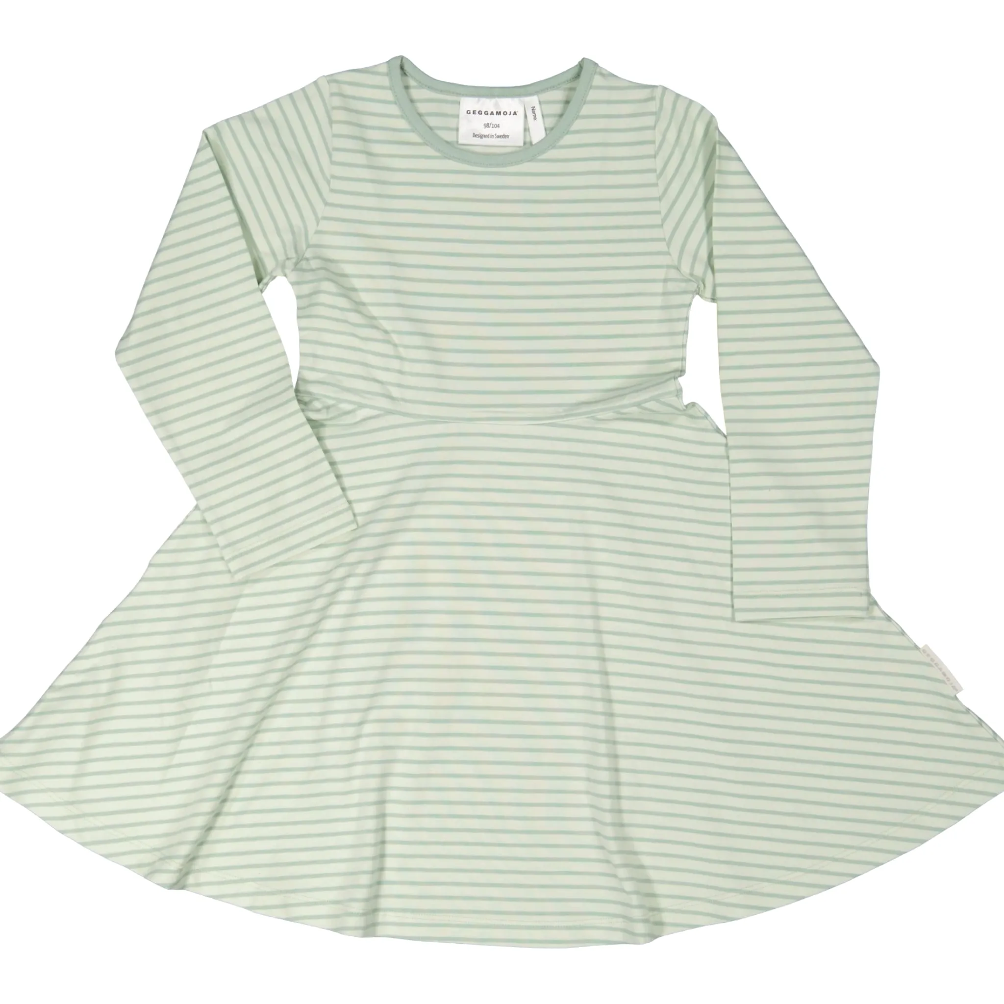 Långärmad snurrklänning i gröna ränder. En klassisk favorit i garderoben hos många Geggamojakunder. I de två minsta storlekarna 50/56 och 62/68 har den en insydd body.