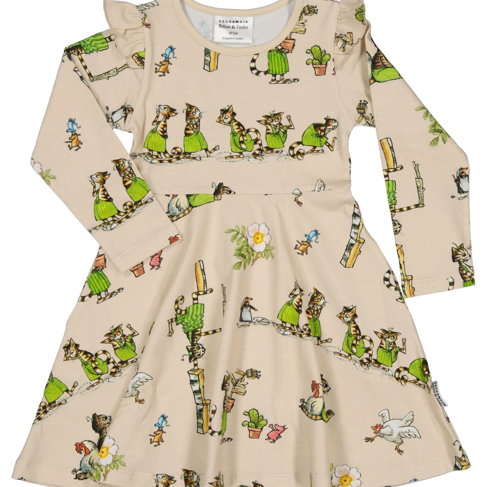 Klänning med lång ärm. Volang framtill. Vid kjoldel.