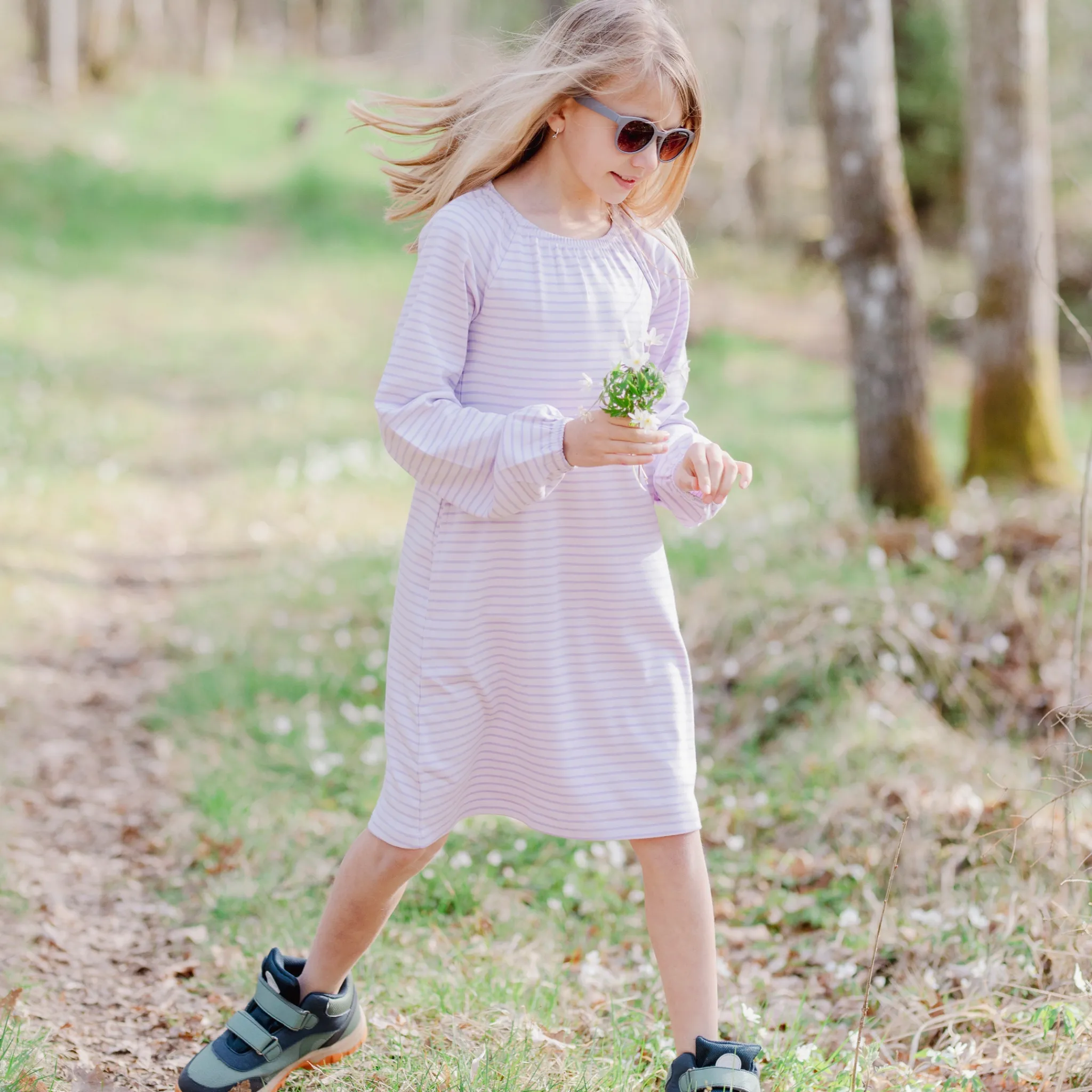 Långärmad klänning med singoalla -ärm i ekologisk bomull. En klassisk favorit i garderoben hos många Geggamojakunder. Singoallaklänningen är praktisk året runt och har en insydd body i storlekarna 50/56 och 62/68.