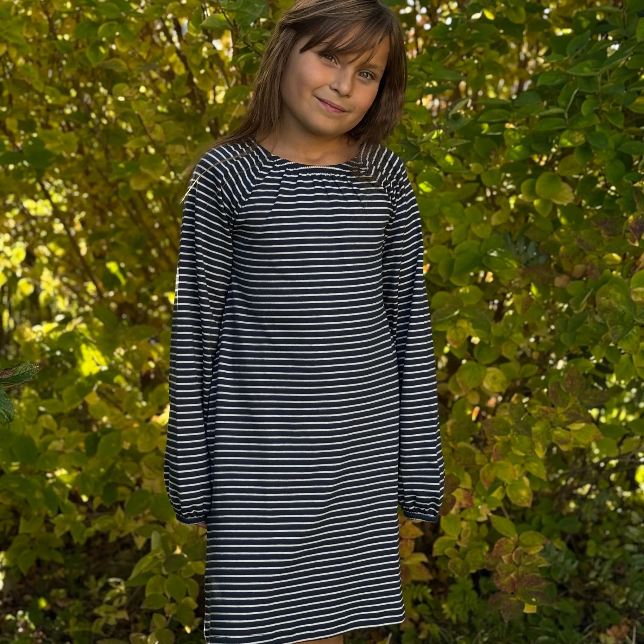 Långärmad klänning med singoalla -ärm i ekologisk bomull. En klassisk favorit i garderoben hos många Geggamojakunder. Singoallaklänningen är praktisk året runt och har en insydd body i storlekarna 50/56 och 62/68.