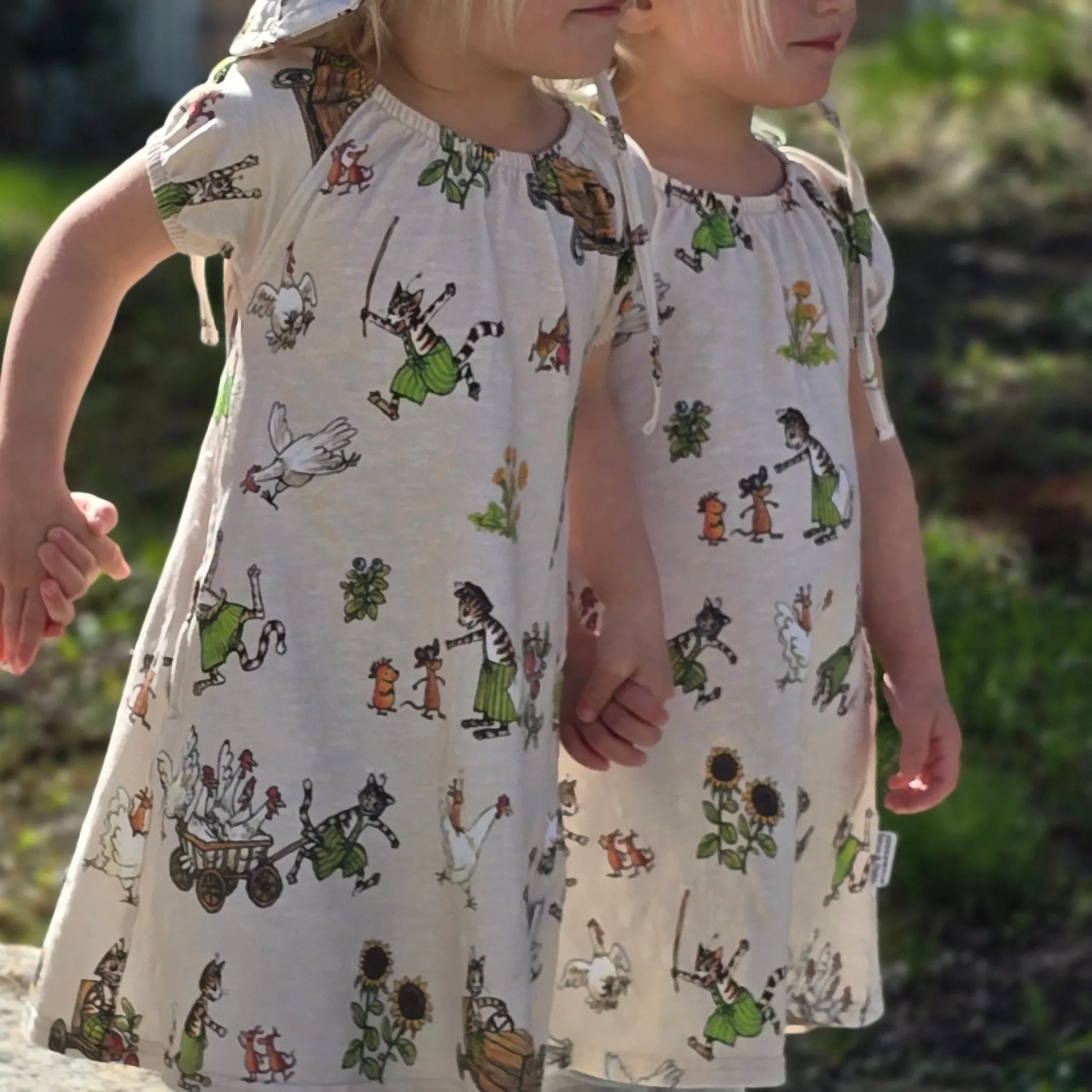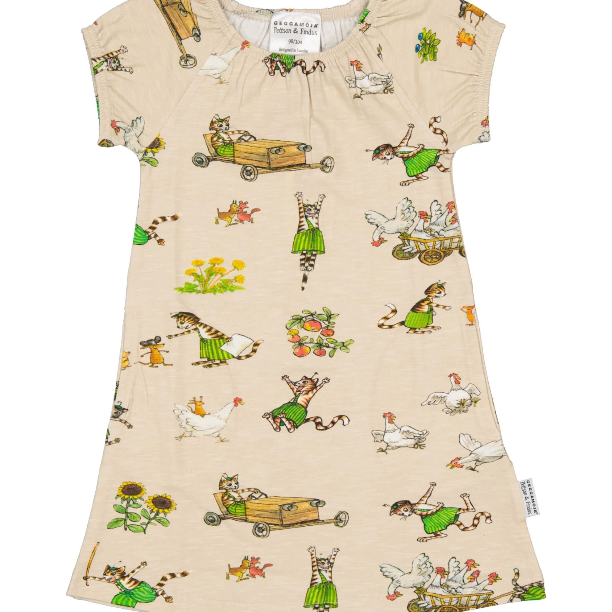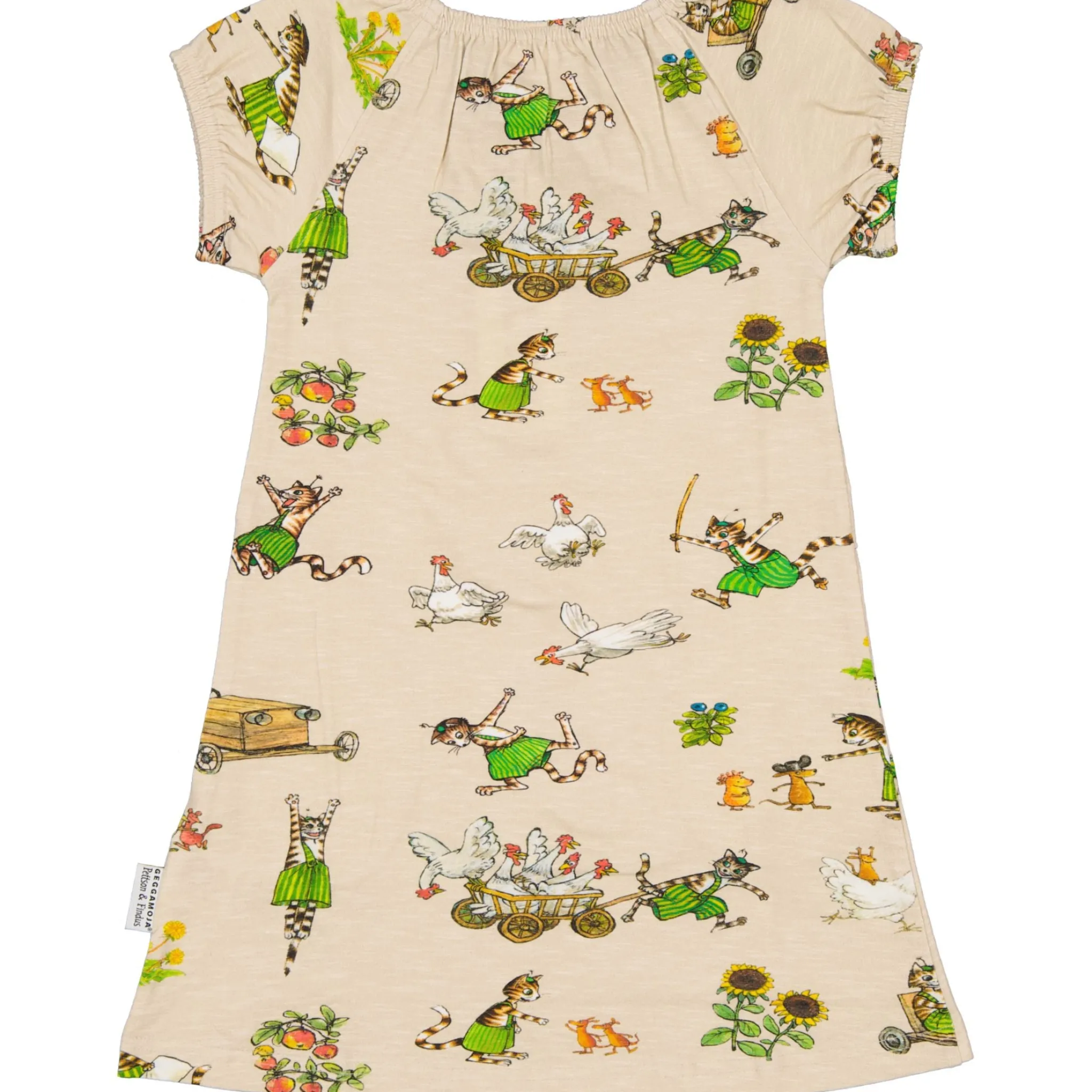 Sval och skön klänninga i singoallamodell. Klänningen är i Ekologisk bomulls-slub med Pettson & Findus print. Den har två fickor i sidorna som rymmer många hemligheter.