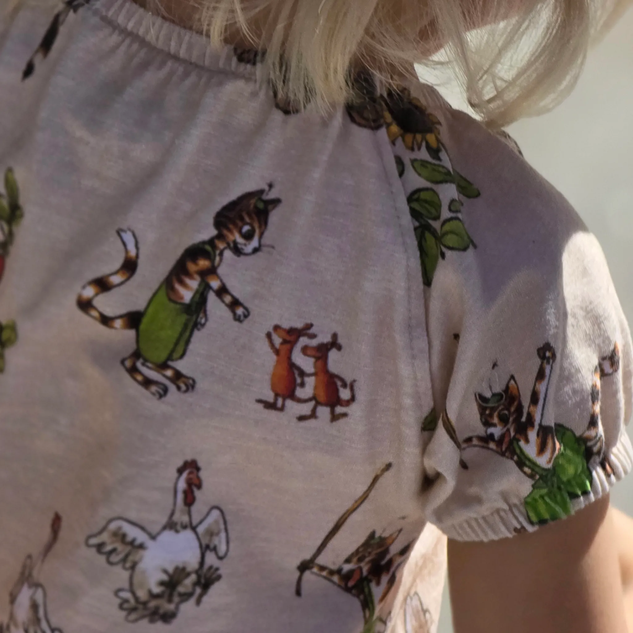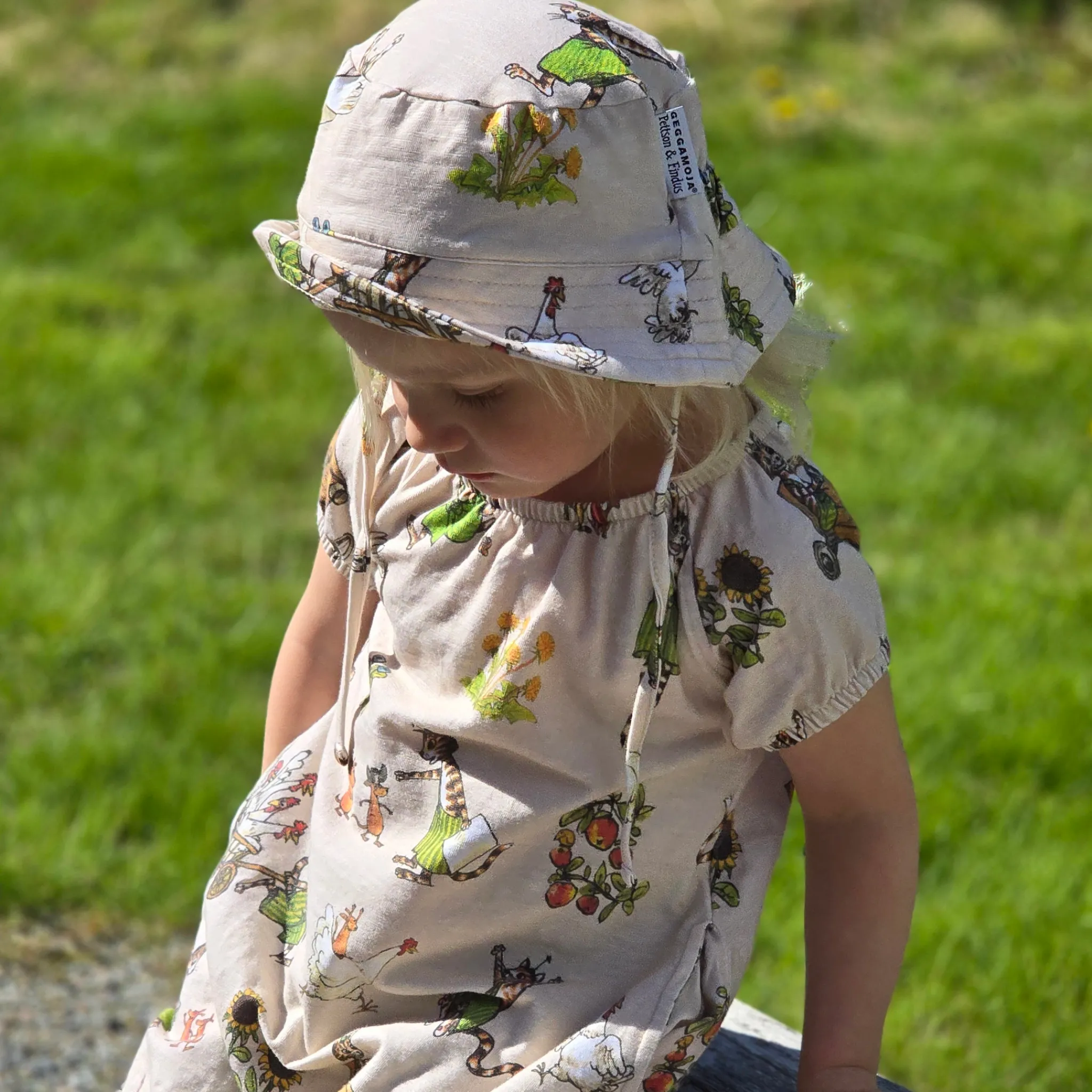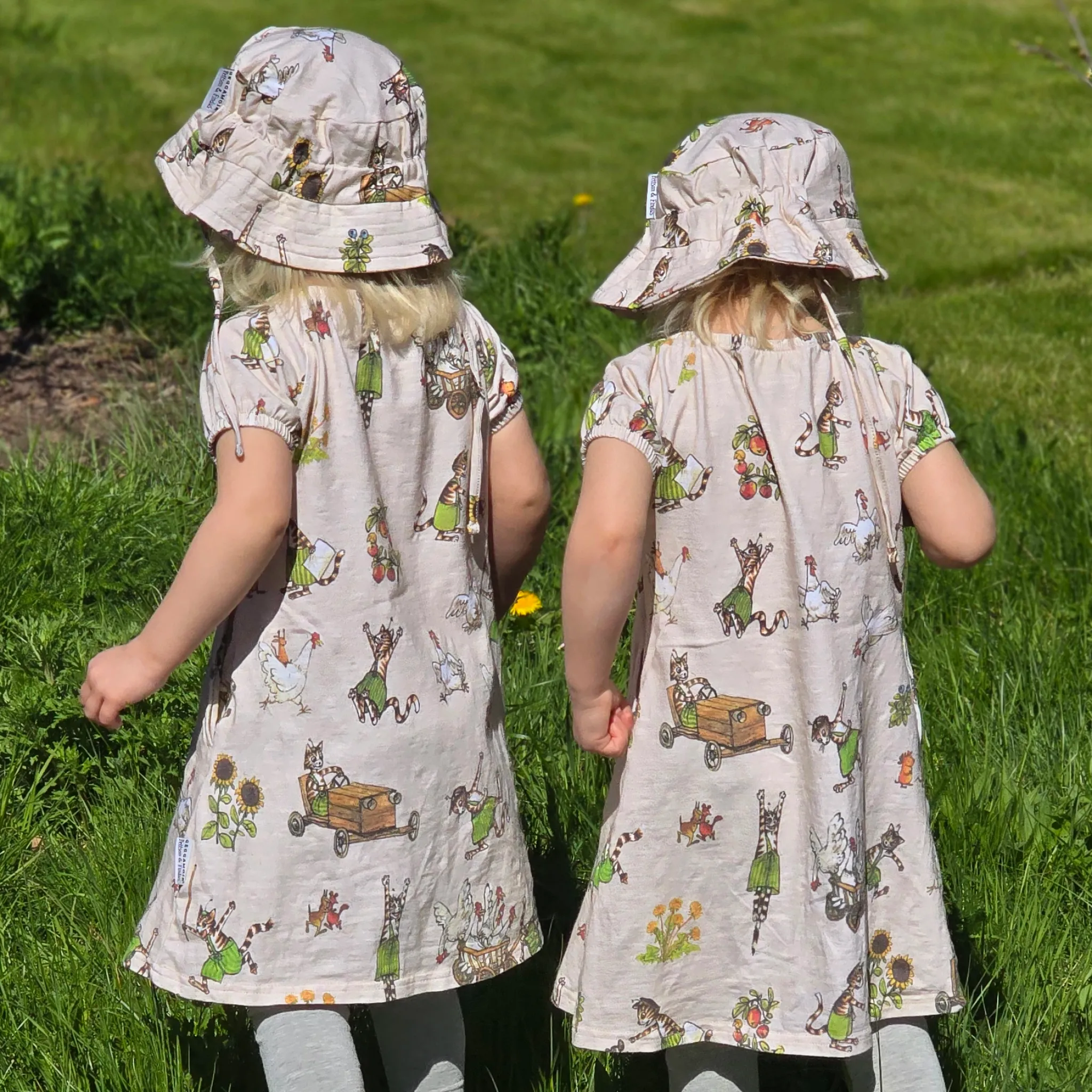 Sval och skön klänninga i singoallamodell. Klänningen är i Ekologisk bomulls-slub med Pettson & Findus print. Den har två fickor i sidorna som rymmer många hemligheter.