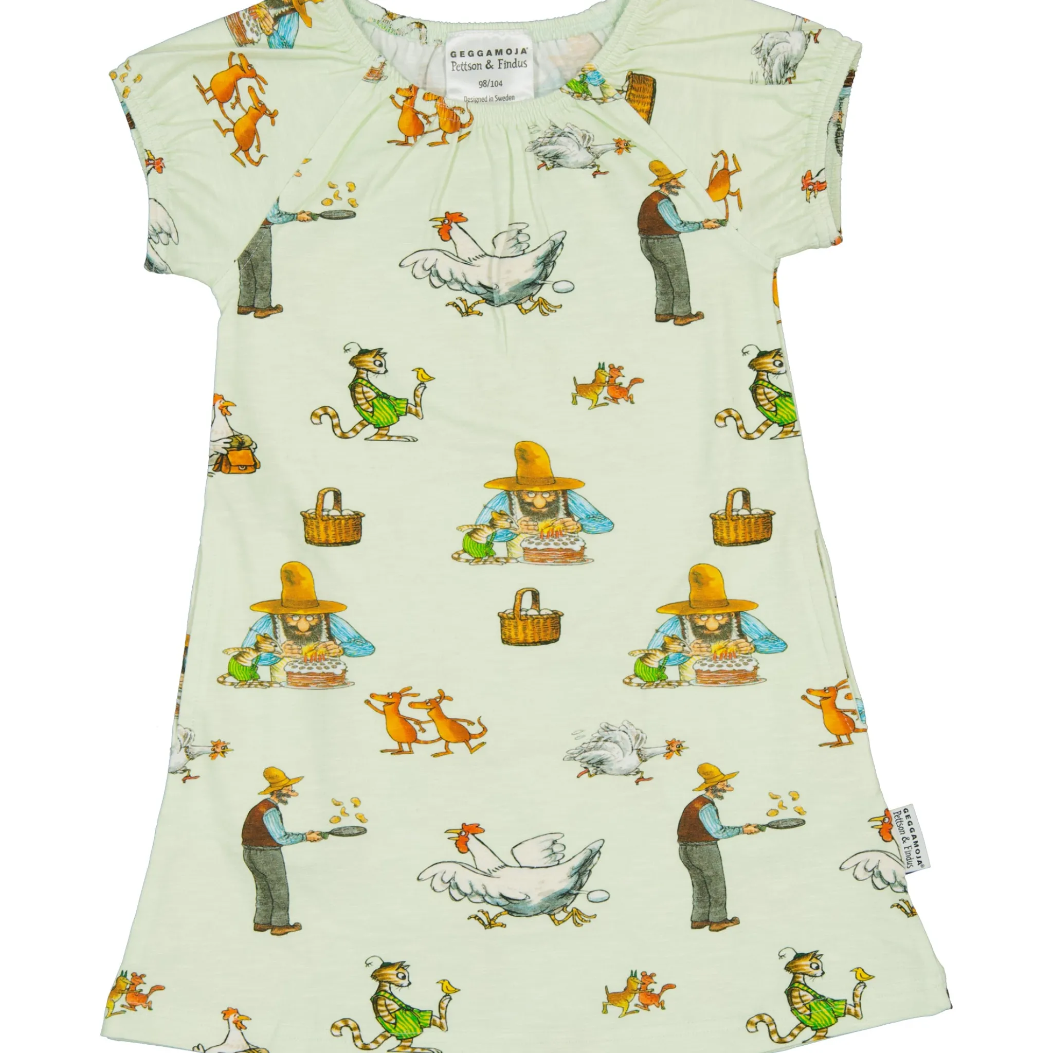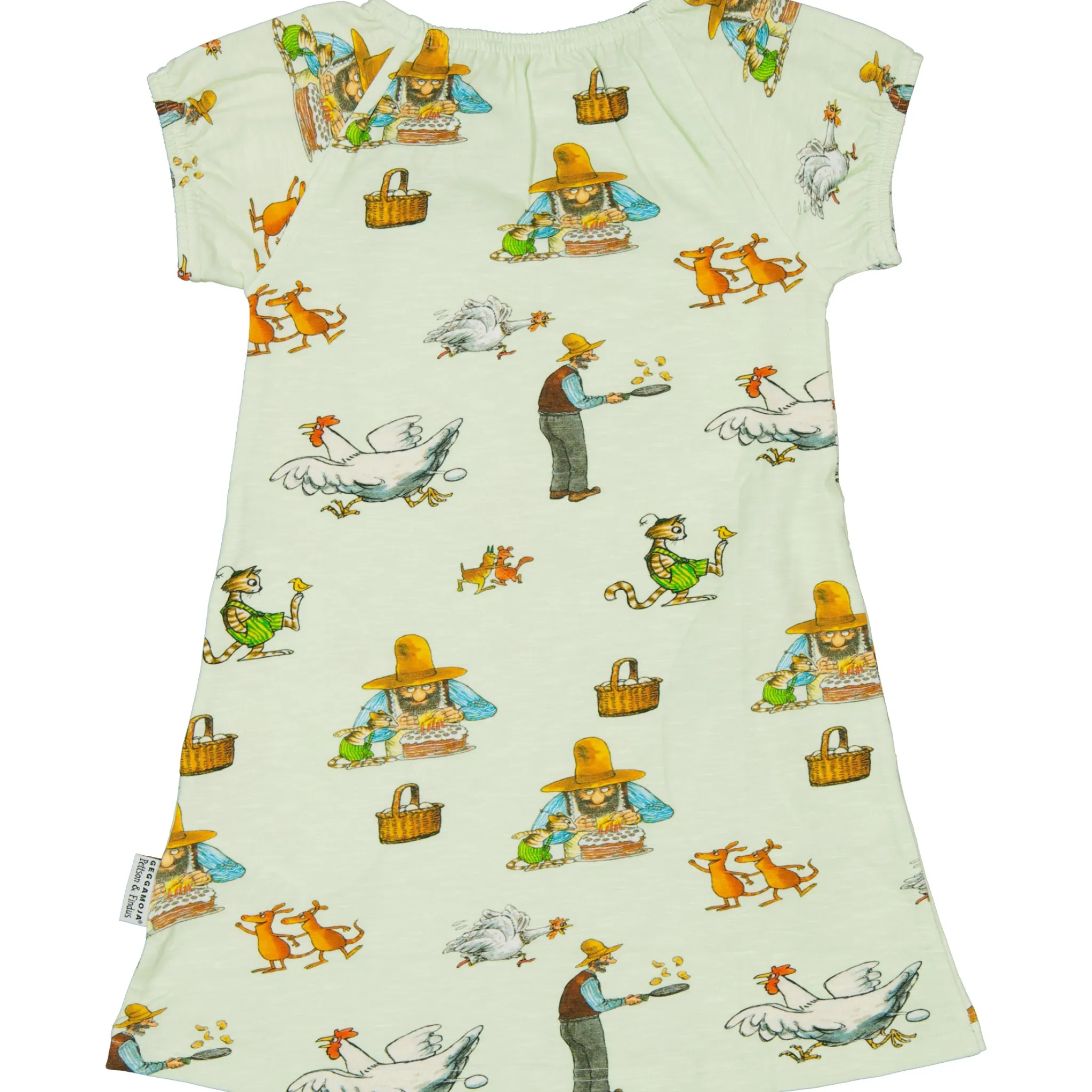 Sval och skön klänninga i singoallamodell. Klänningen är i Ekologisk bomulls-slub med Pettson & Findus print. Den har två fickor i sidorna som rymmer många hemligheter.