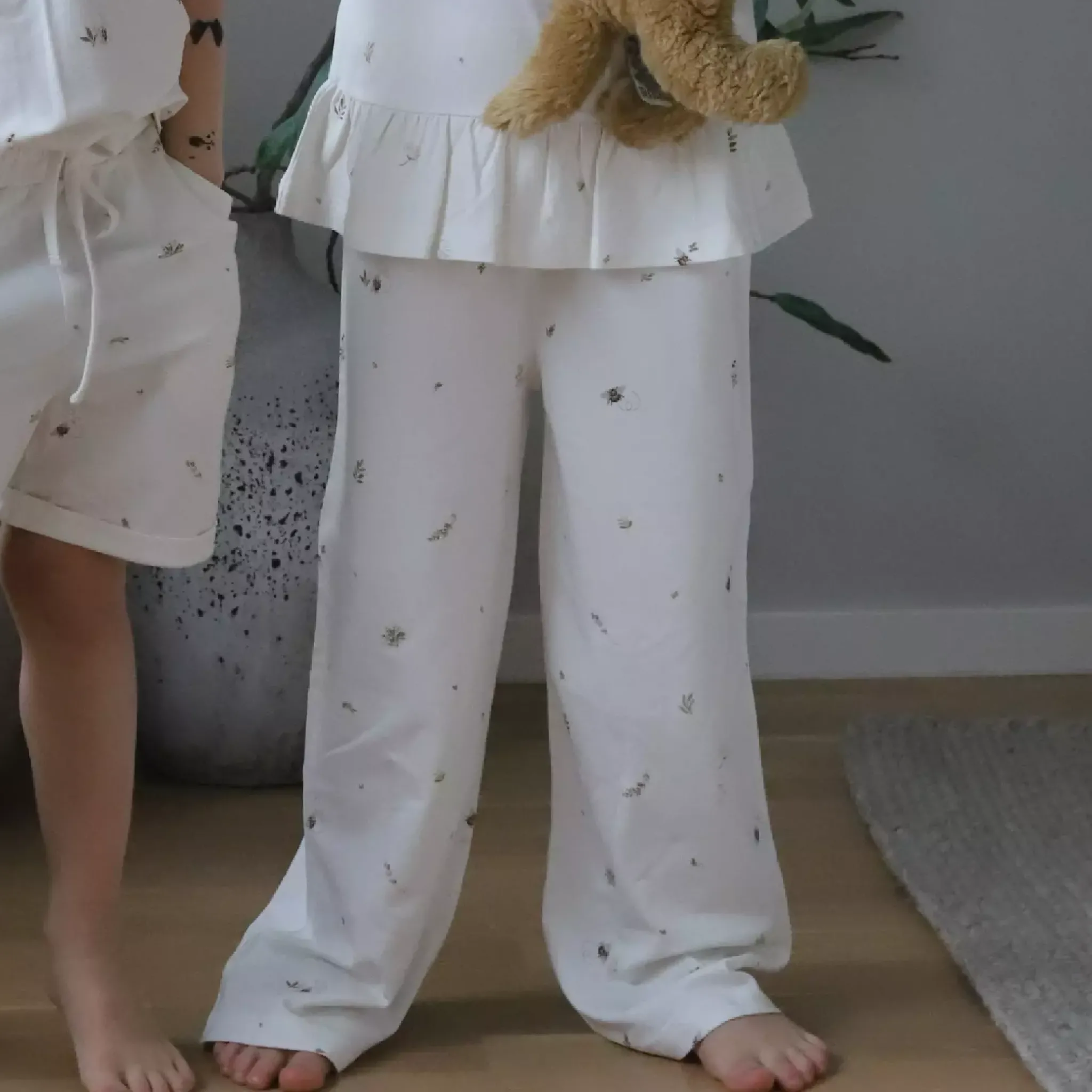 Mjuka vida byxor i bambu. Bambu är ett miljövänligt materialval, det odlas helt organiskt utan bekämpningsmedel och är 100 % biologiskt nedbrytbart. Bambu är lent och bekvämt mot huden och tillåter huden att andas. Reglerbar resår i midjan.