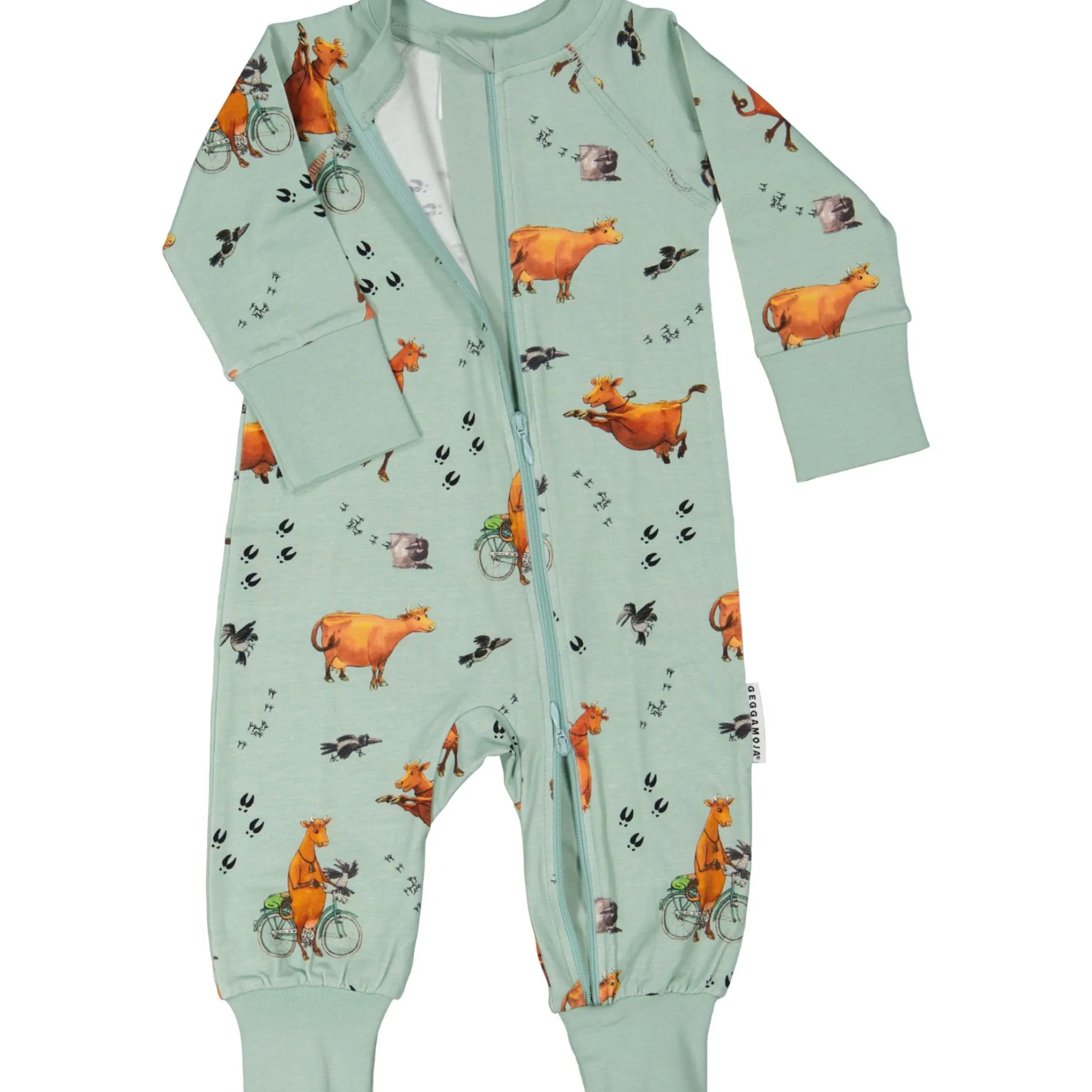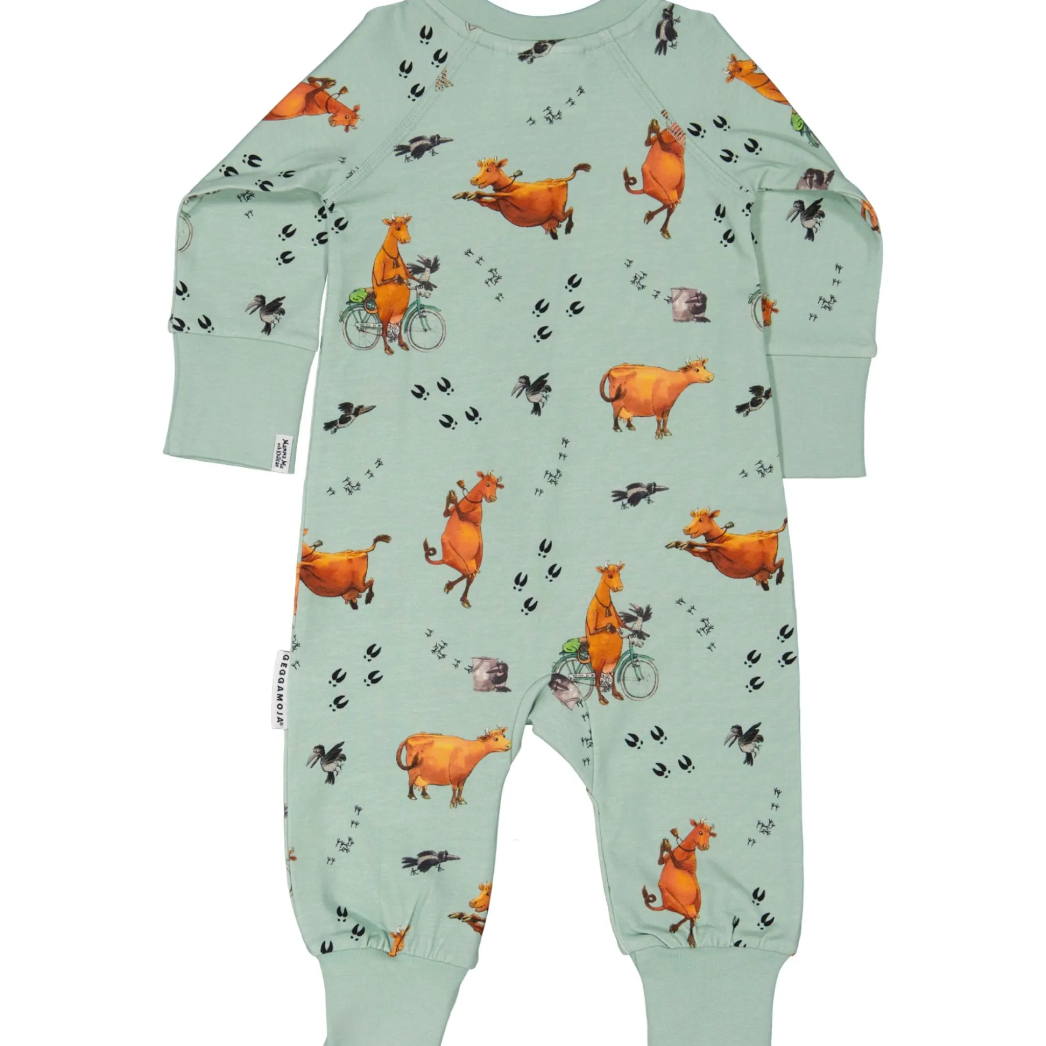 Mjuk och skön Mamma Mu pyjamas i Ekologisk -bomull. Pyjamasen har blixtlås fram med skydd så blixlåset inte ligger mot huden. Blixtlåset går att öppna både uppifrån och nerifrån, vilket underlättar snabba blöjbyten på natten. Breda muddar ärm och benslut gör så att pyjamsen kan vikas upp om den är lite stor i från början. Härlig hel pyjamas som inte lämnar glipor.