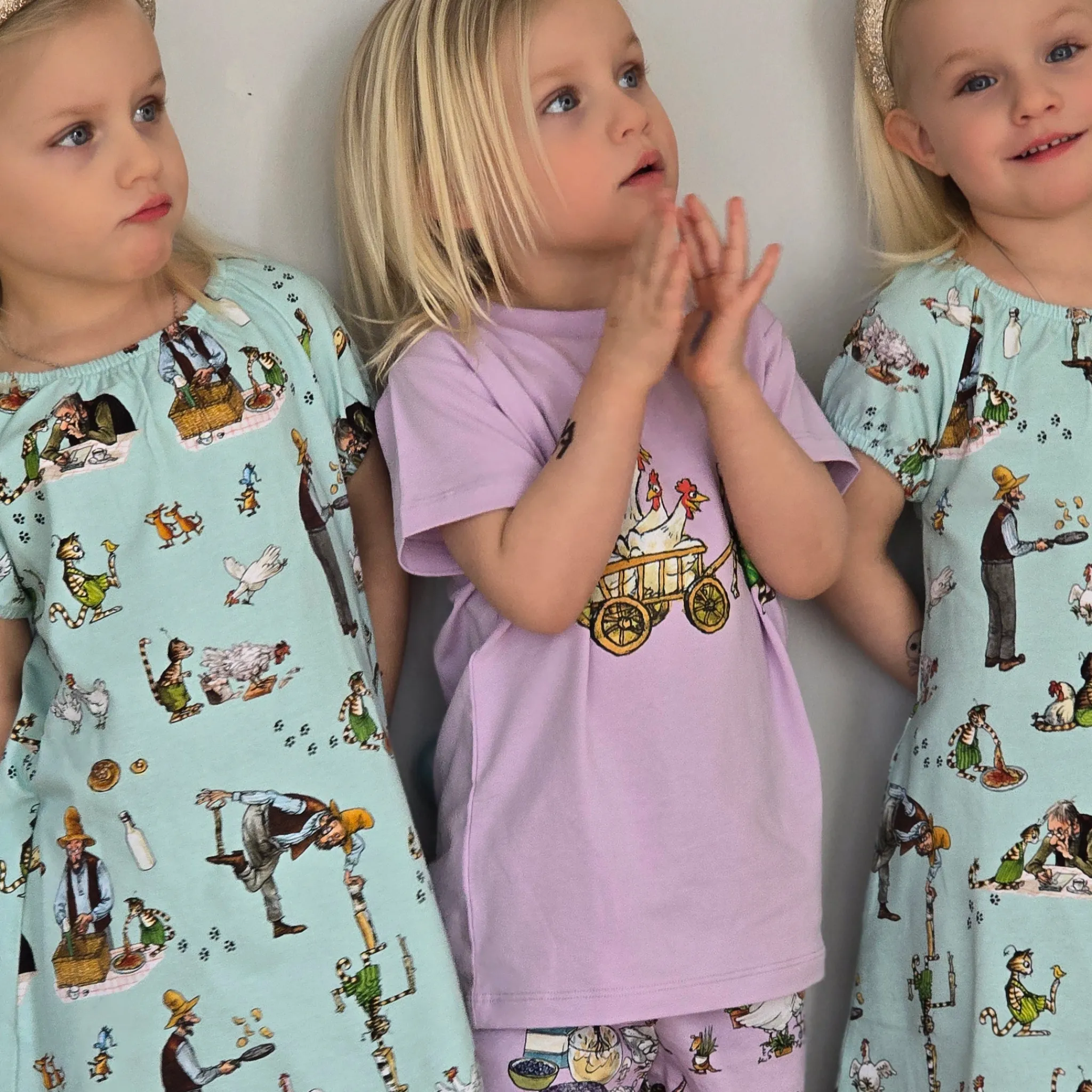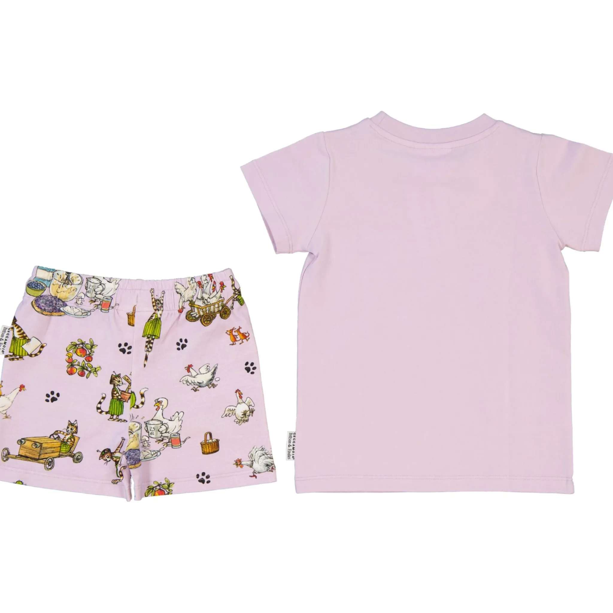 Tvådelad set med Pettson och Findus i mjuk och skön Ekologisk bomull. Setet består av ett par korta byxor med resår i midjan och en kortärmad tröja. Kan användas som en pyjamas eller som ett härligt set.