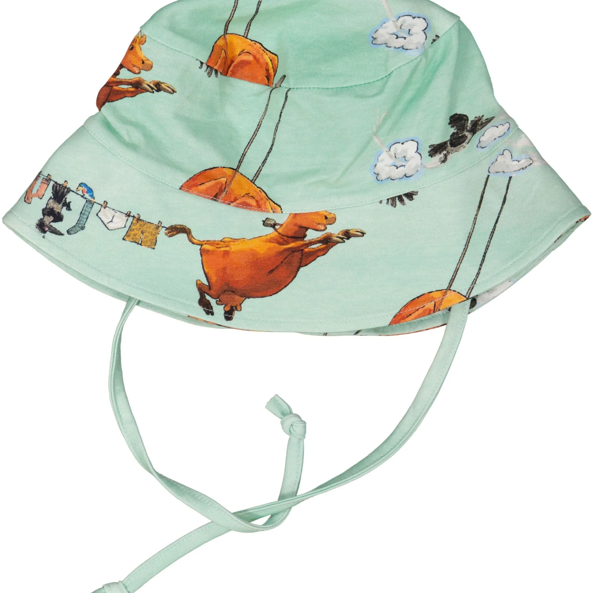 En solhatt i mjuk sval bomull i Mamma Mu print. Solhatten har snören för knyt under hakan och resår baktill för bästa passformen.