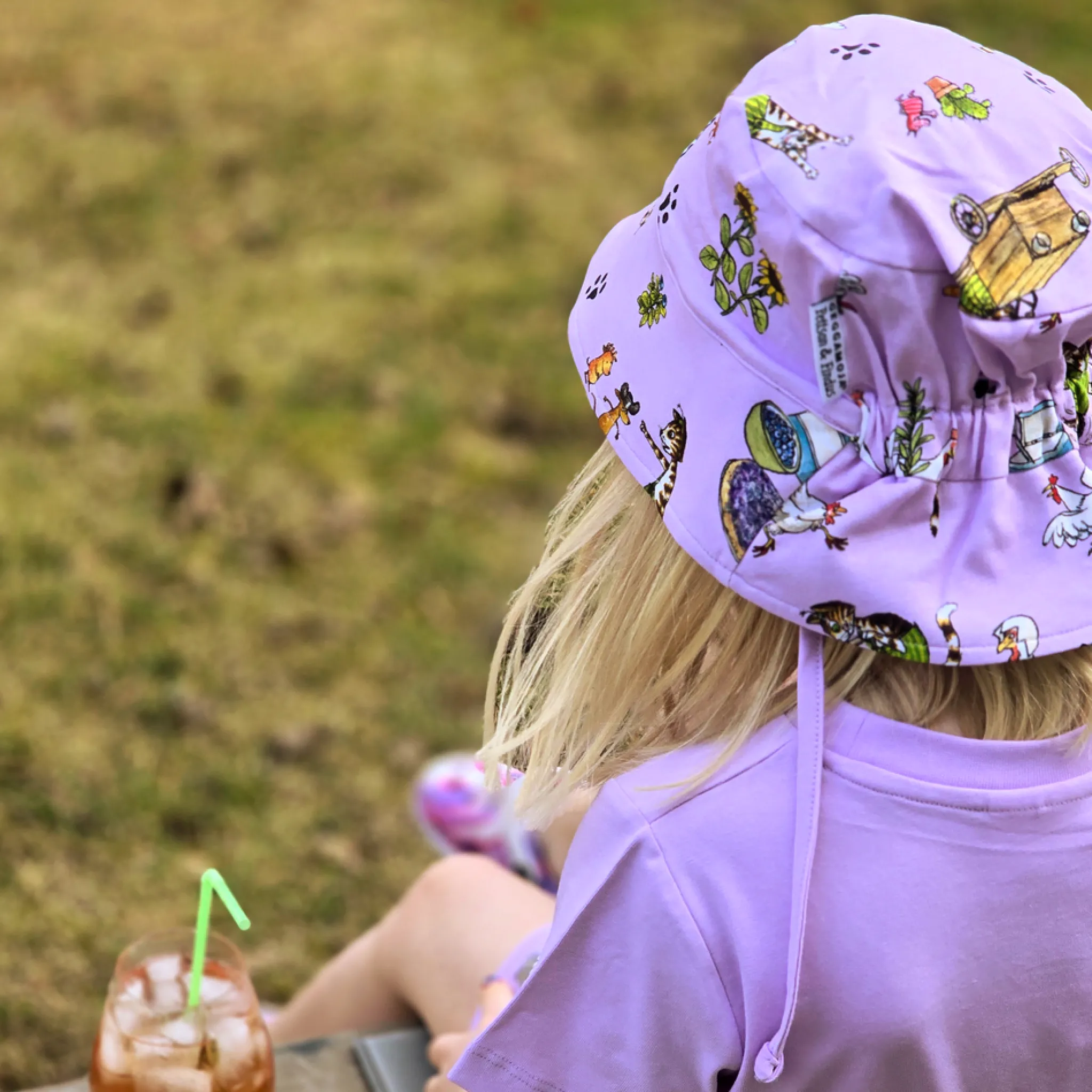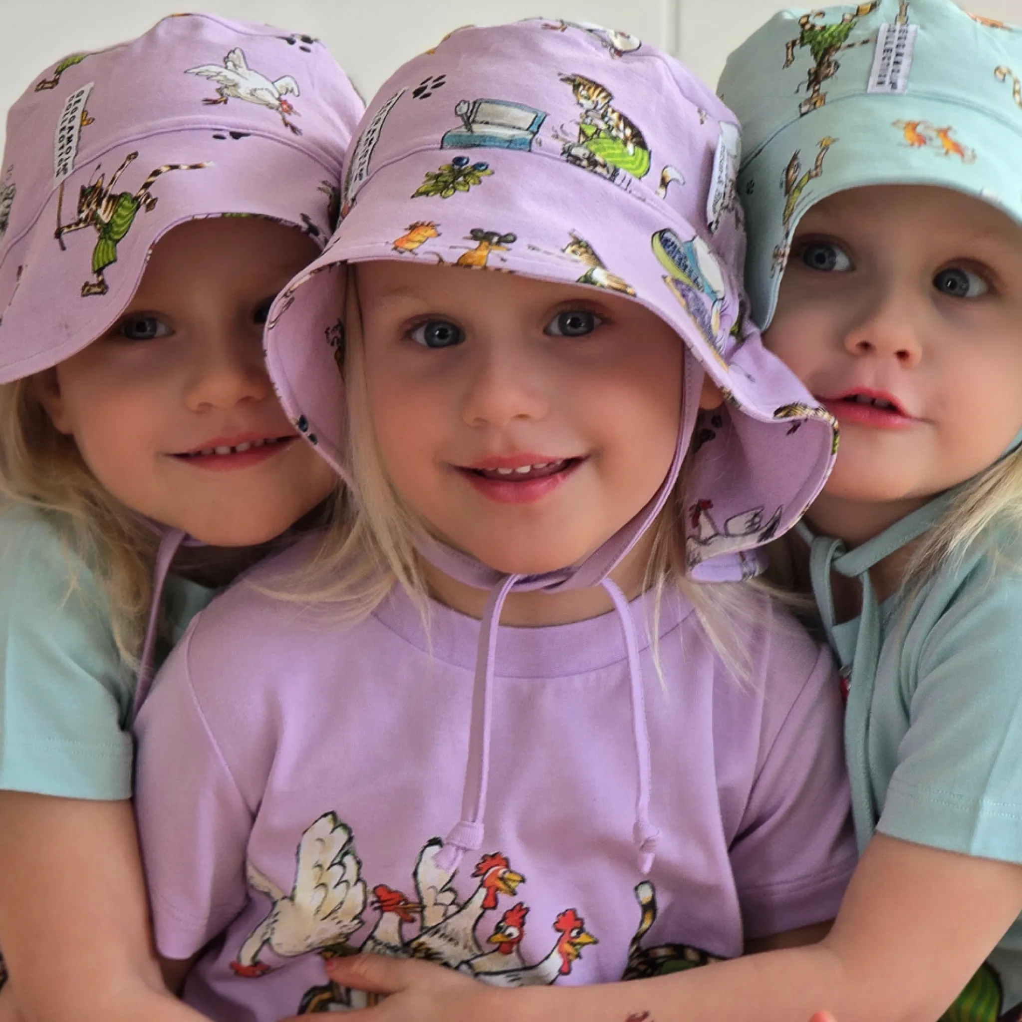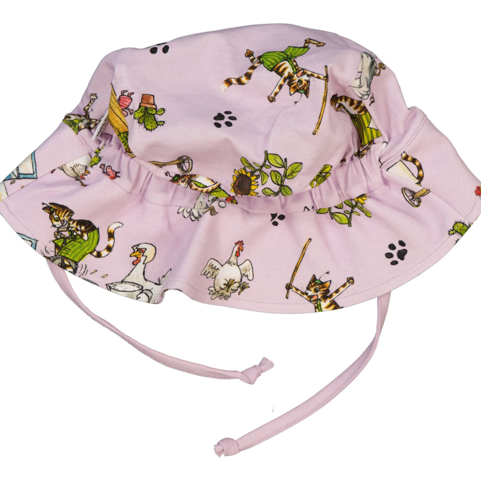 En solhatt i mjuk sval bomull med Pettson och Findus. Solhatten har snören för knyt under hakan och resår baktill för bästa passformen.