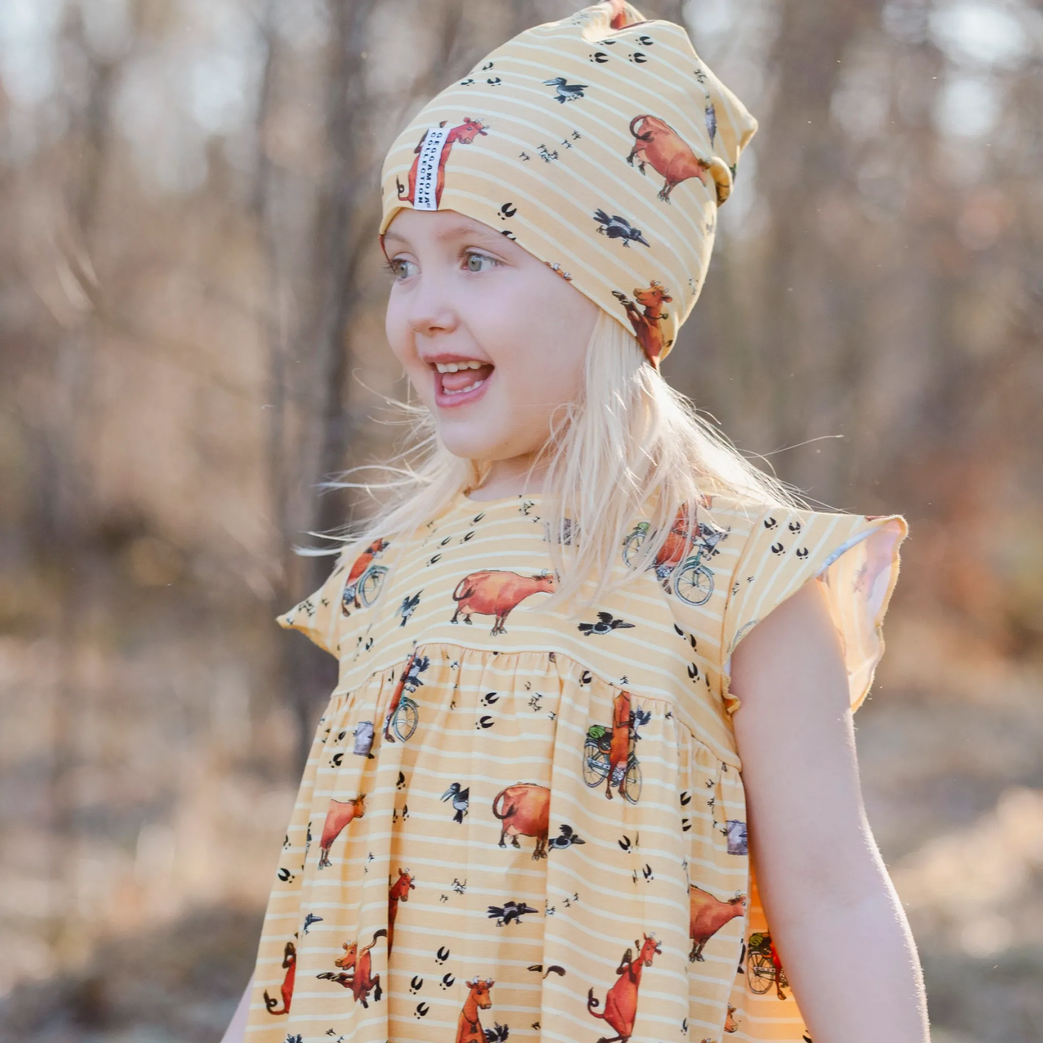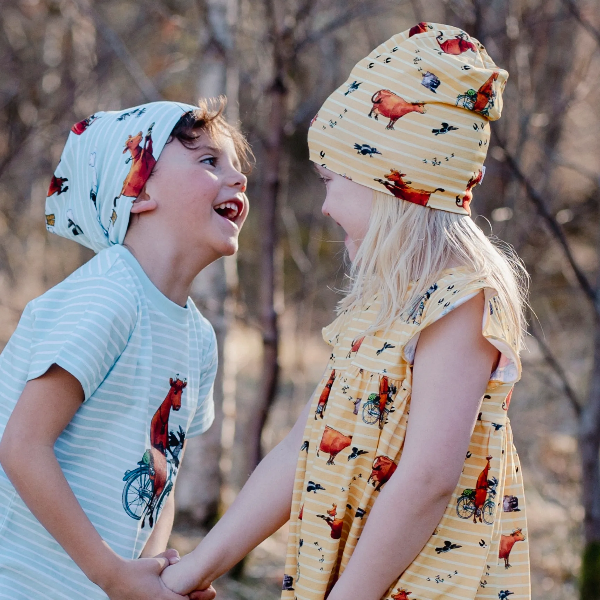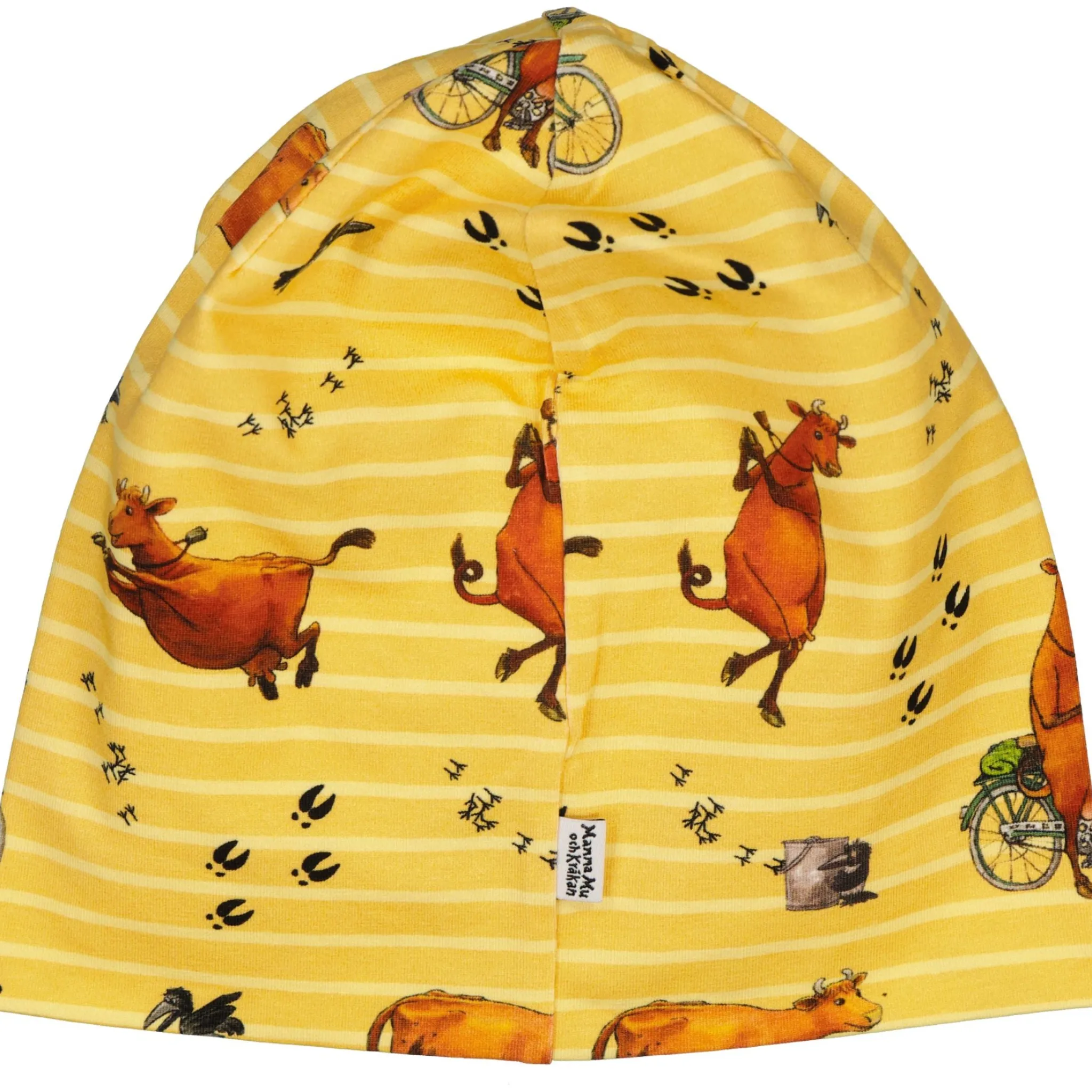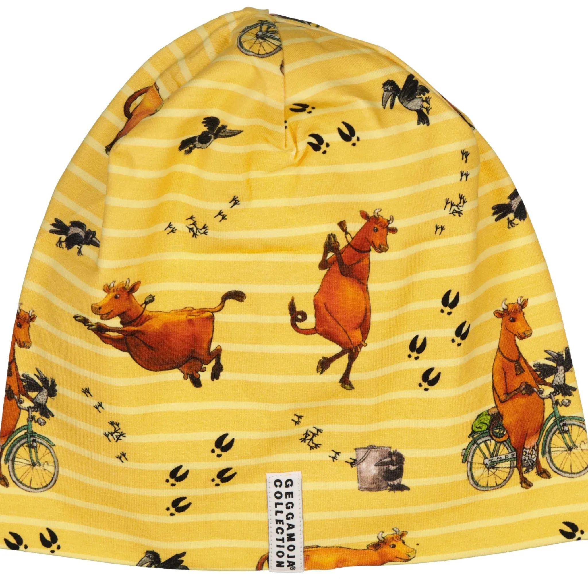 Mössa med Mamma Mu print. Mössan är i Ekologisk bomull och har Geggamojas härliga passform som passar alla, liten som stor.