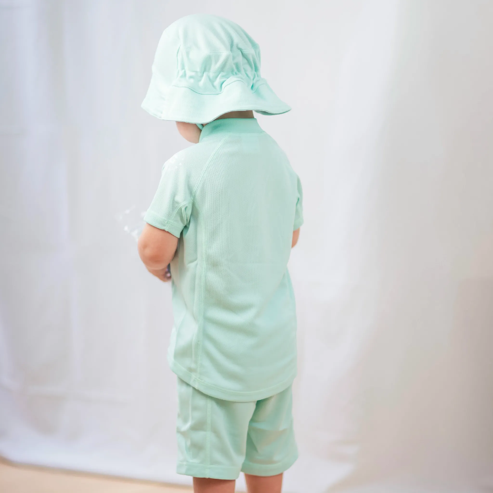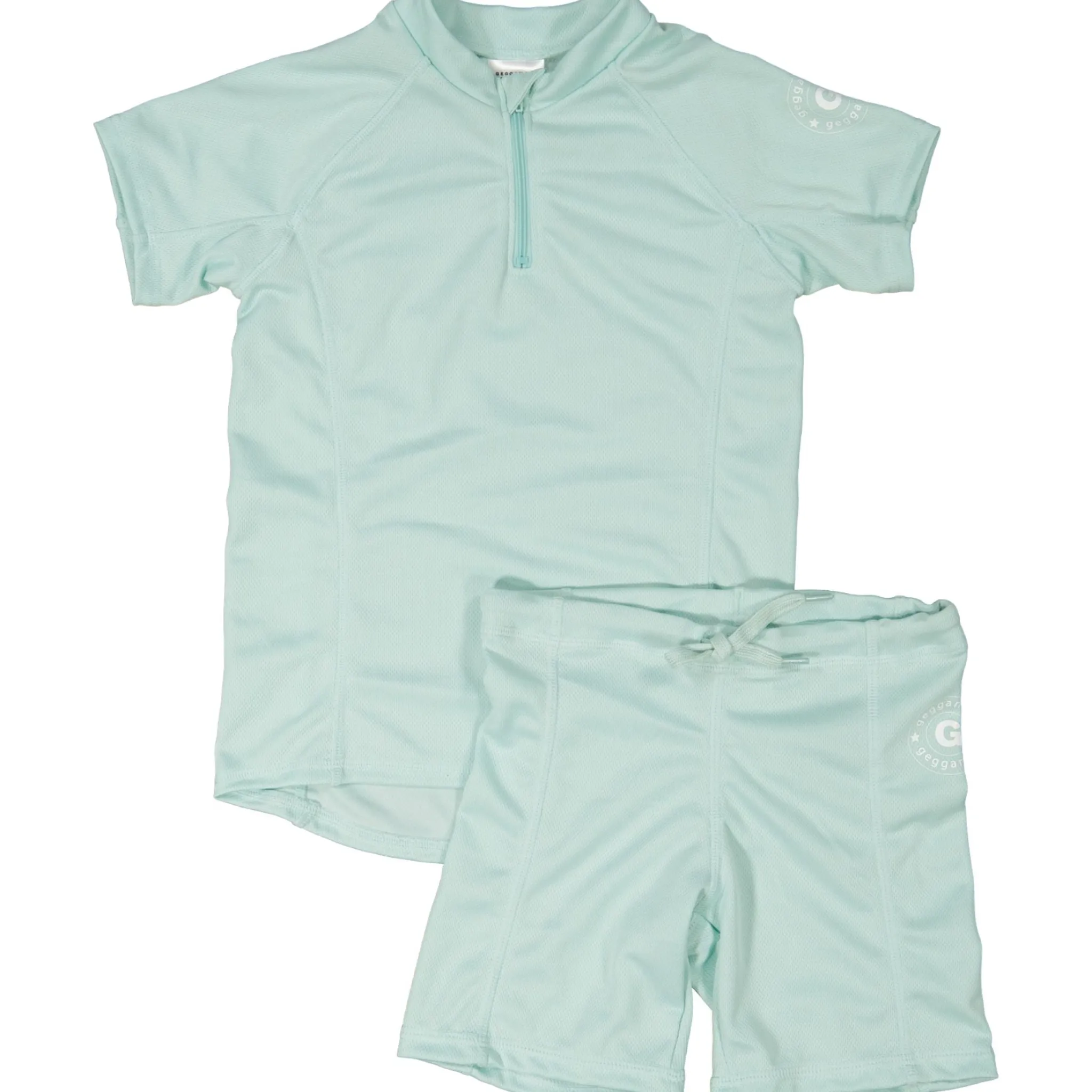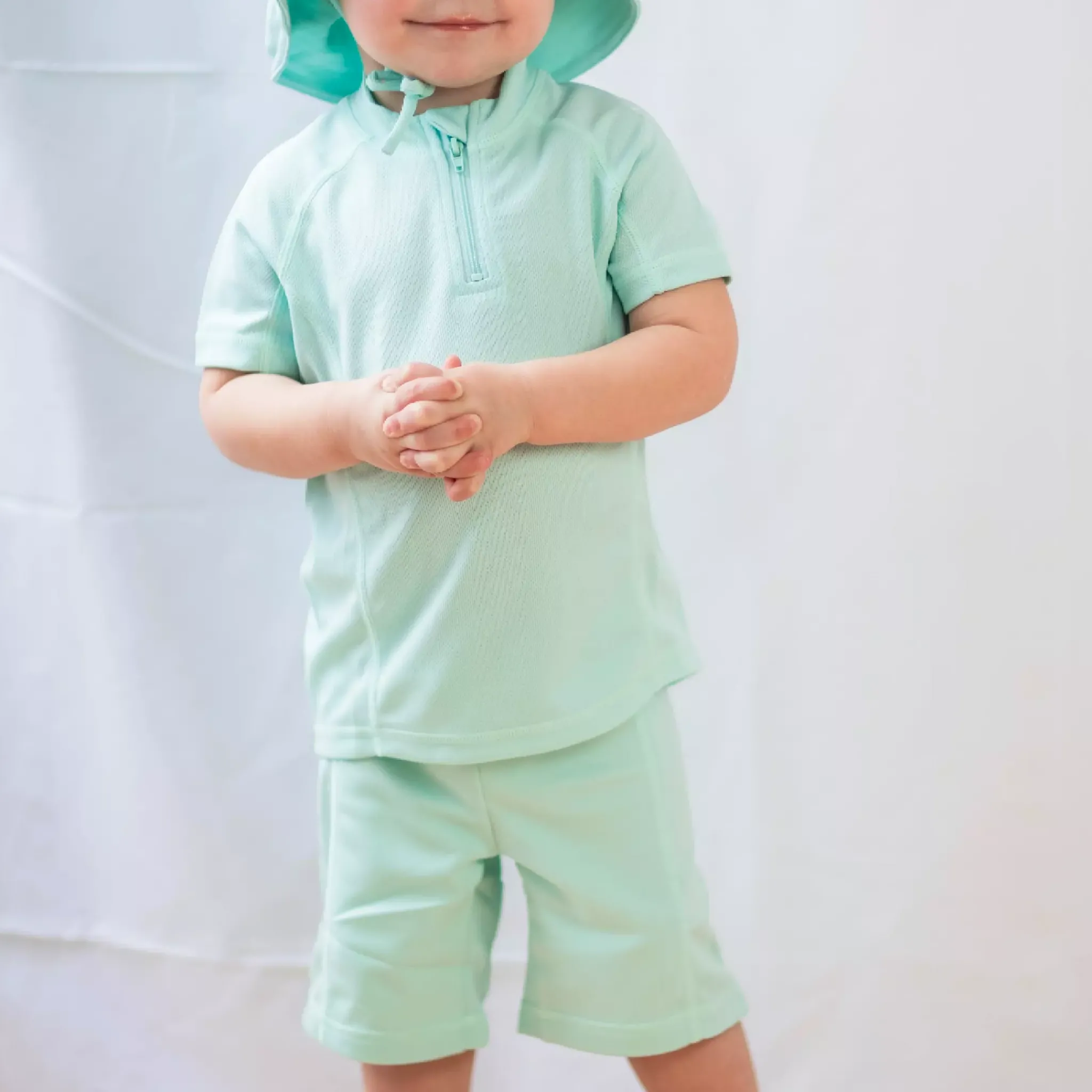 Mintfärgat UV- badset med kortärmad tröja och shorts. Det är tillverkad i ett snabbtorkande material, med UV-50+ som blockerar 98% av solens farliga UVA- och UVB-strålar. En storfavorit hos barnfamiljer. Med ett UV-set skyddar du ditt barn från solen starka stålar både vid poolen eller på stranden. Tröjan har en dragkedja framtill för enkel på och avklädnad.