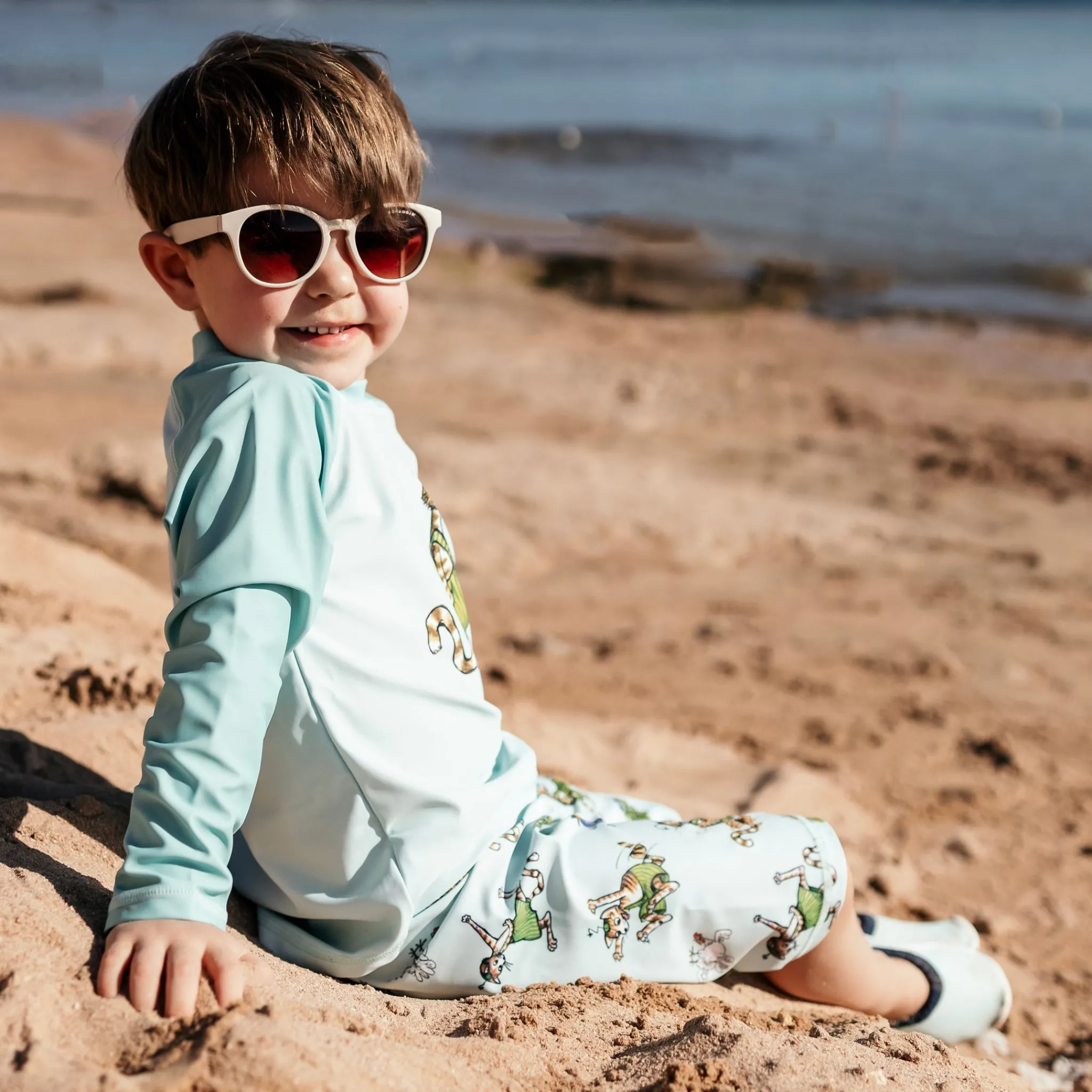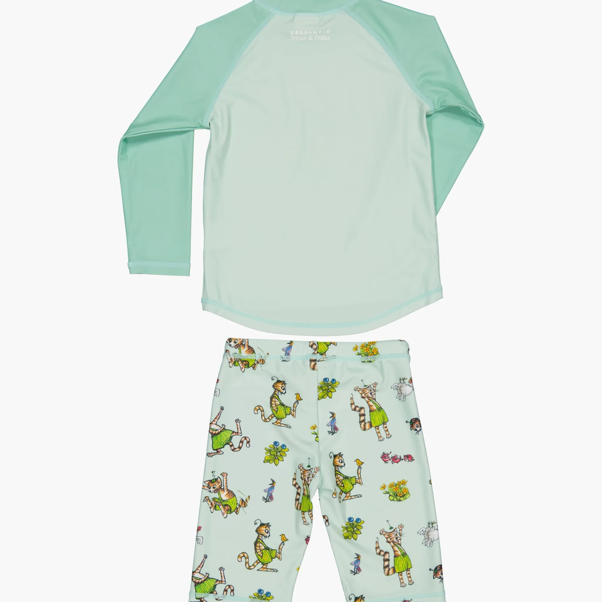UV bad-set med Pettson och Findus motiv långärmad tröja och shorts. Det är tillverkad i ett snabbtorkande material, med UV-50+ som blockerar 98% av solens farliga UVA- och UVB-strålar. En storfavorit hos barnfamiljer. Med ett UV-set skyddar du ditt barn från solens starka strålar.