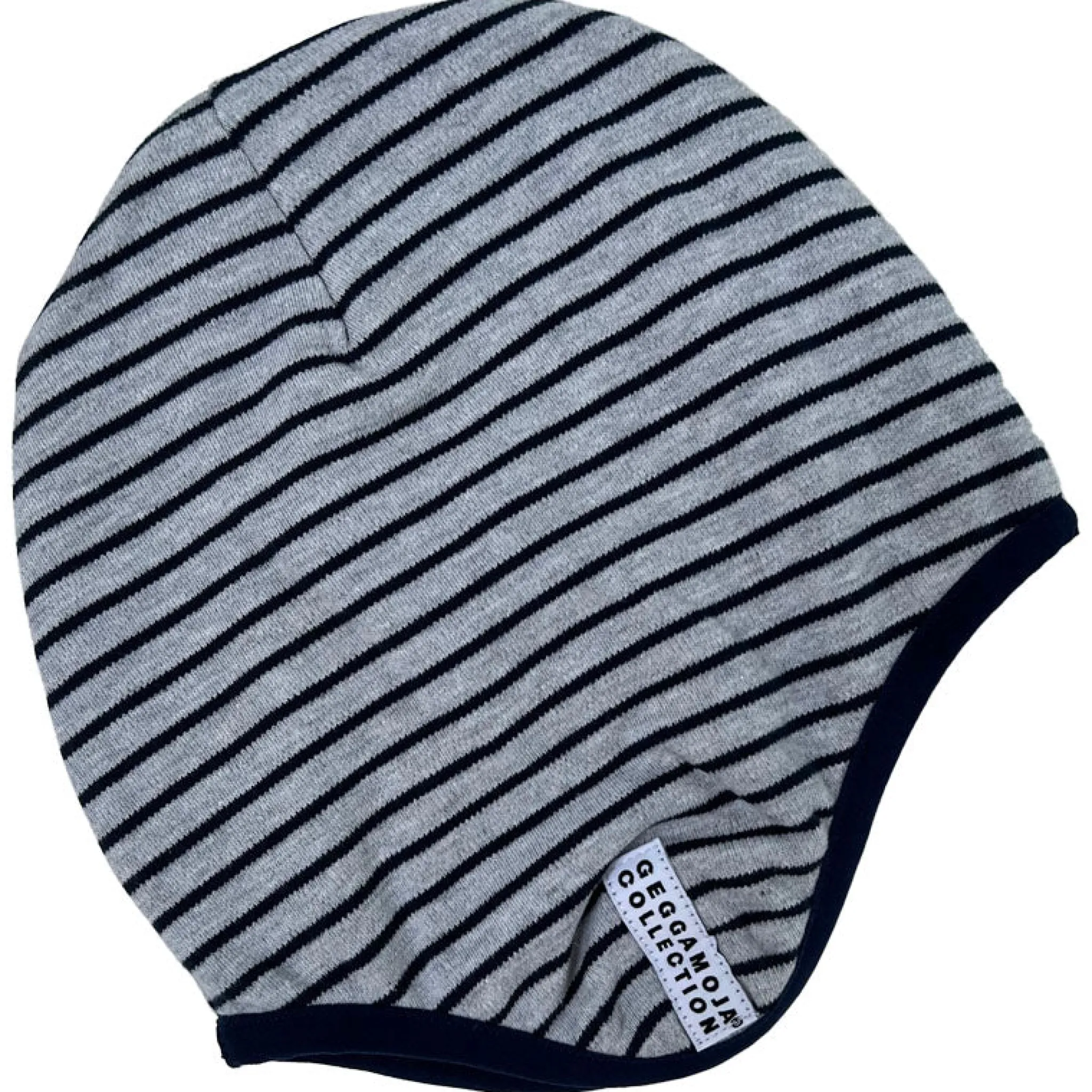 Äntligen tilllbaka! Den populära hjälmmössan som är fodrad med skön fleece. Den är i Geggamojas klassiska ränder i grå och marinblå. Öronlapparna värmer extra gott.