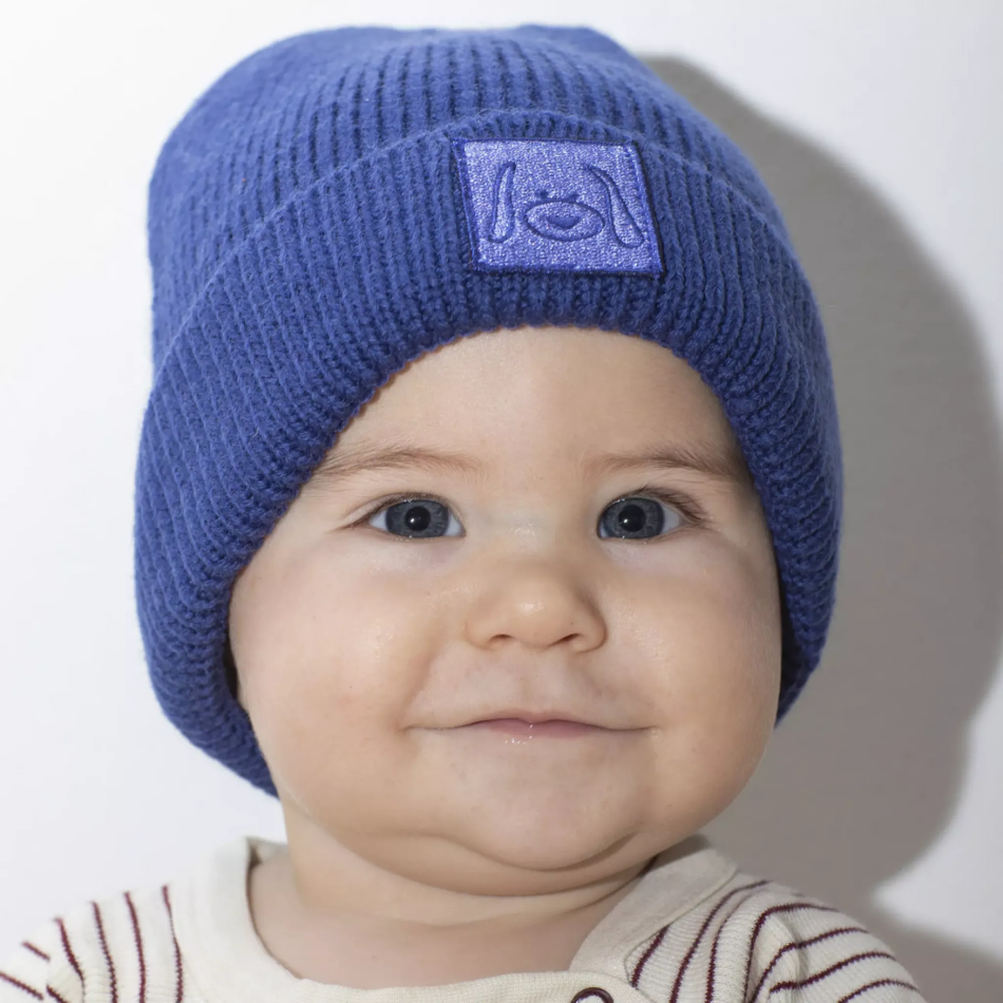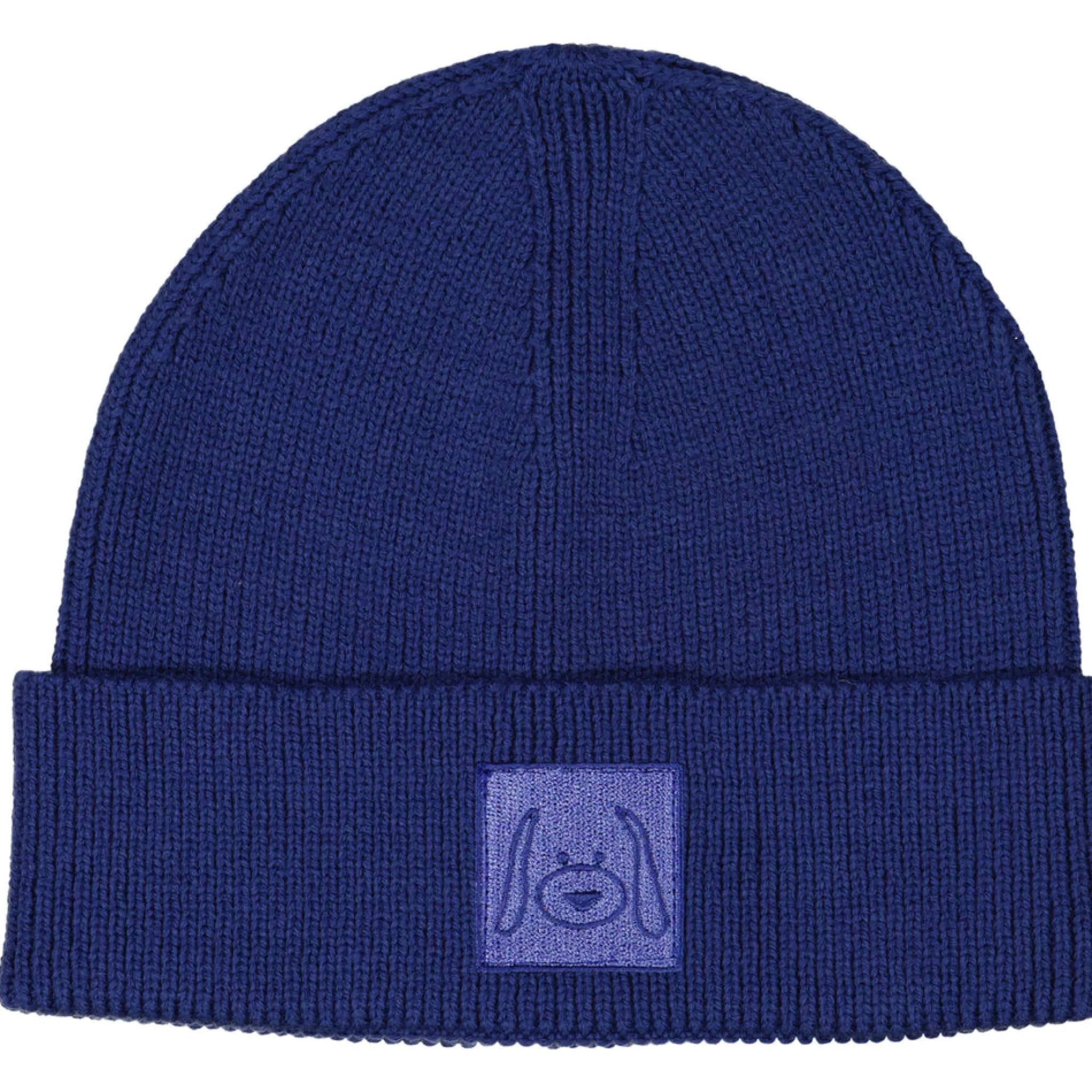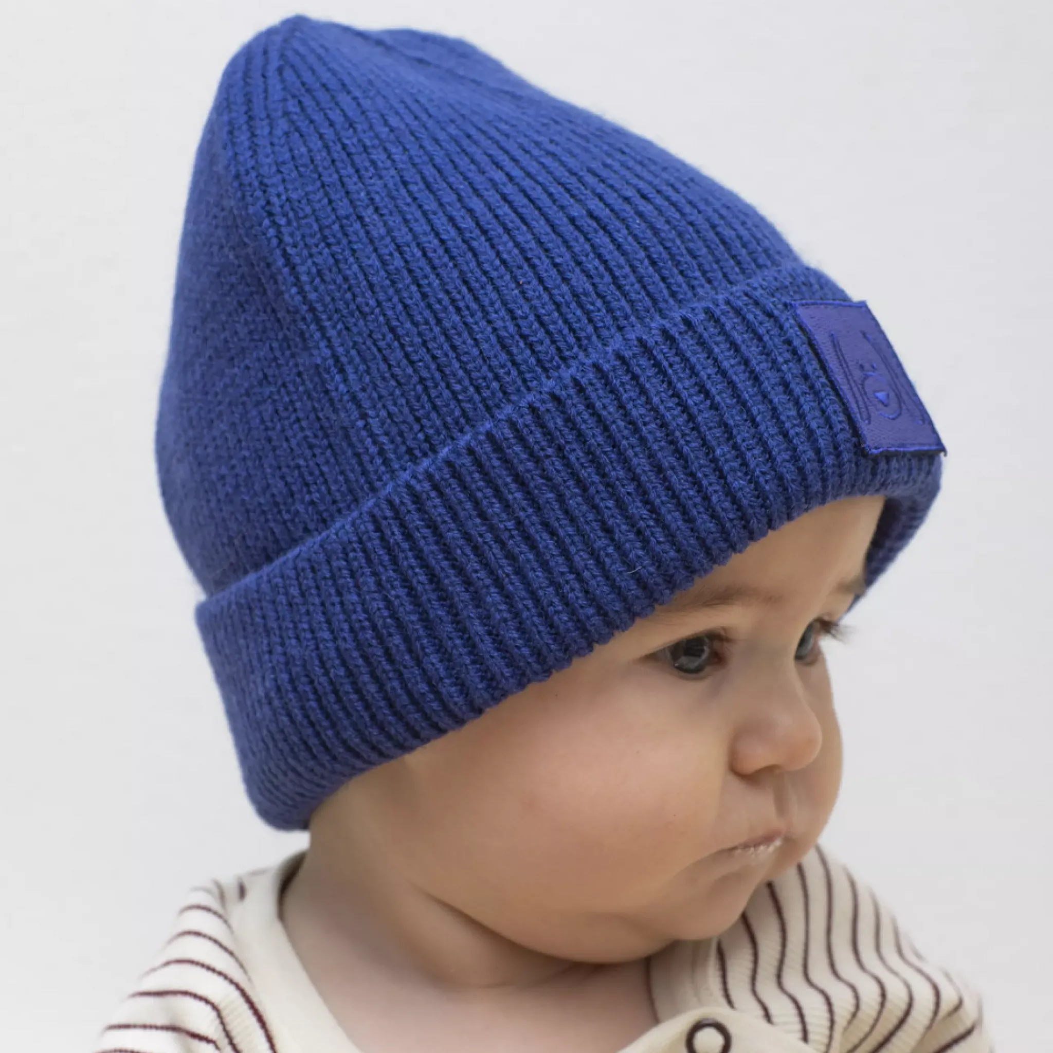 Stickad mössa i blå härlig färg. Mössan är stretchig och har en bra passform. Den har en vikt kant med Geggamojas logga på.