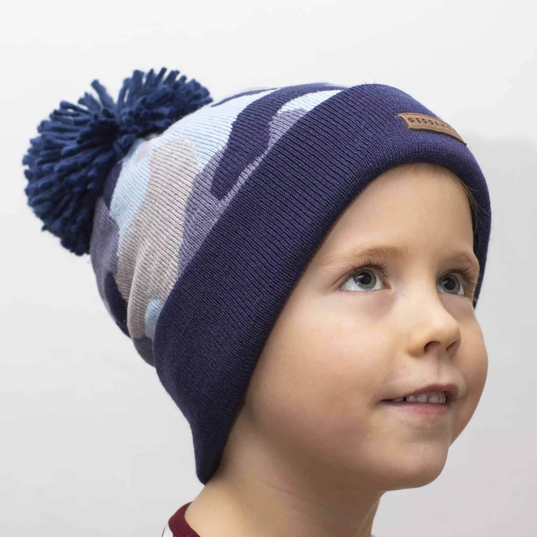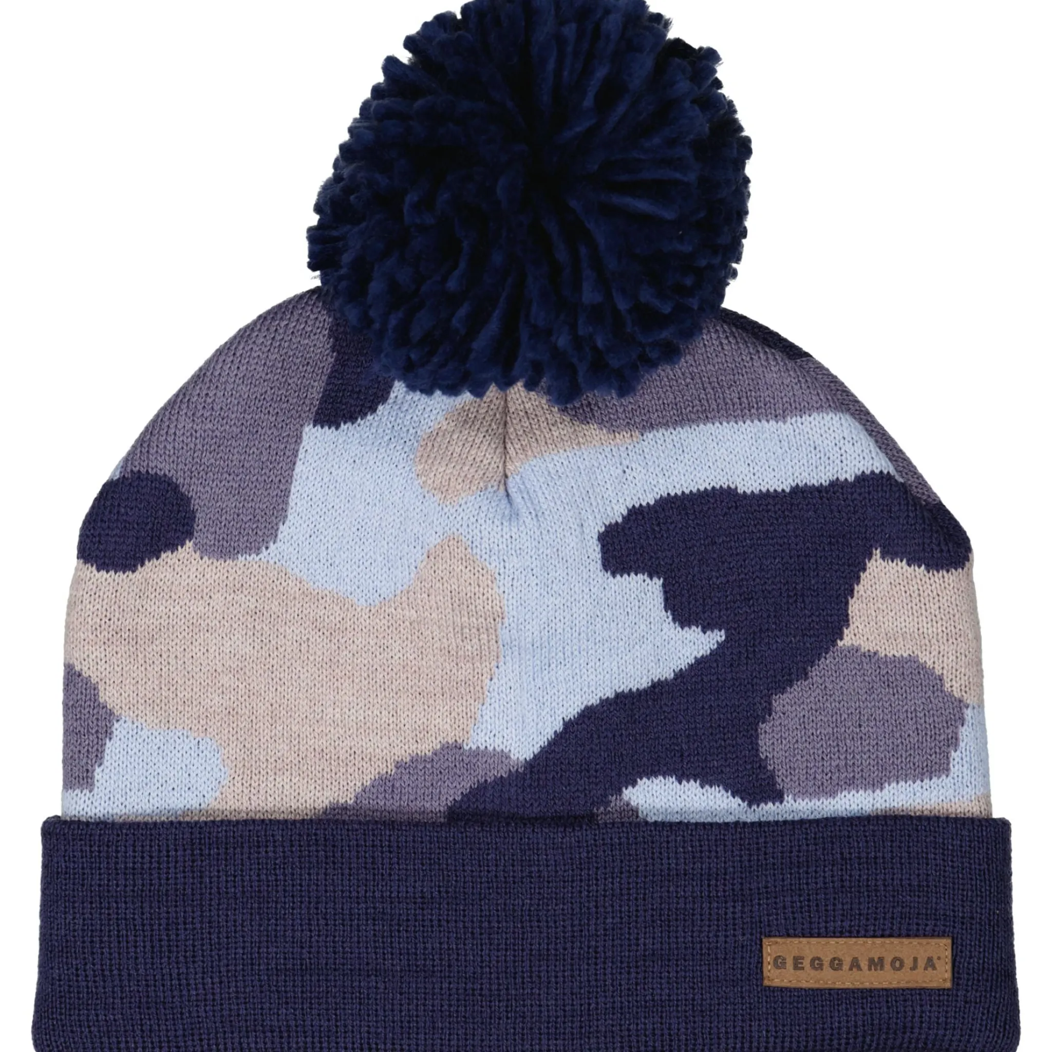 Stickad mössa med tofs som är både varm och skön. I vårt populära kamo mönster i blått.