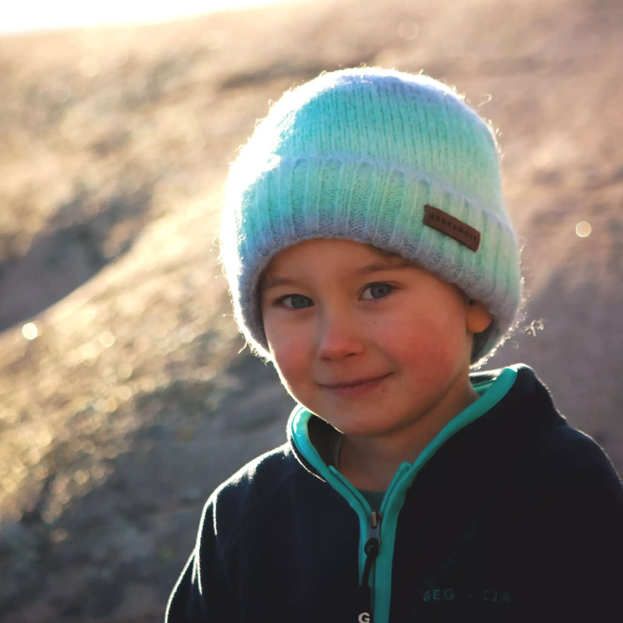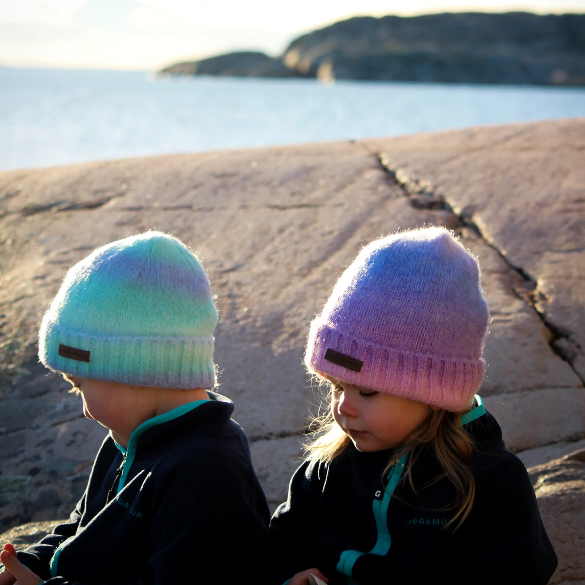 Stickad mössa tillverkad i ull/akryl i härliga färger. Mössan har ett mjukt fleecefoder. En perfekt vintermössa till aktiva barn.
