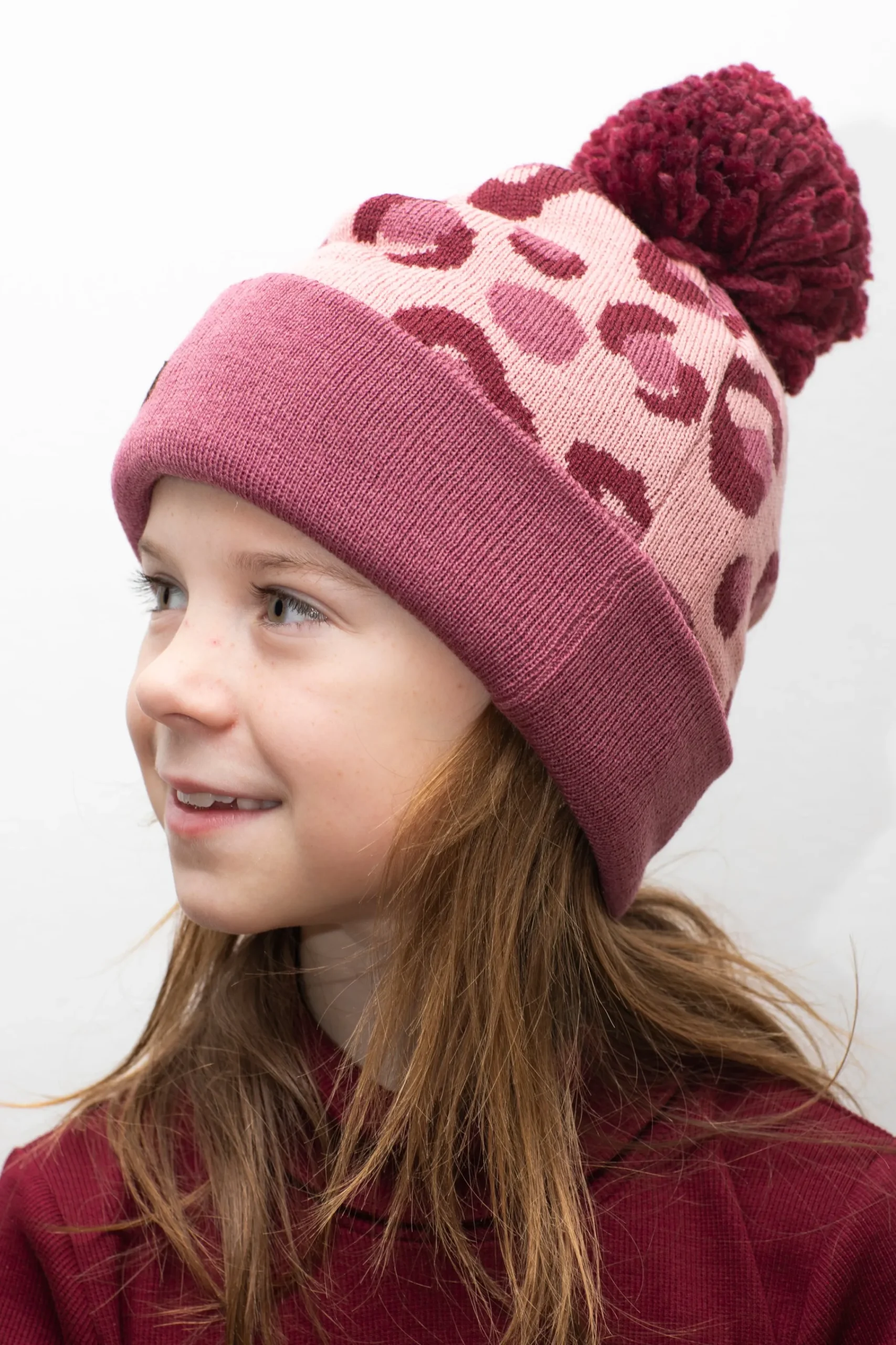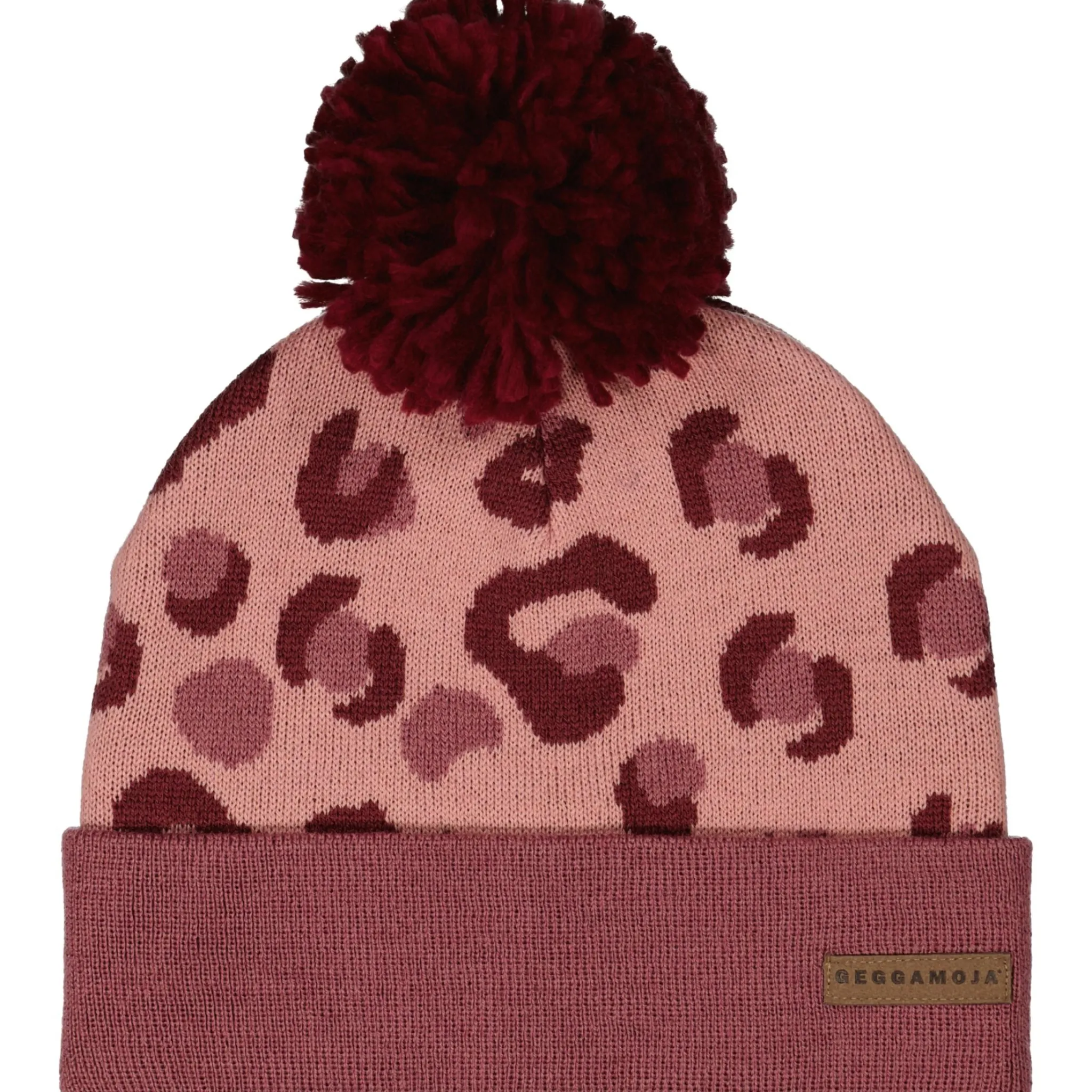 Stickad mössa med tofs som är både varm och skön. I vårt populära leo mönster i vinröd och rosa.