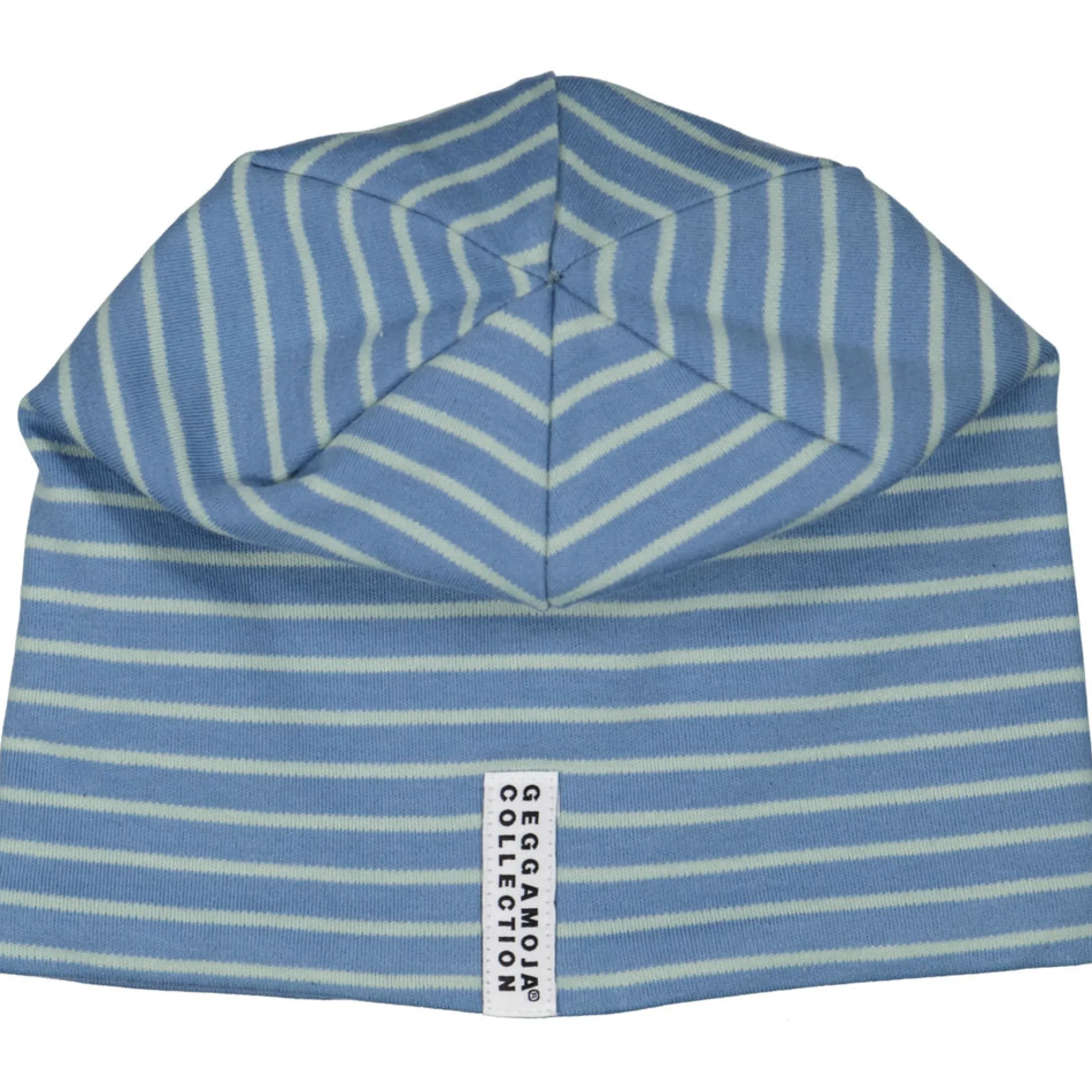 Geggamojas klassiska mössa i blå och grönrandig -bomull! Denna med mjukt fleecefoder som värmer kalla höst- och vintertider.