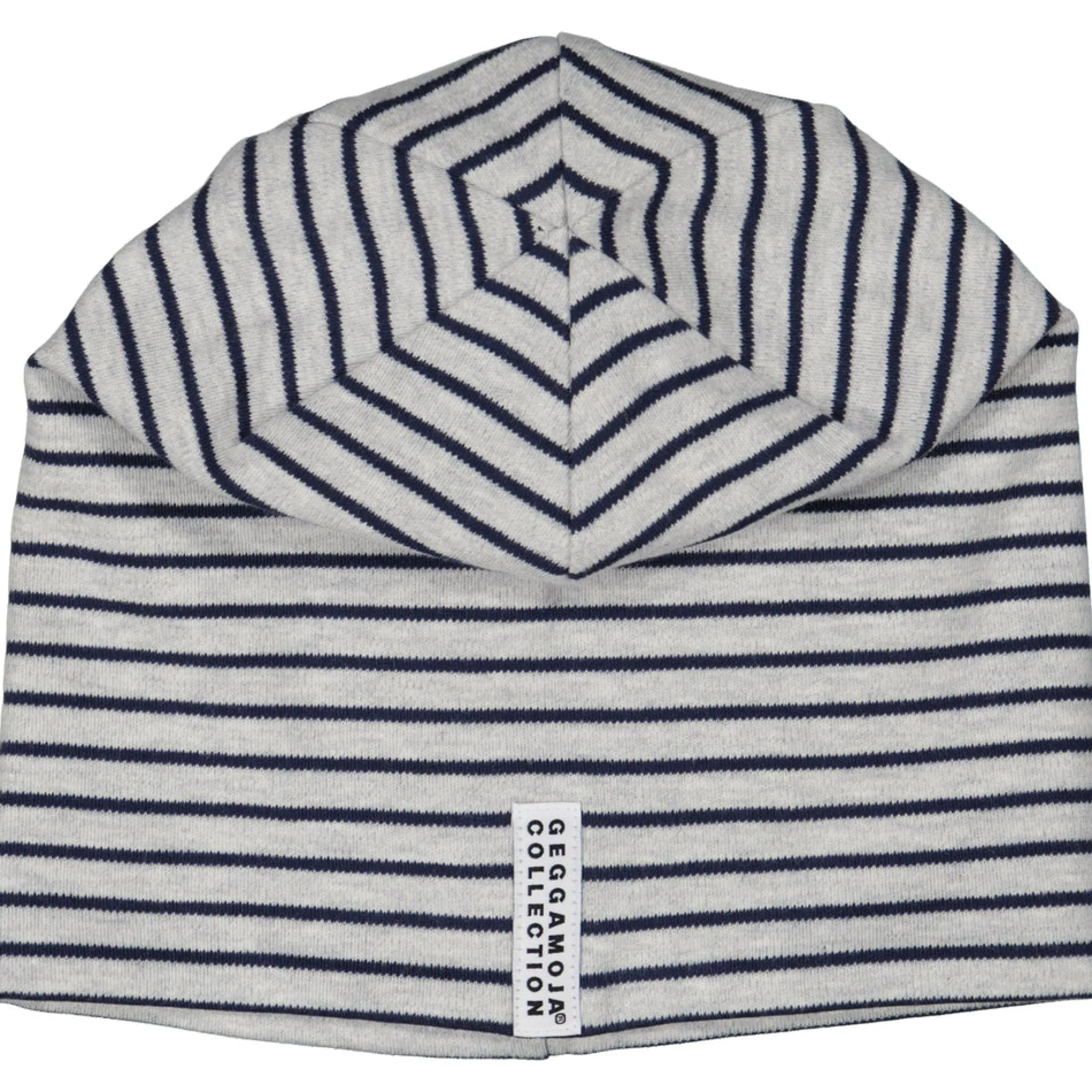 Geggamojas klassiska mössa i grå och marinblårandig -bomull! Denna med mjukt fleecefoder som värmer kalla höst- och vintertider.
