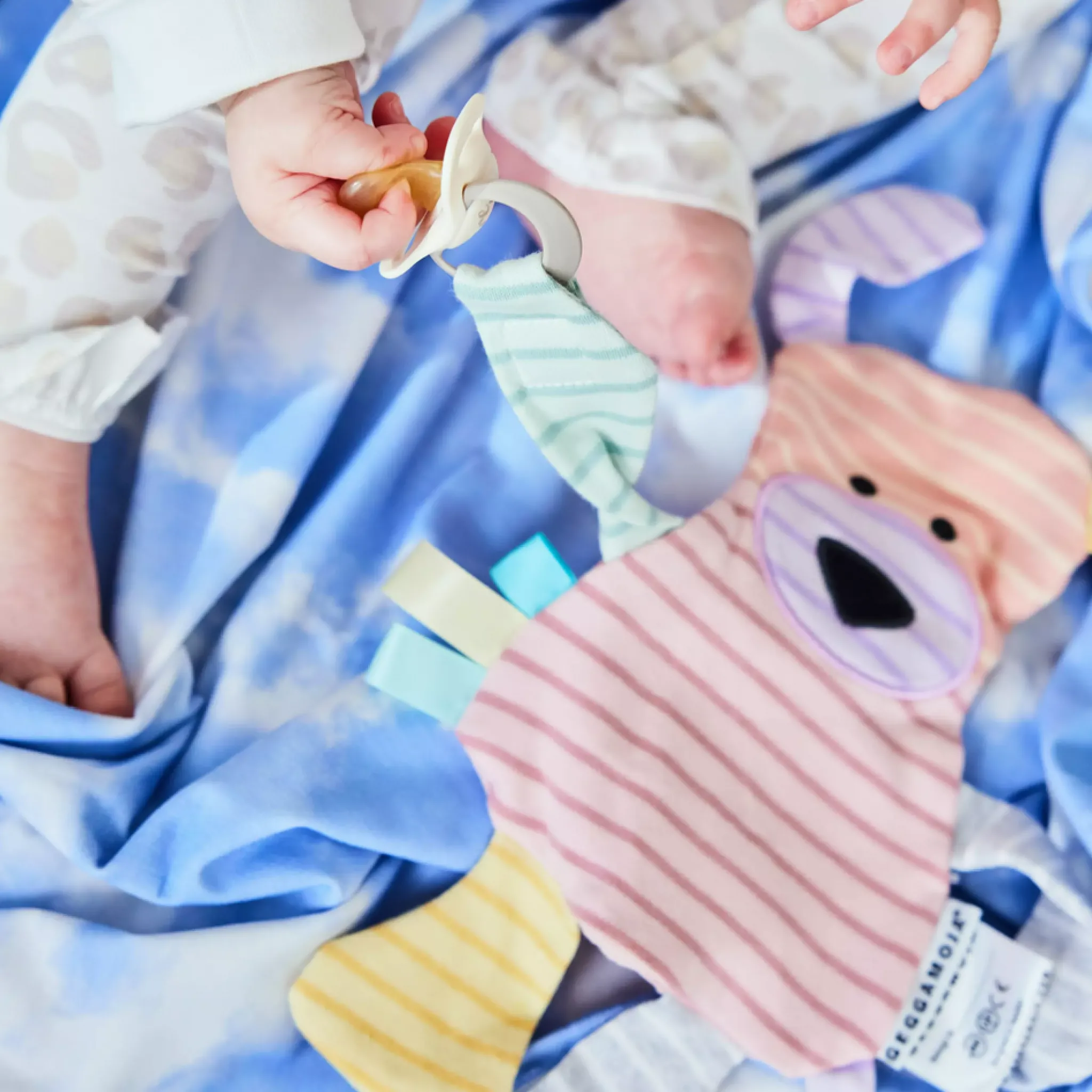 Lek-snutten Doddi play. Lappar att pilla på och ett fäste med kardborre, för nappen. Storlek 30 cm