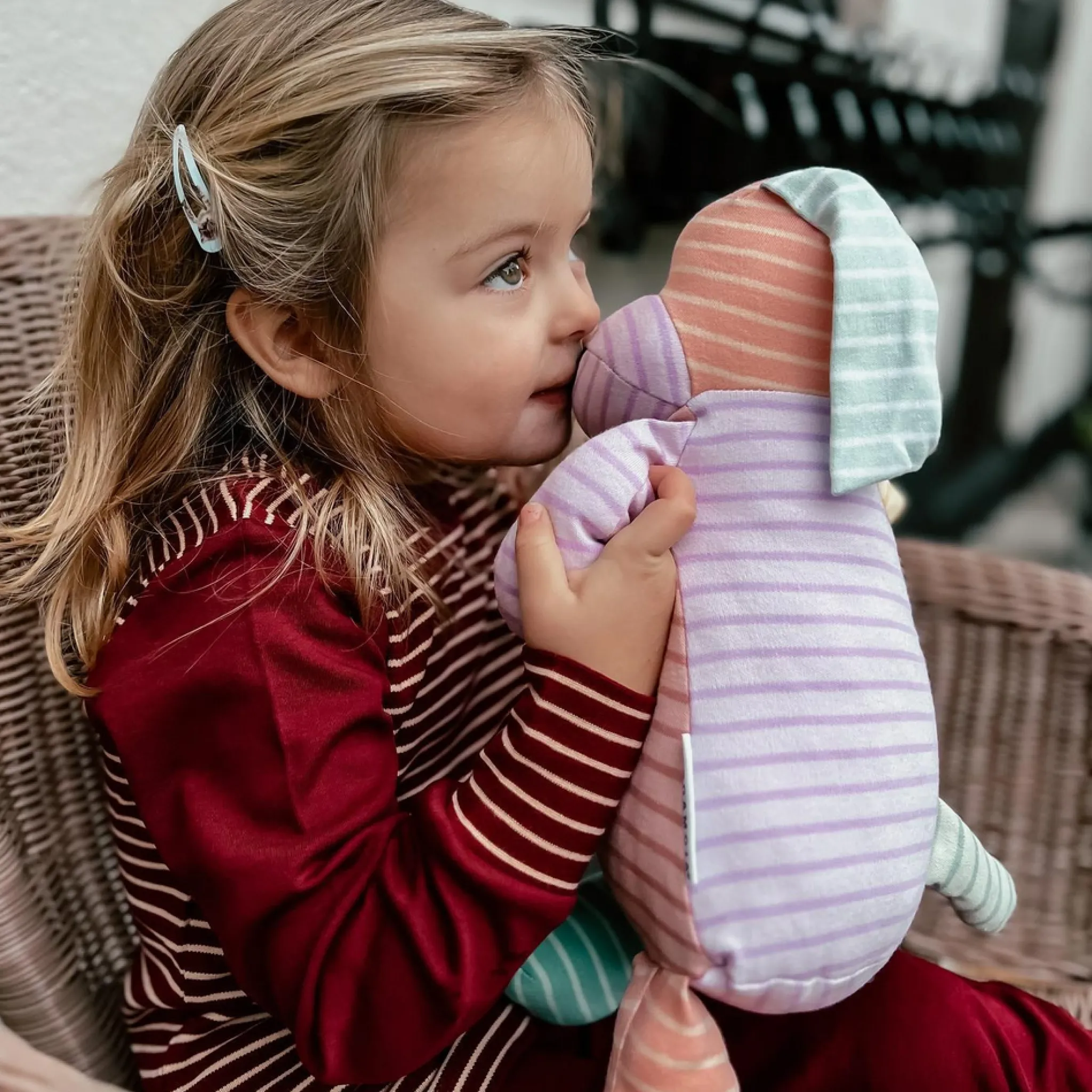 Geggamojas återvinningsmaskot i en mindre storlek. Ca 20 cm. Sydd av överblivna bitar från vår klädproduktion. En ihoplappad kompis som ger ditt barn sällskap och trygghet. CE Märkt. Utsida 100% ekologisk bomullstrikå, stoppning av återvunnen öko-tex certifierad polyestervadd. OEKO-TEX är ett internationellt kontrollorgan som är världsledande för textilier. En certifiering hos OEKO-TEX garanterar att produkten inte innehåller några skadliga ämnen som kan vara farliga för huden och hälsan. Tvättas i 30 grader med liknade färger i tvättpåse