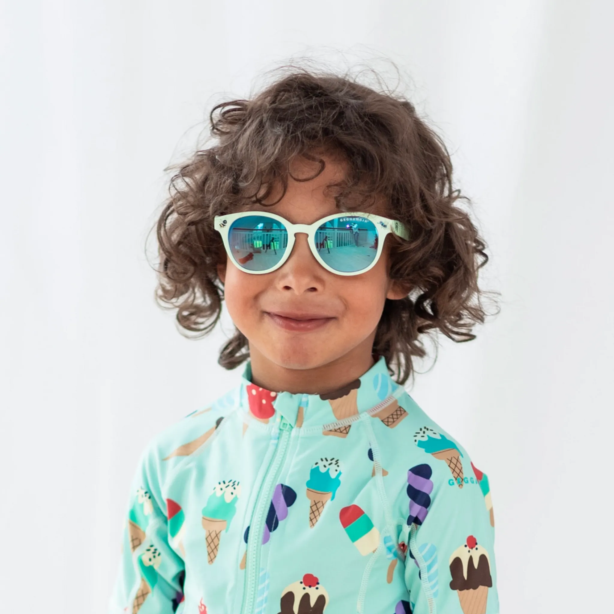 Bågarna är tillverkade i flexibel och BPA-fri plast, vilket gör dem mjuka, lätta och bekväma för små barn att bära. Den reglerbara och avtagbara snodden hjälper solglasögonen att sitta säkert på plats även när barnet rör sig.