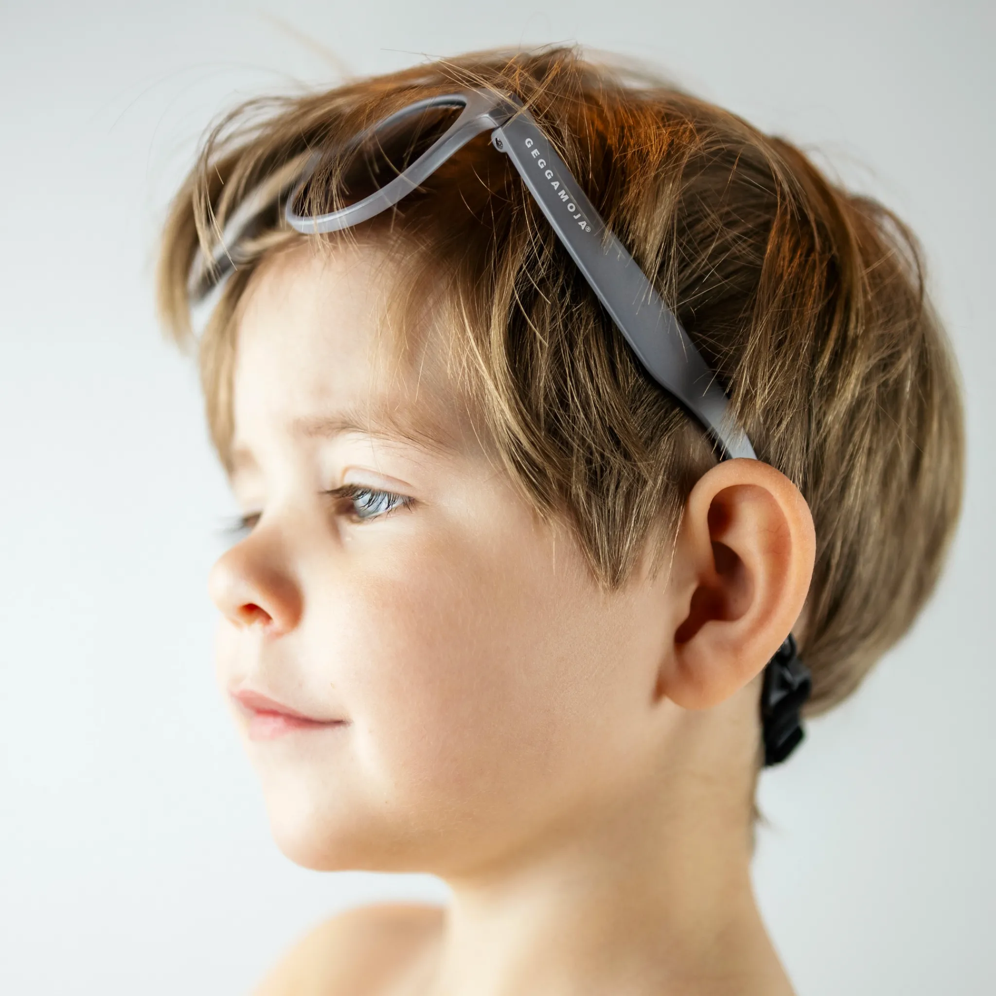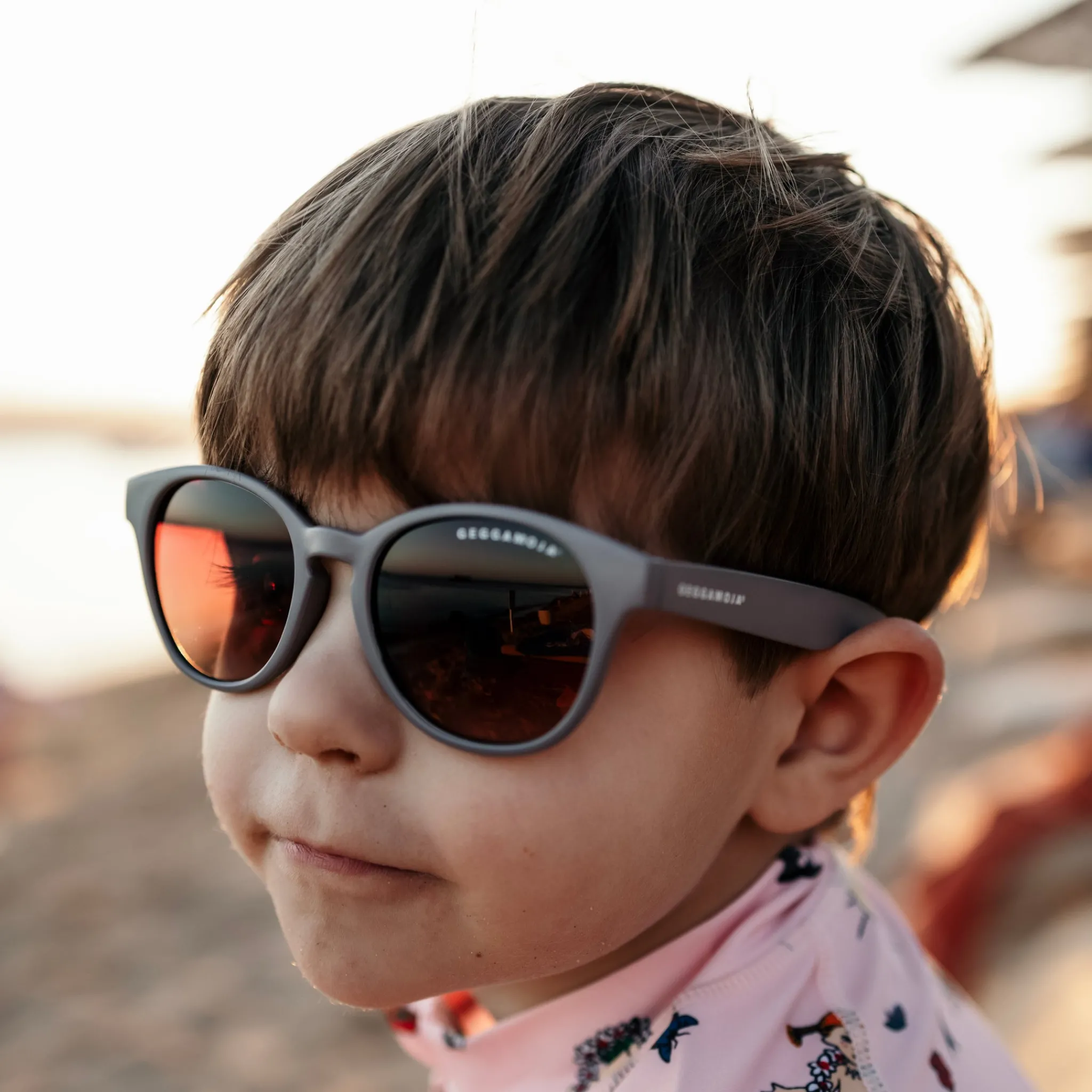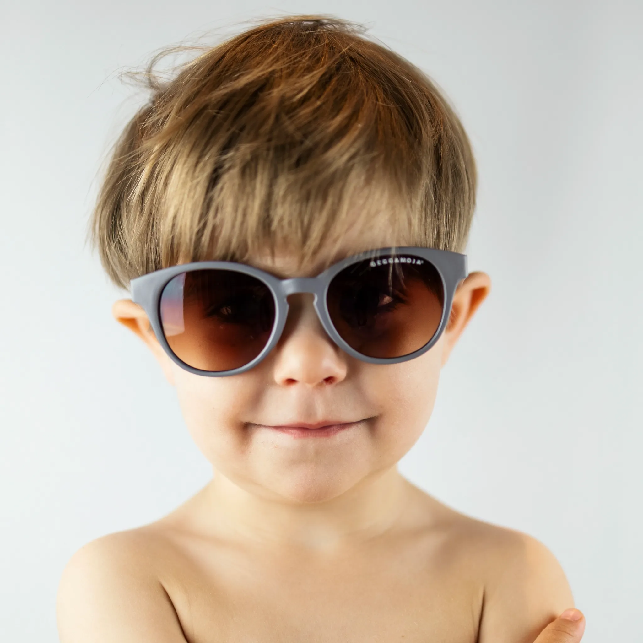 Stilrena och funktionella solglasögon för barn 2–6 år i en neutral grå färg. De är utvecklade för att skydda barns ögon mot starkt solljus samtidigt som de sitter bekvämt under lek och aktiviteter utomhus.