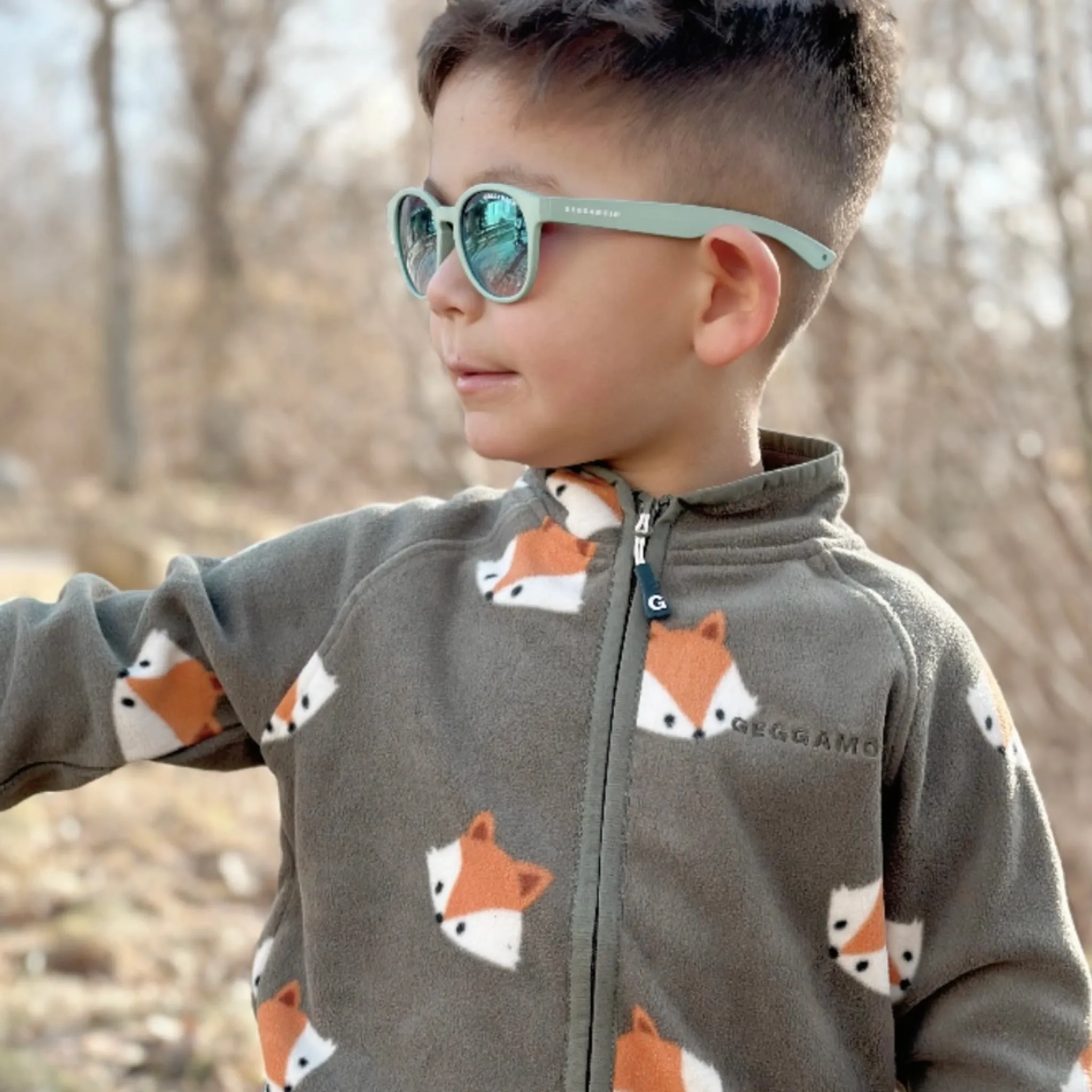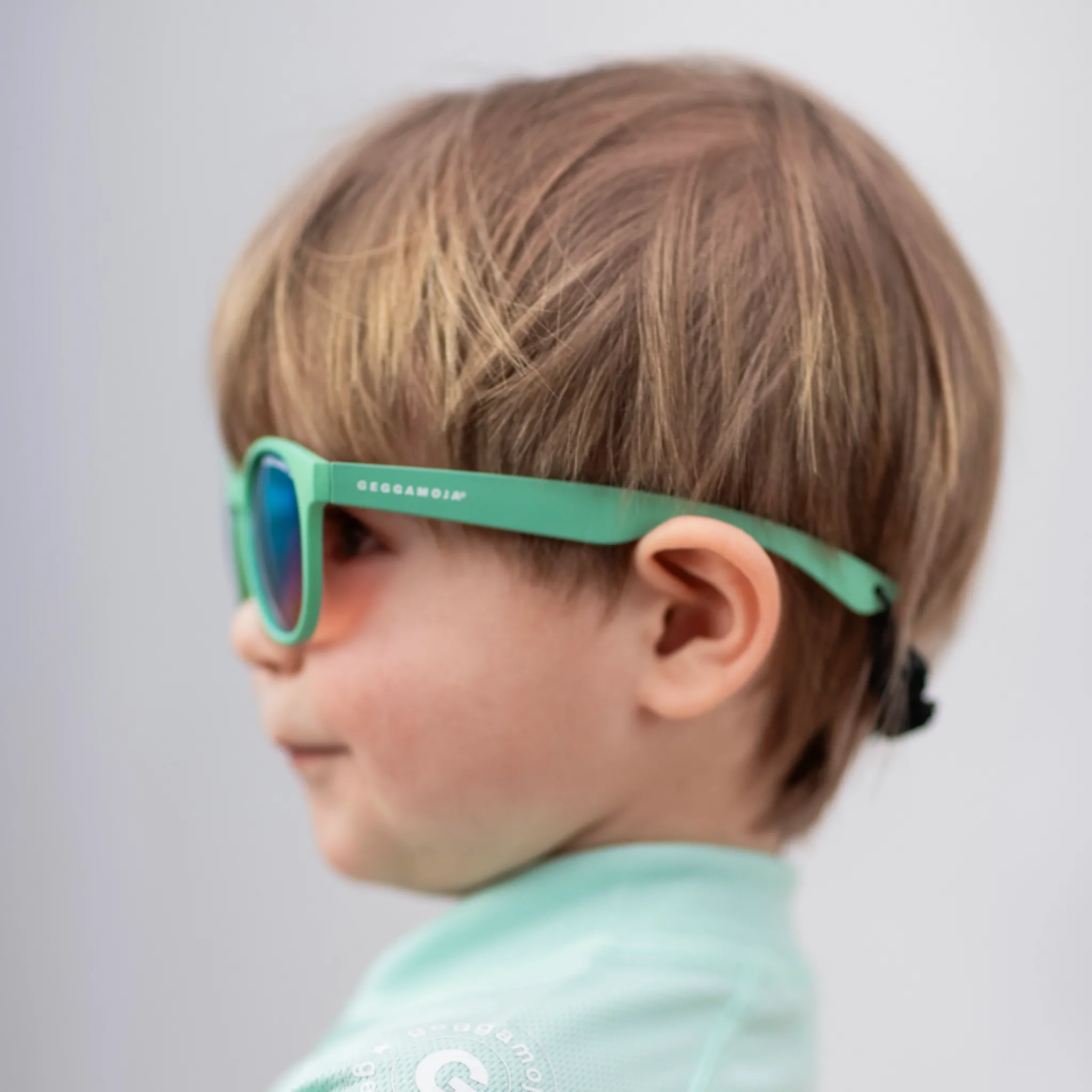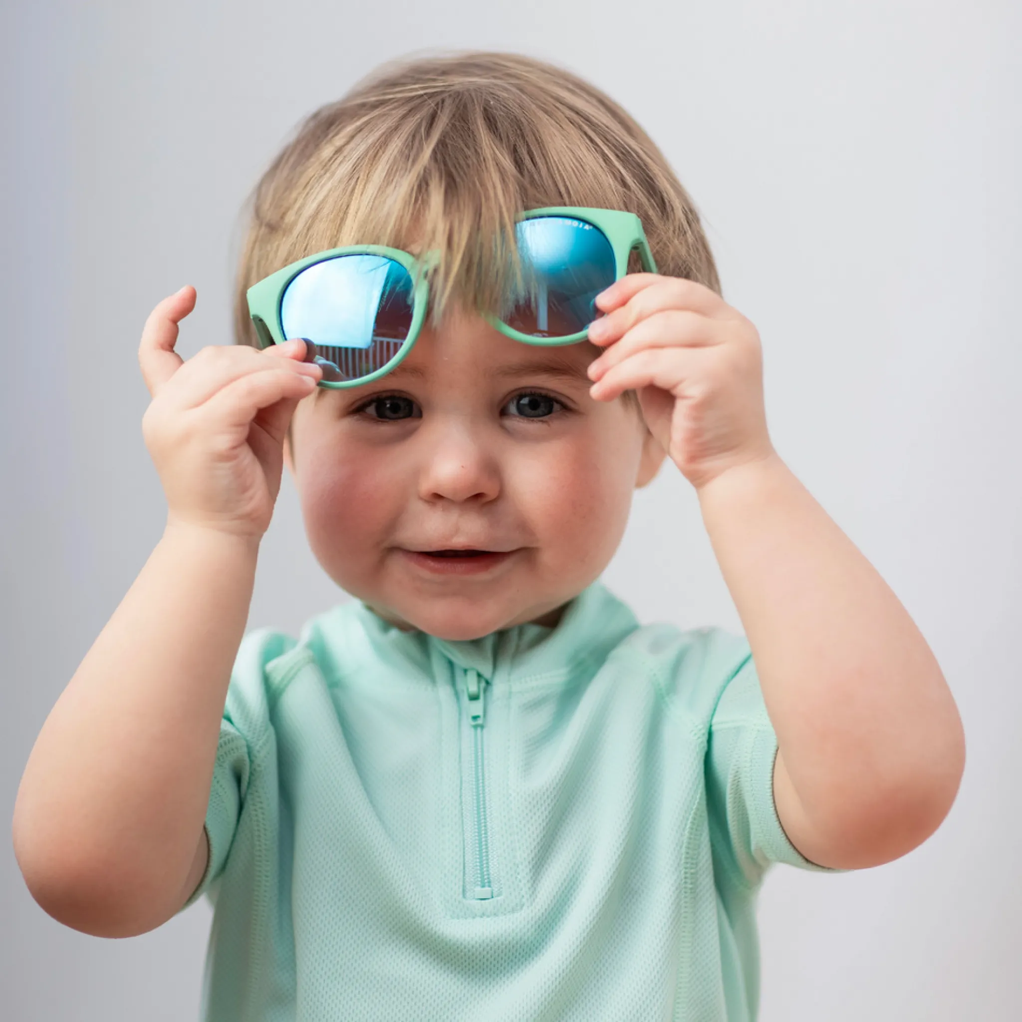 Bekväma solglasögon för barn 2–6 år i en frisk grön färg. De är framtagna för att ge ett effektivt skydd mot starkt solljus samtidigt som de sitter bekvämt under lek, utflykter och andra aktiviteter utomhus.