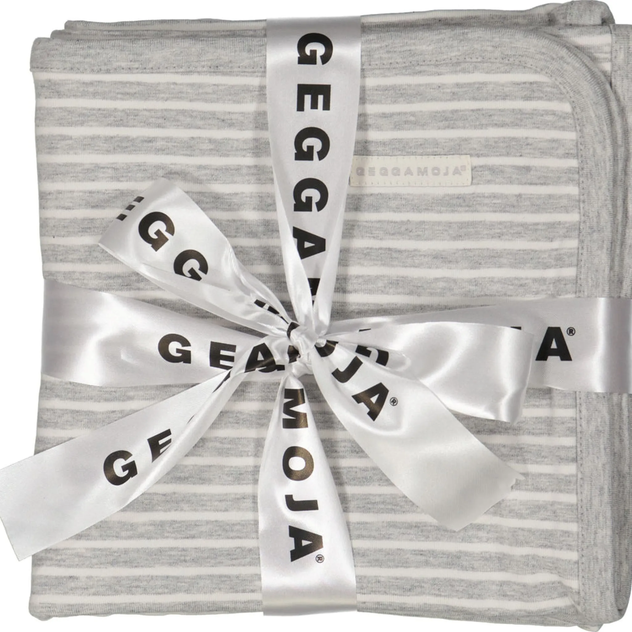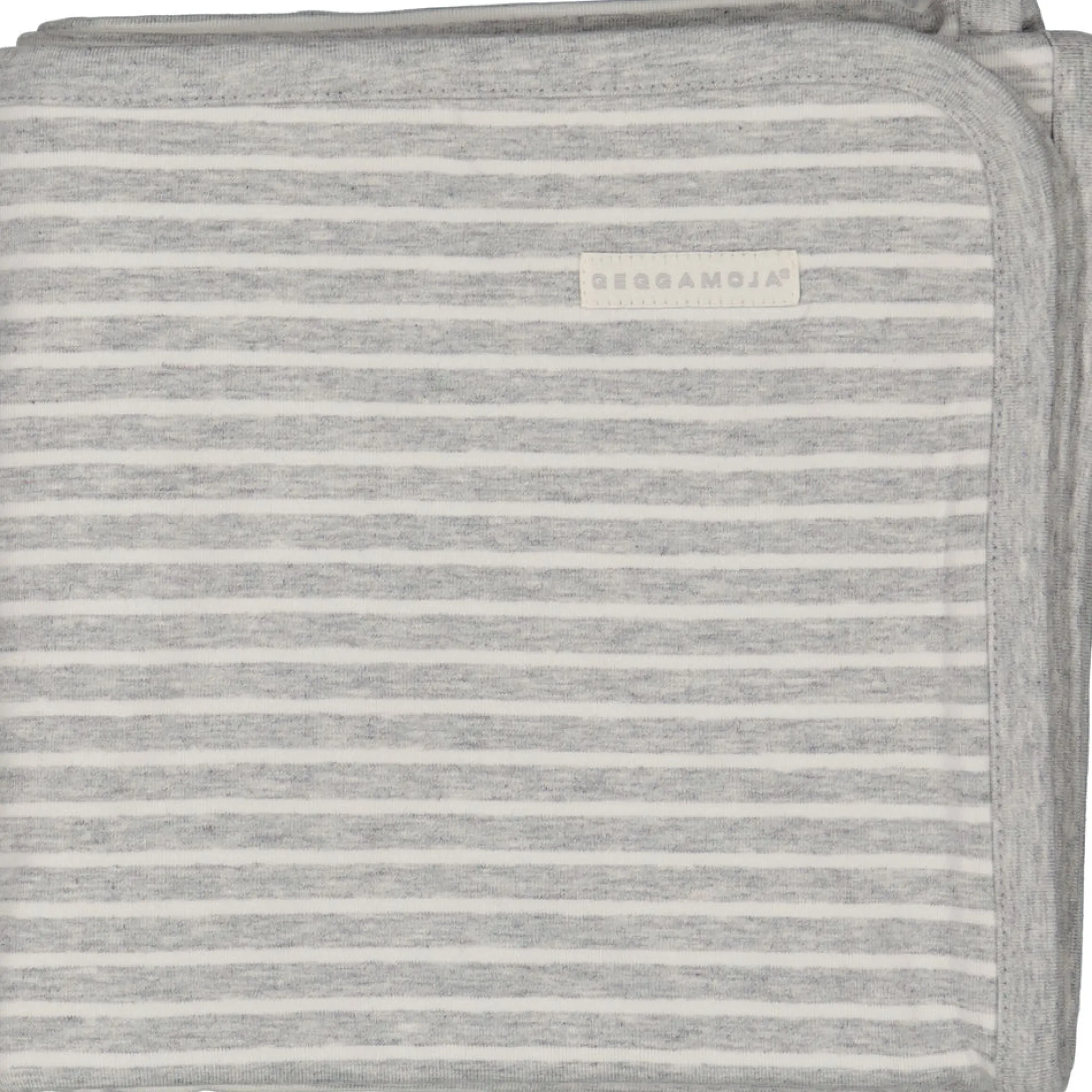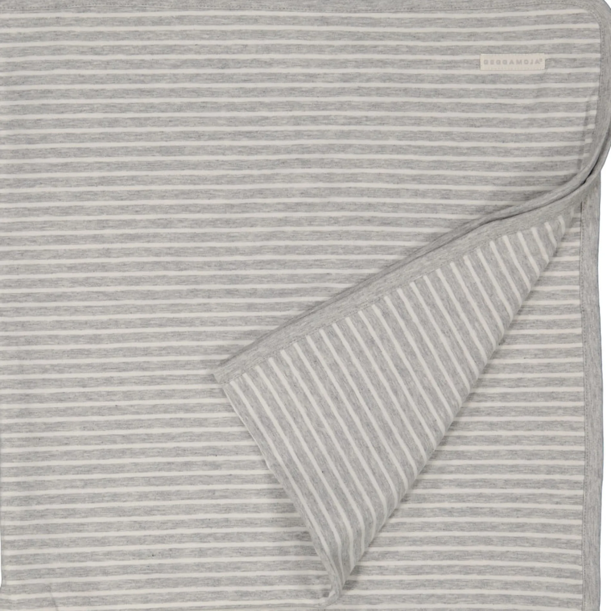 Vår klassiska babyfilt i gråmelerade och vita ränder. En mjuk och skön babyfilt för alla tillfällen i bambu/bomull . Sova, mysa eller på promenaden, blir lätt en favorit. Praktisk napphållare som förhindrar katastrofer om nappen försvinner.
