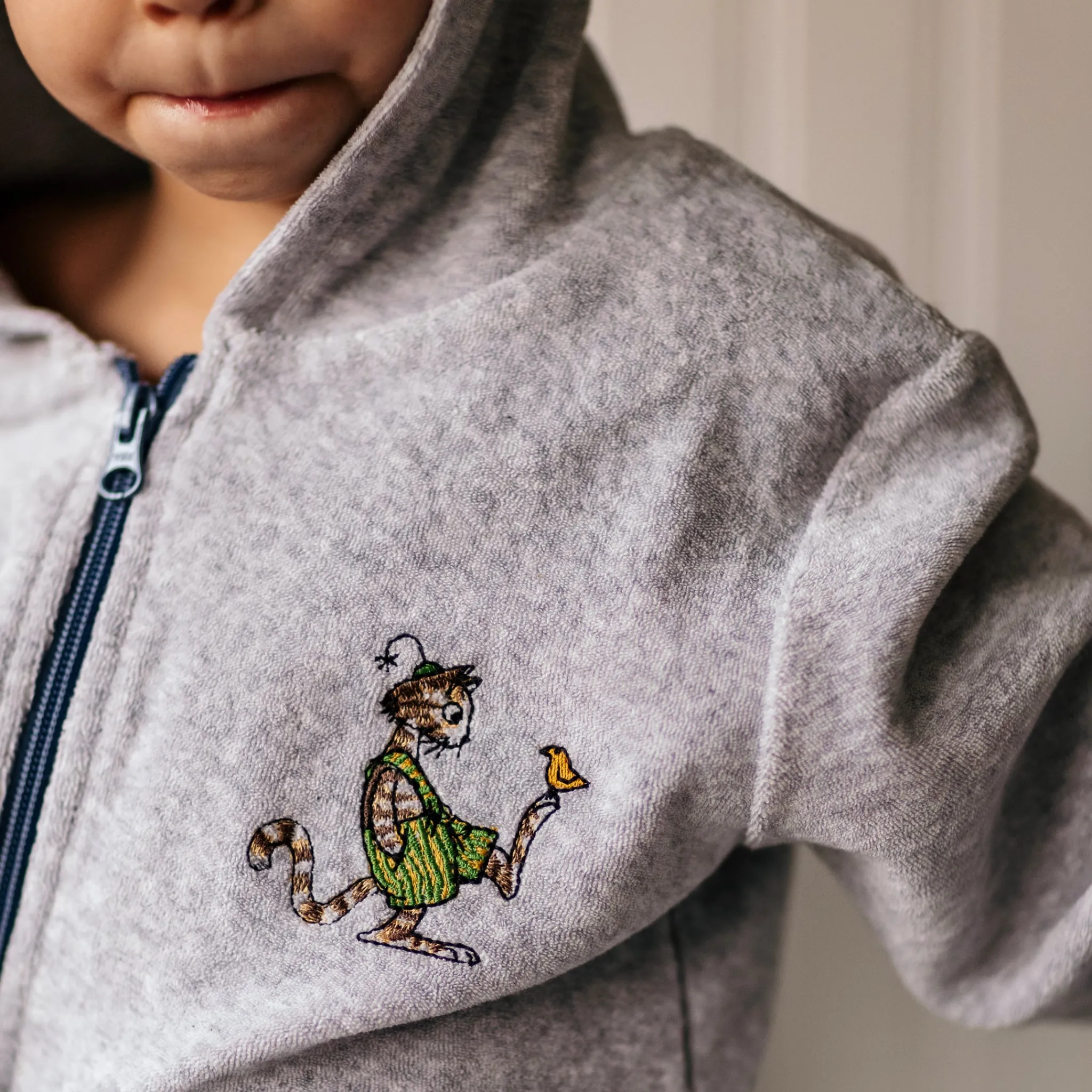 Mjuk och skön badrock i frotté. Brodyr på bröstet. Blixtlås fram, resår bak.