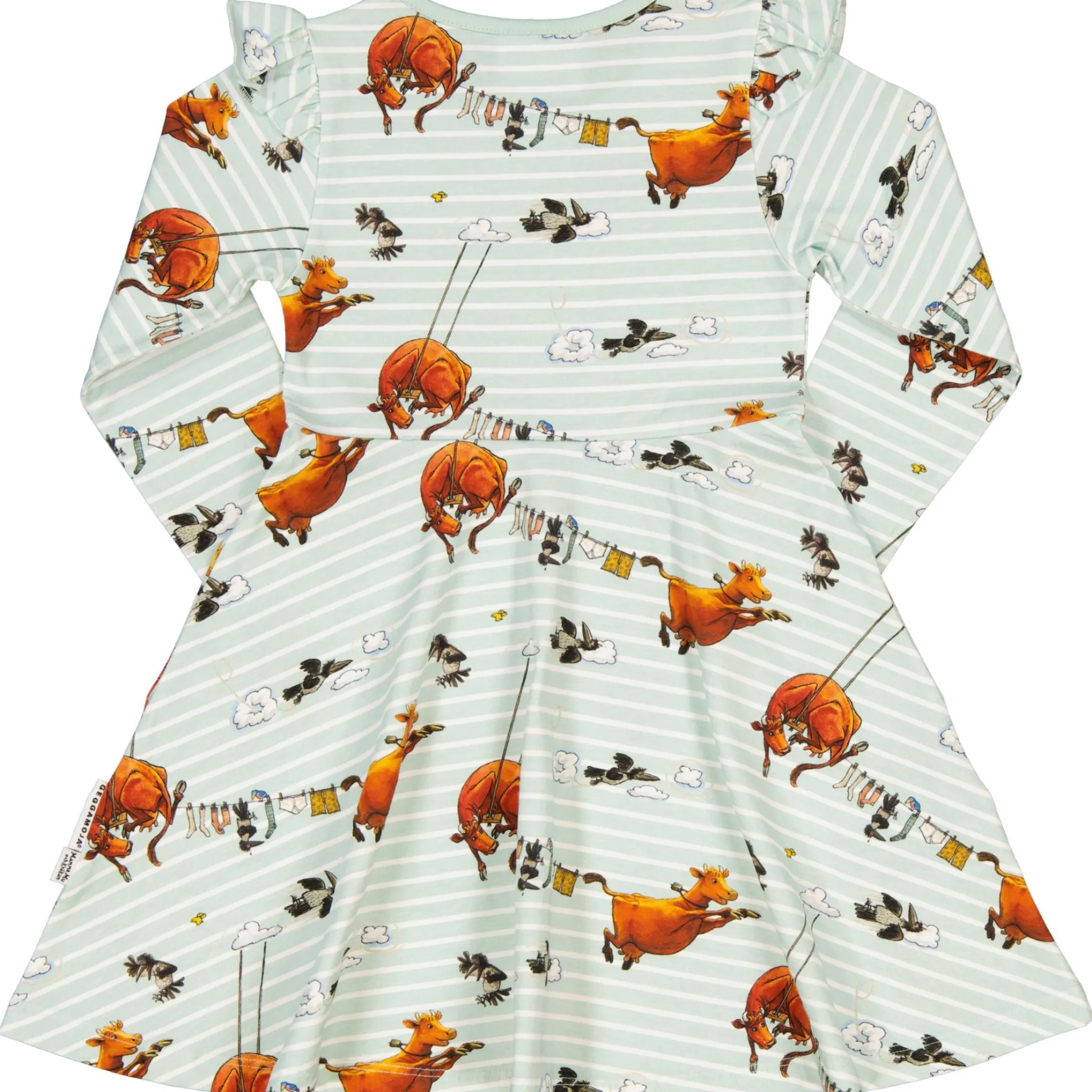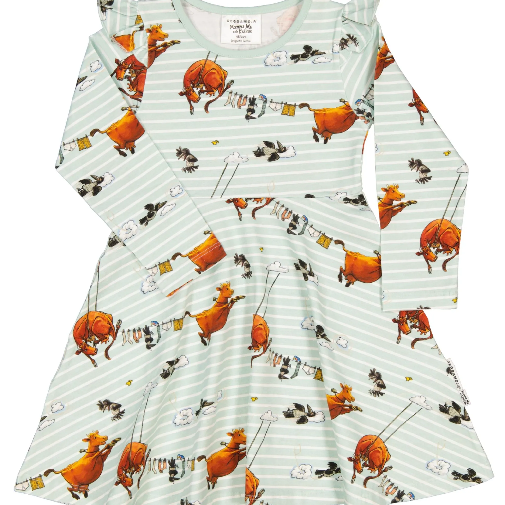 Snurrklänning med Mammu Mu print som är mångas favorit. Den vida kjoldelen gör den tacksam att snurra och dansa i. Klänningen har en liten söt volangdetalj på axlarna.