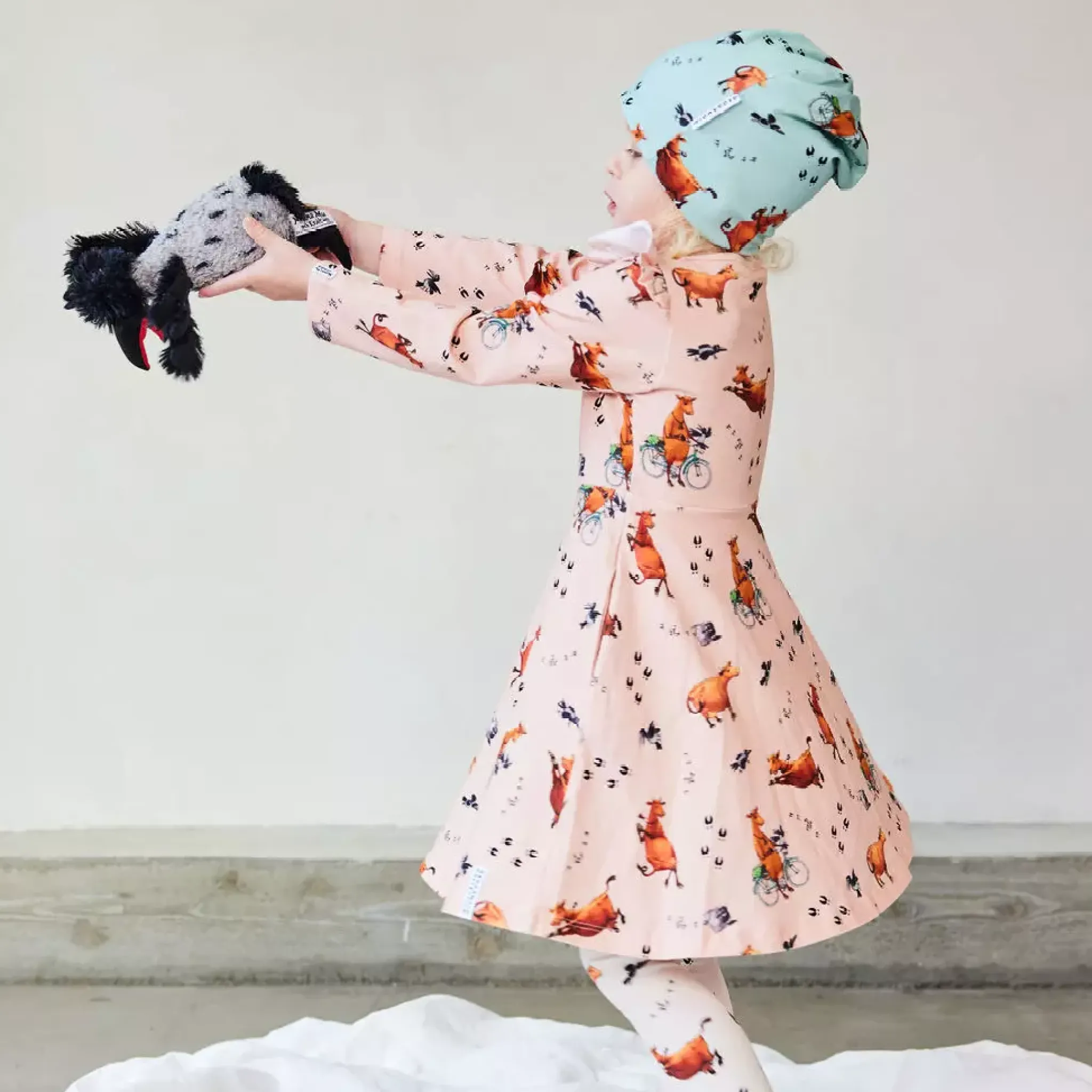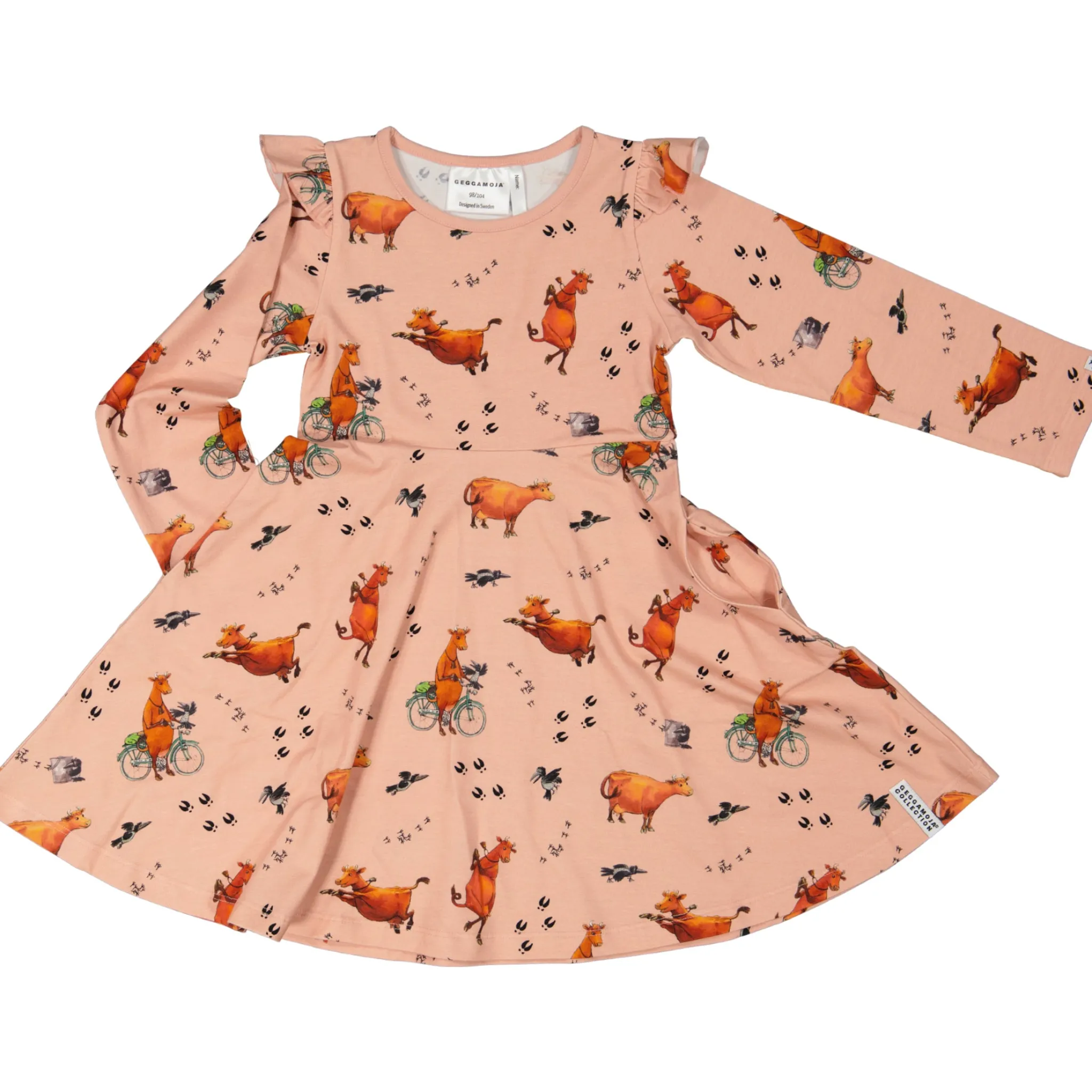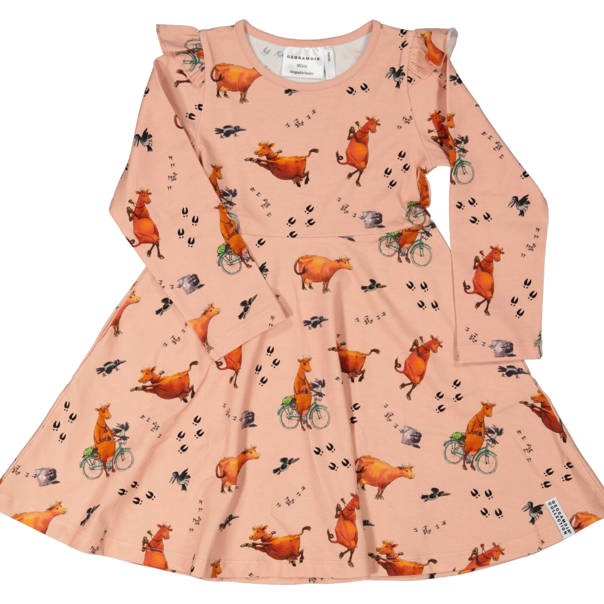 Snurrklänningen med Mammu Mu print som är mångas favorit. Vid kjoldel gör den tacksam att snurra och dansa i. Liten volangdetalj på axlarna.