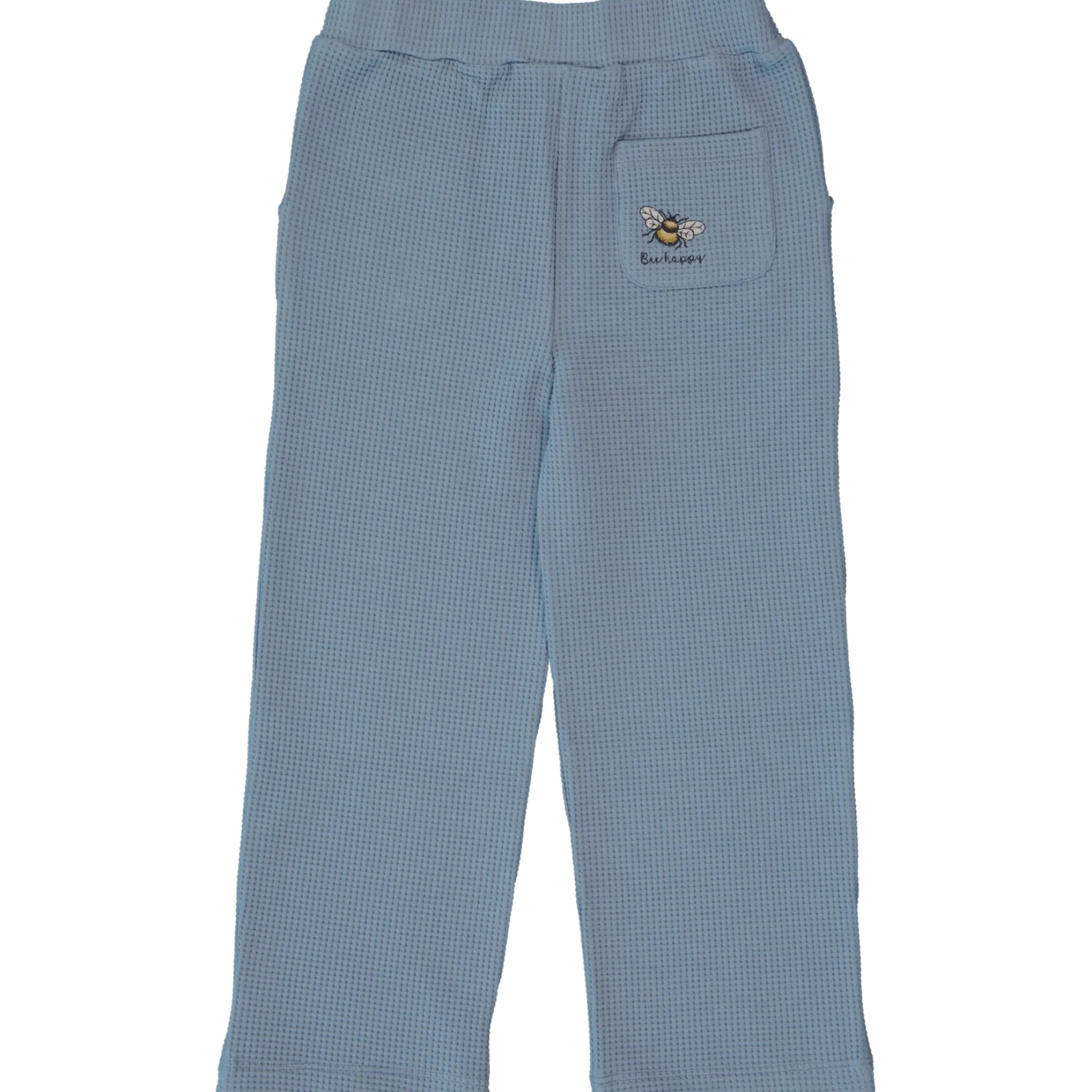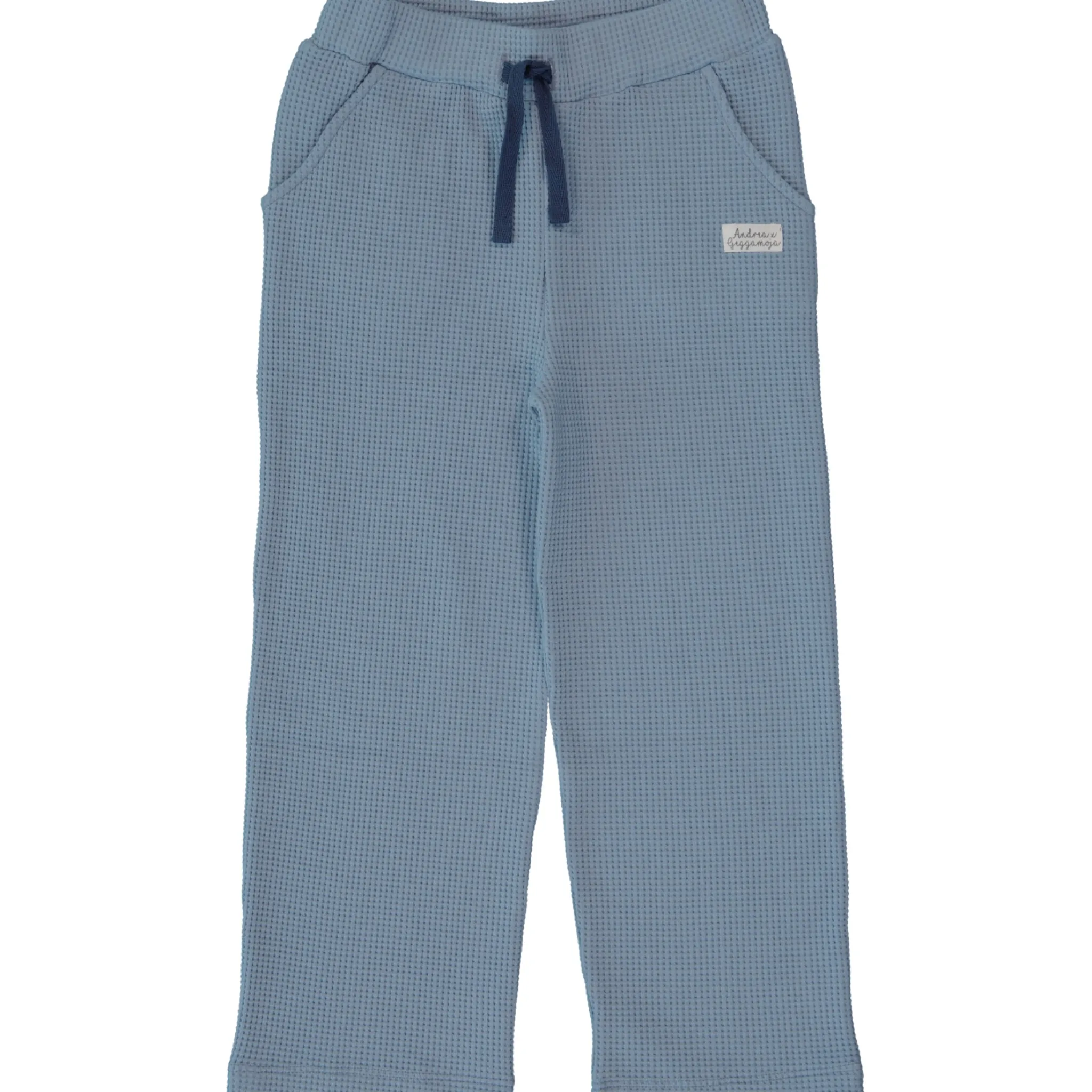 Byxor i blå våfflad ekologisk bomull. Tygets struktur gör att den är mjuk, luftig och skön att bära.