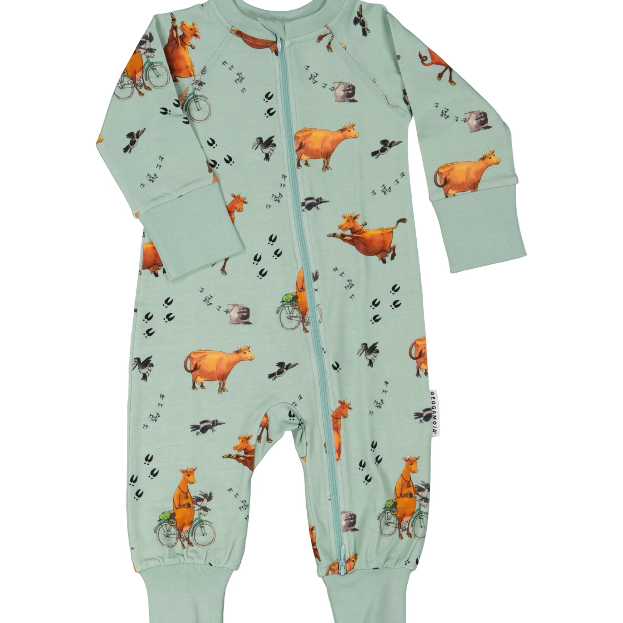Mjuk och skön Mamma Mu pyjamas i Ekologisk -bomull. Pyjamasen har blixtlås fram med skydd så blixlåset inte ligger mot huden. Blixtlåset går att öppna både uppifrån och nerifrån, vilket underlättar snabba blöjbyten på natten. Breda muddar ärm och benslut gör så att pyjamsen kan vikas upp om den är lite stor i från början. Härlig hel pyjamas som inte lämnar glipor.