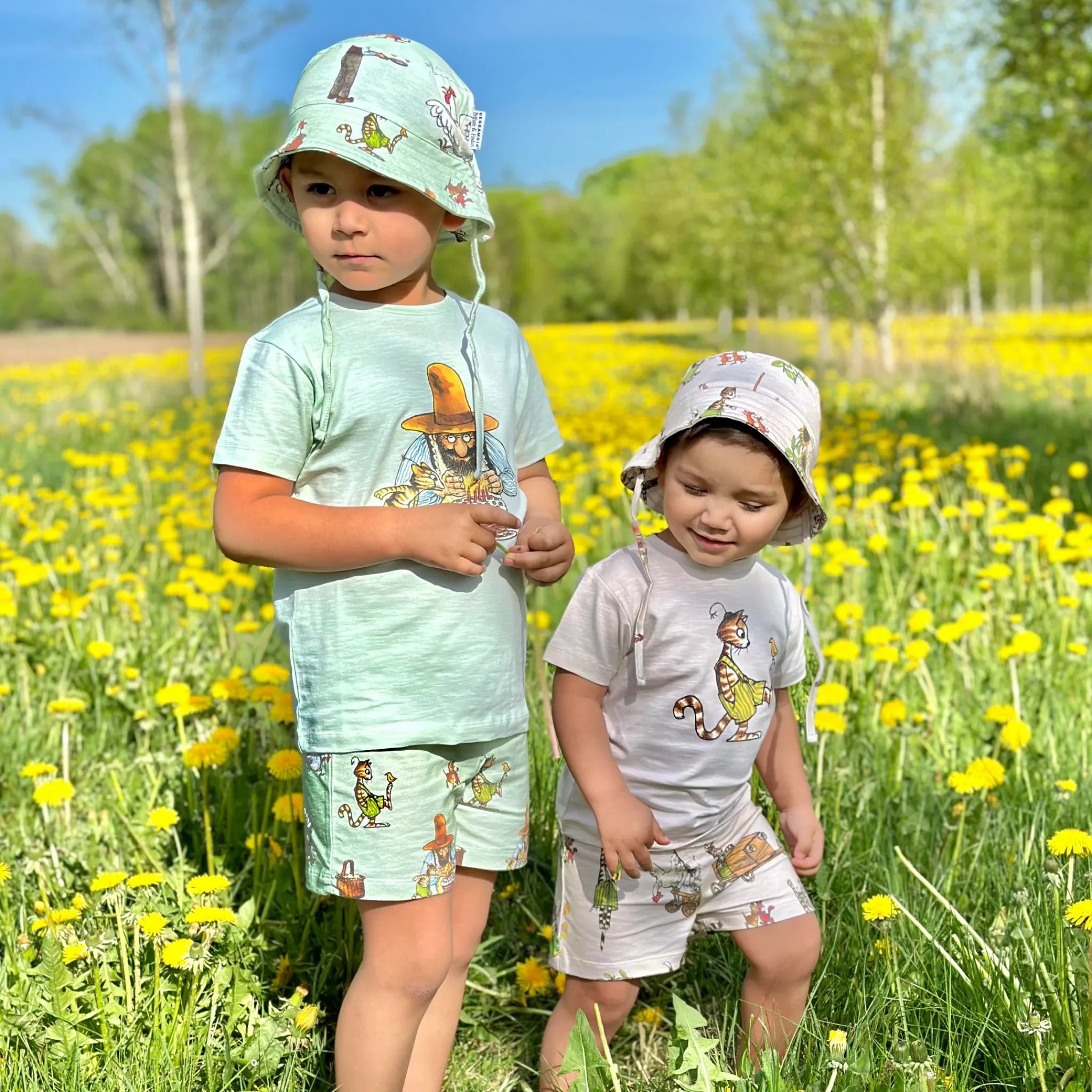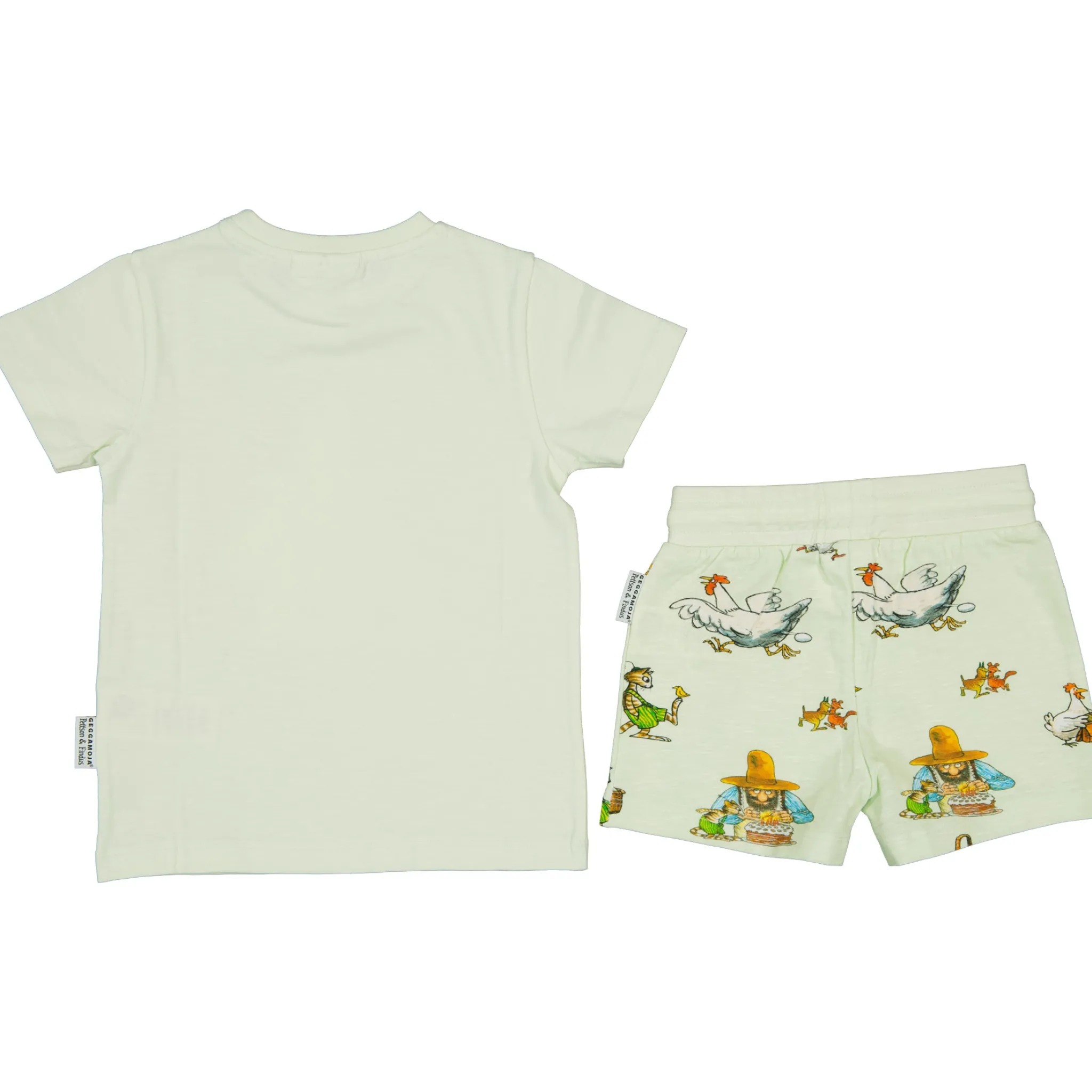 Tvådelad set med Pettson & Findus i mjuk och skön Ekologisk bomulls-slub. Setet består av ett par korta byxor med resår i midjan och en kortärmad tröja. Kan användas som en pyjamas eller som ett härligt set.