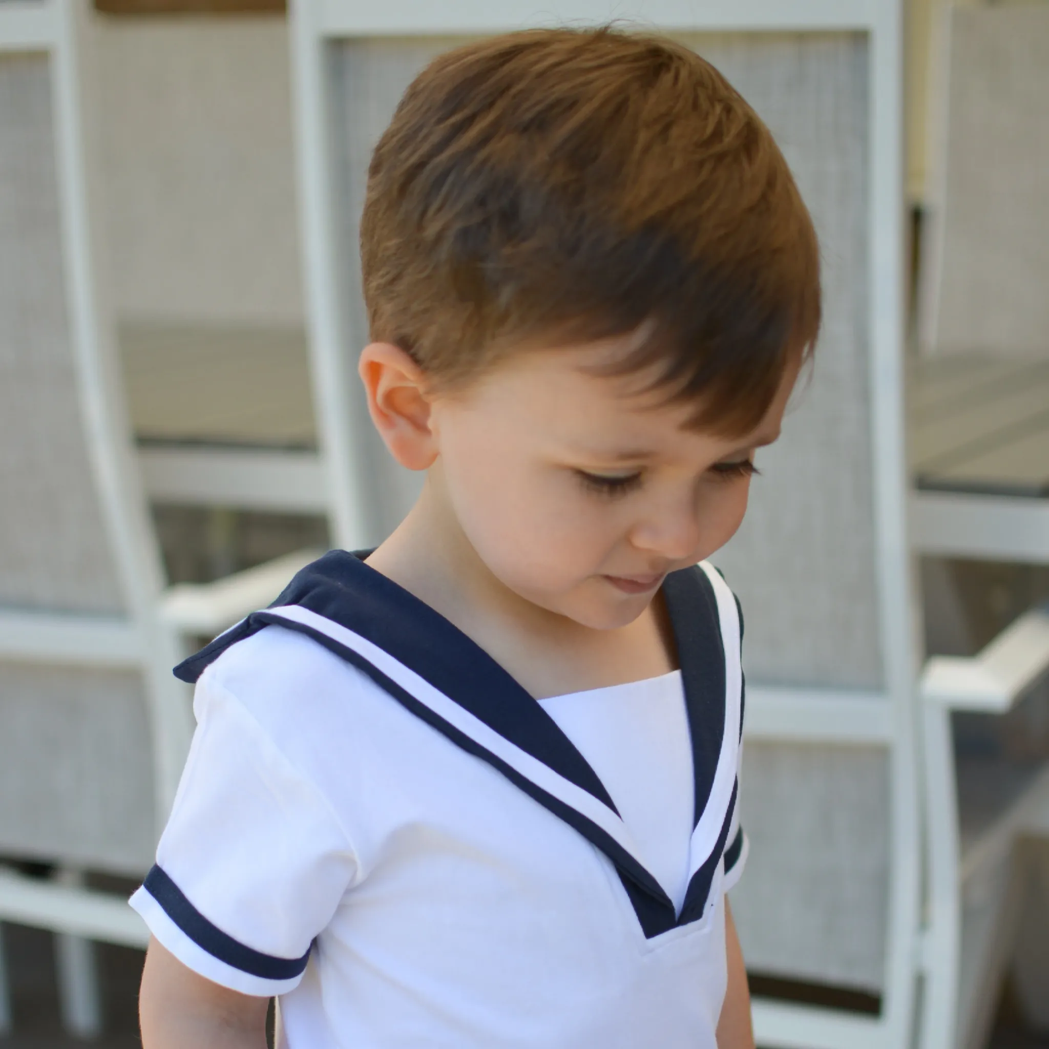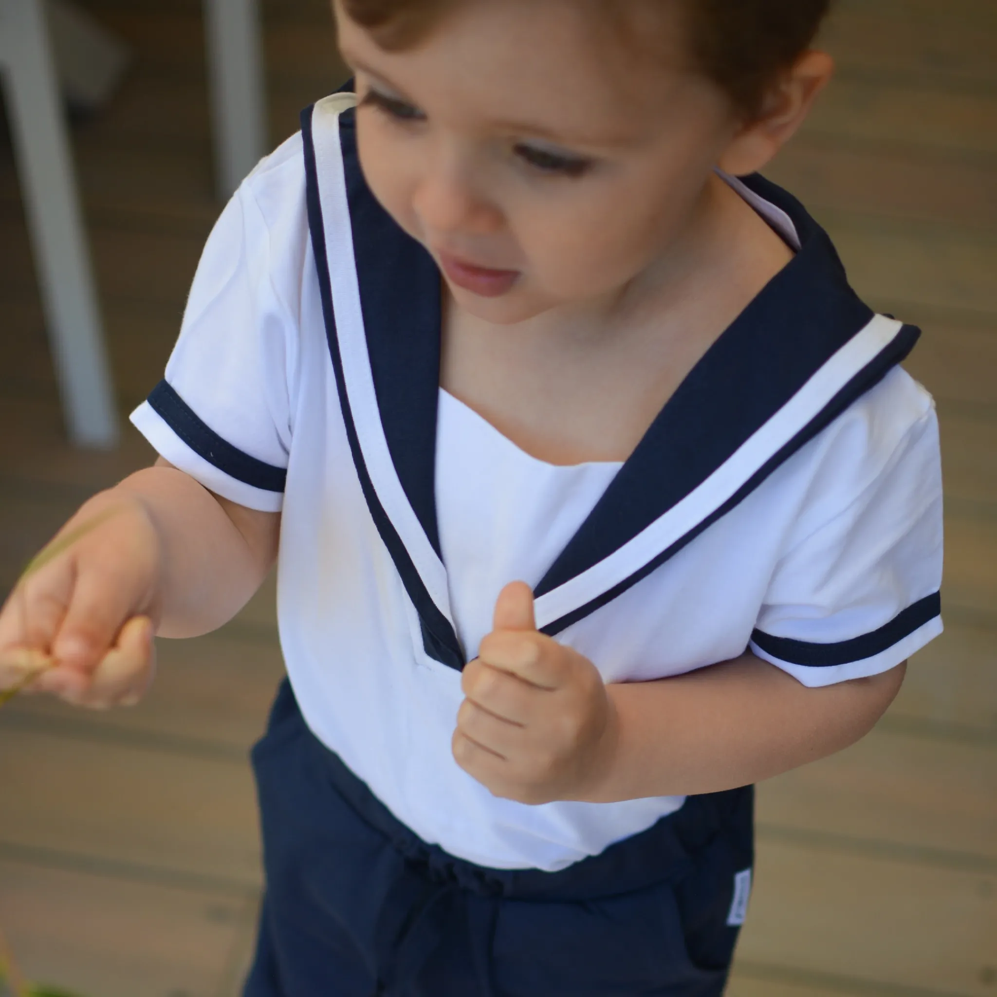 Det perfekta setet för sommaren – inspirerat av marina klassiker. T-shirten har en dekorativ sjömanskrage medan shortsen är svala och sköna med hålresår i midjan. Tillverkad i ekologisk bomull med en gnutta elastan för bästa passform och rörlighet.