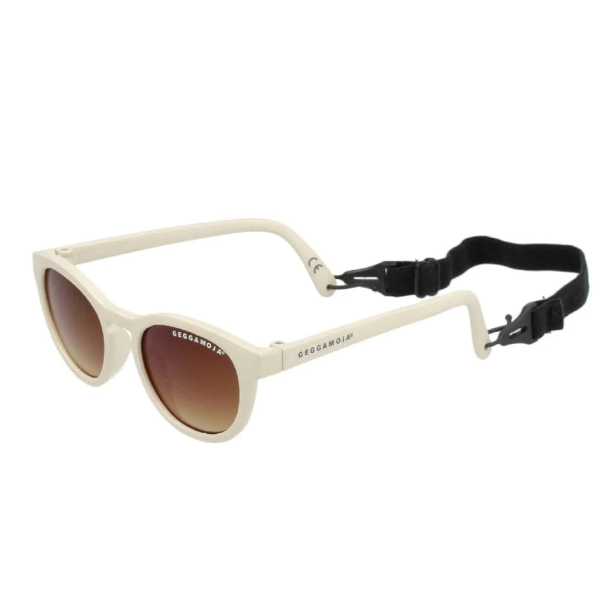 Bekväma och skyddande solglasögon för baby 0–1,5 år i en stilren beige färg. De är designade för att ge små barns känsliga ögon ett effektivt skydd mot starkt solljus under promenader, lek och utflykter.