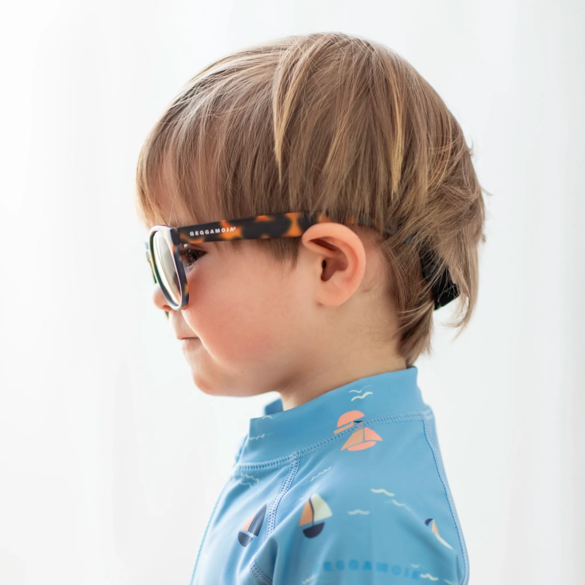 Bågarna är tillverkade i flexibel och BPA-fri plast, vilket gör dem mjuka, lätta och bekväma för små barn att bära. Den reglerbara och avtagbara snodden hjälper solglasögonen att sitta tryggt på plats även när barnet rör sig.