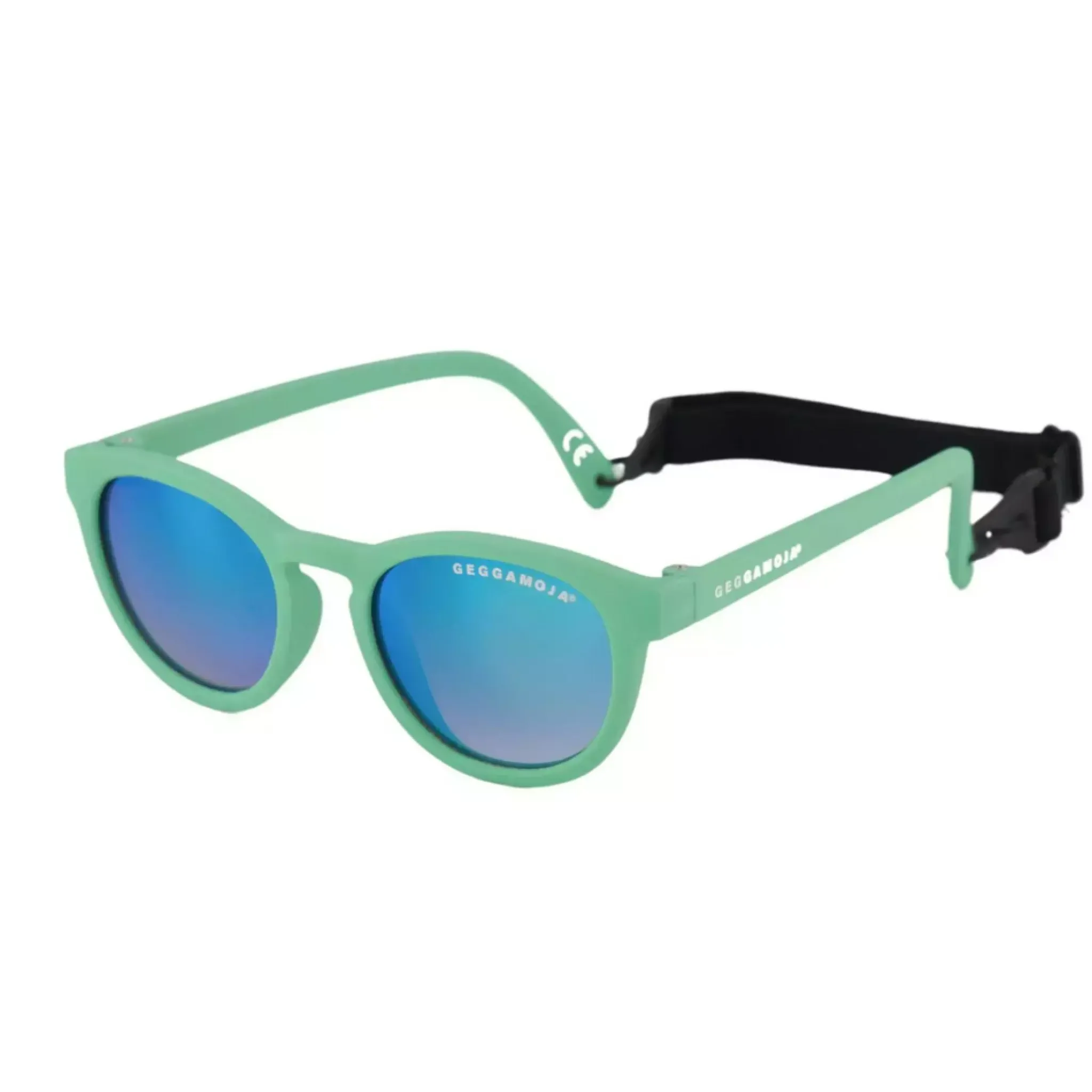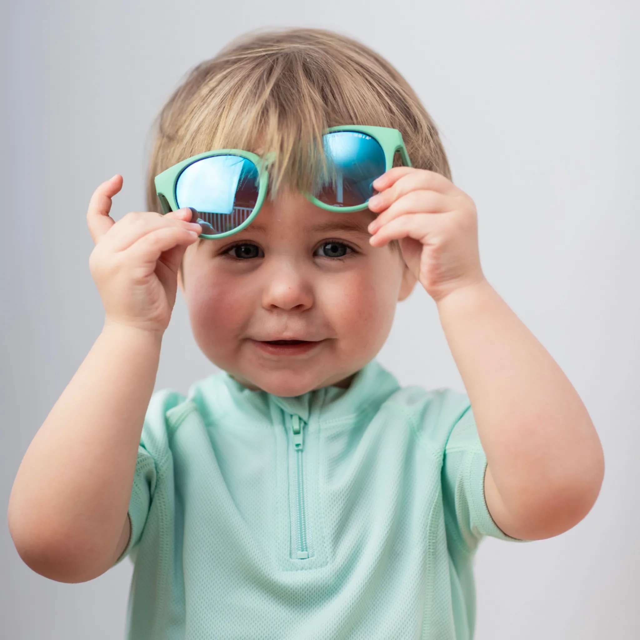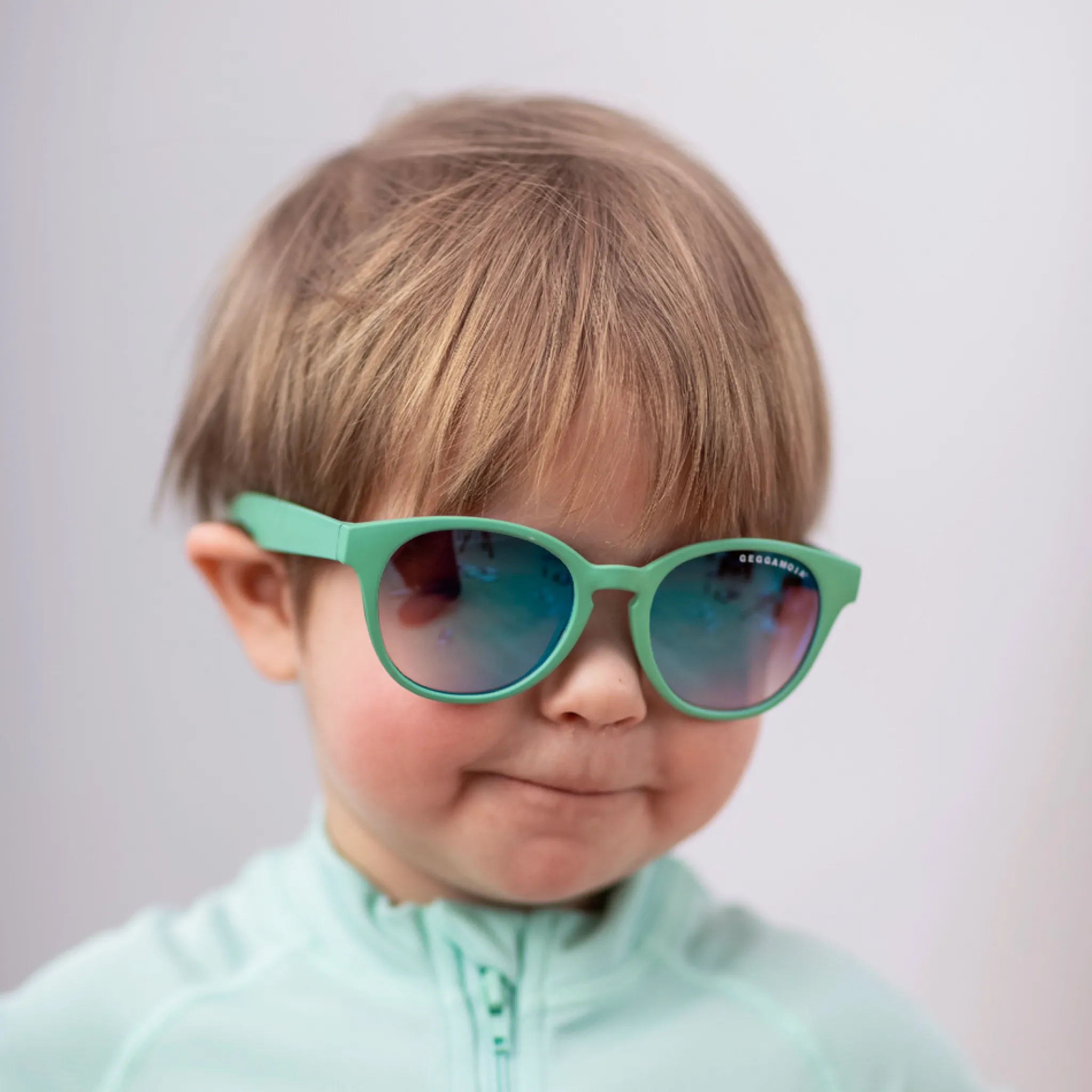Bekväma solglasögon för baby 0–1,5 år i en frisk grön färg. De är framtagna för att skydda små barns känsliga ögon mot starkt solljus och passar bra under promenader, lek och andra stunder utomhus.