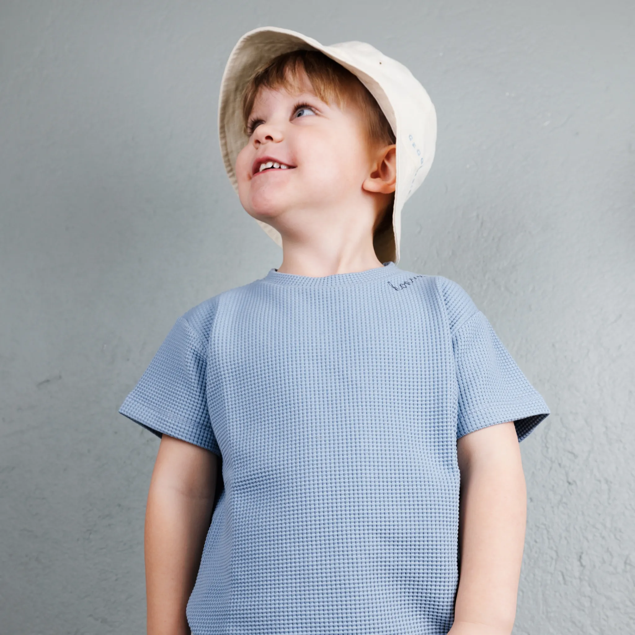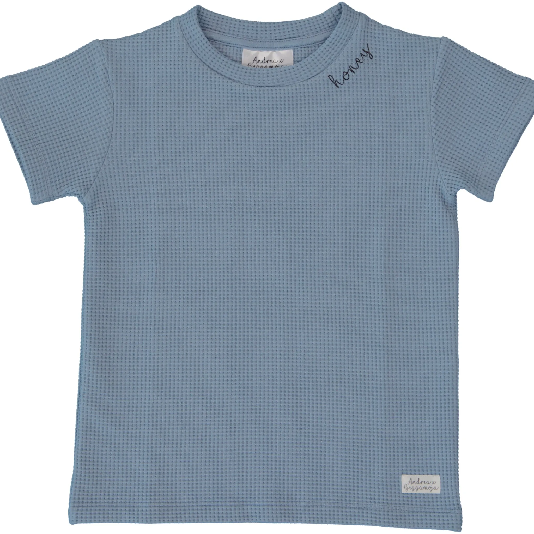 T-shirt i blå våfflad ekologisk bomull. Tygets struktur gör att den är mjuk, luftig och skön att bära.