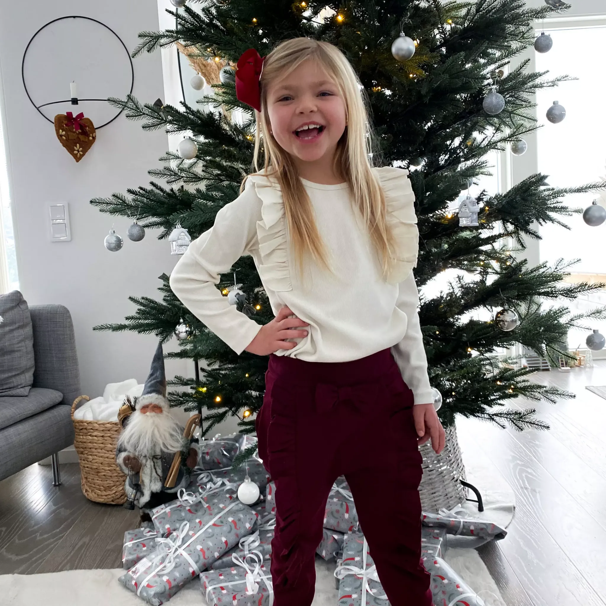 Beige tröja med volanger i skön bomullsribb. Tröjan är långärmad och har volanger vid axlarna. Matcha med leggings, byxor eller kjol och man är redo för vinterns alla fester.
